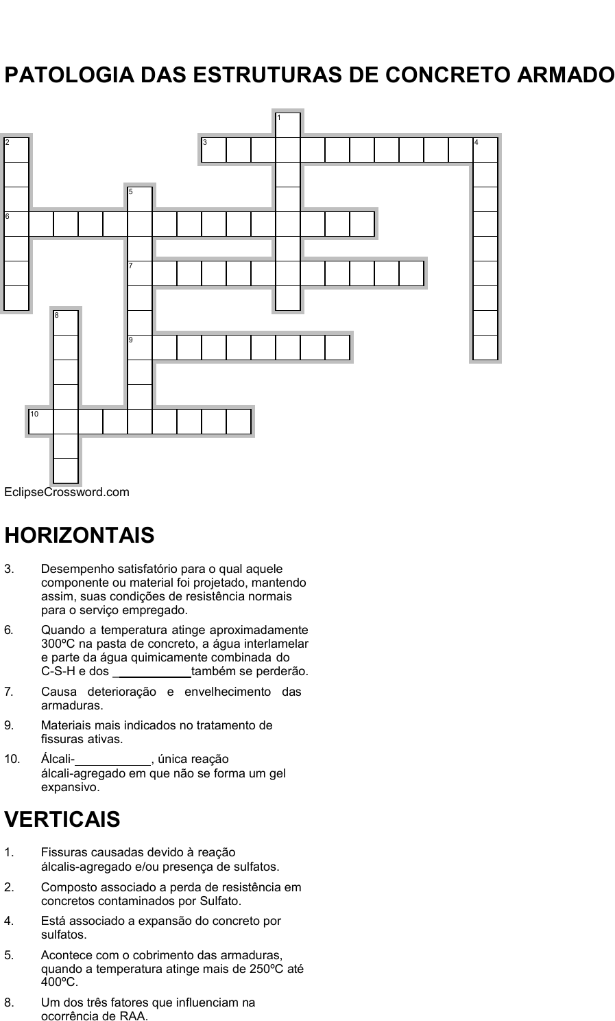 1 2 3 4 5 6 7 8 9 10 PATOLOGIA DAS ESTRUTURAS DE CONCRETO ARMADO EclipseCrossword.com HORIZONTAIS 3. Desempenho satisfatório para o qual aquele componente ou material foi projetado, mantendo assim, suas condições de resistência normais para o serviço empregado. 6. Quando a temperatura atinge aproximadamente 300ºC na pasta de concreto, a água interlamelar e parte da água quimicamente combinada do C-S-H e dos _ também se perderão. 7. Causa deterioração e envelhecimento das armaduras. 9. Materiais mais indicados no tratamento de fissuras ativas. 10. Álcali- , única reação álcali-agregado em que não se forma um gel expansivo. VERTICAIS 1. Fissuras causadas devido à reação álcalis-agregado e/ou presença de sulfatos. 2. Composto associado a perda de resistência em concretos contaminados por Sulfato. 4. Está associado a expansão do concreto por sulfatos. 5. Acontece com o cobrimento das armaduras, quando a temperatura atinge mais de 250ºC até 400ºC. 8. Um dos três fatores que influenciam na ocorrência de RAA. U M I D A D E G A I P T S I U L F O A L U M I N A T O S C R B N A T OO L S C A M E N T A R B O N A T A Ç Ã O D U R A B I L I D A D E A T R I N G I T L Á S T I C O S ALUNA: VALÉRIA ELAYNE CARVALHO DOS SANTOSMaria Eduarda de M. Santos M P E D S