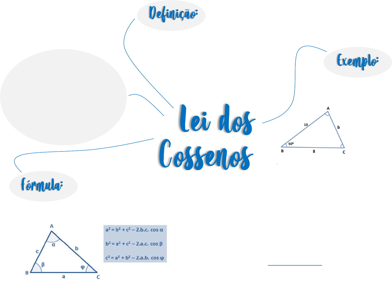 A Lei dos Cossenos é utilizada para calcular a medida de um lado ou de um ângulo desconhecido de um triângulo qualquer, conhecendo suas outras medidas. Em qualquer triângulo, o " quadrado de um dos lados corresponde à soma dos quadrados dos outros dois lados, menos o dobro do produto desses dois lados pelo cosseno do ângulo entre eles." Temos as seguintes relações entre os lados e os ângulos de um triângulo: Determine a medida do lado AC e a medida do ângulo com vértice em A da figura a seguir: 1º, vamos determinar o AC = b: b2 = 82 + 102 – 2 . 8 . 10 . cos 50º b2 = 164 – 160 . cos 50º b2 = 164 – 160 . 0,64279 b ≈ 7,82 2º, vamos determinar a medida do ângulo pela lei dos cossenos: 82 = 102 + 7,822 – 2 . 10 . 7,82 . cos  64 = 161,1524 – 156,4 cos  cos  = 0,62  = 52º Obs: Para encontrar os valores dos ângulos do cosseno utilizamos a Tabela Trigonométrica. Nela, temos os valores dos ângulos de 1º a 90º para cada função trigonométrica (seno, cosseno e tangente). Nathália Souza/ 2º B https://www.todamateria.com.br/tabela-trigonometrica/