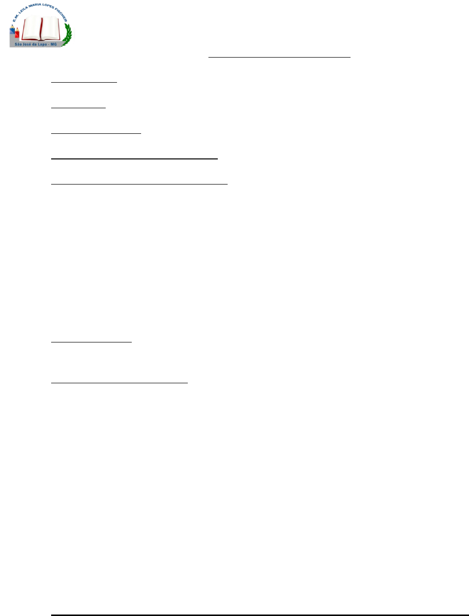 ESCOLA MUNICIPAL “LEILA MARIA LOPES FISCHER” PLANEJAMENTO DIÁRIO SEMANA XI PERÍODO: 20/7/20 A 24/7/20 TEMA DA AULA: Gênero Textual (Música) COMPONENTE CURRICULAR: Língua Portuguesa. OBJETOS DE CONHECIMENTO: · Formação do leitor literário, leitura multissemiótica; · Relato Oral/Relato Formal e Informal; · Construção do Sistema Alfabético e da Ortografia; · Estratégias de Leitura; · Conhecimento do Alfabeto do português do Brasil. HABILIDADES: EF01LP05, EF01LP12, EP15LP13, EP01LP08, EP15LP18, EF01LP10BX, EF01LP04 SITUAÇÕES DIDÁTICAS: - Apresentação do Gênero Textual: Música: O Aniversário do Tatu; - Assistir ao vídeo da música; - Interpretação Oral da música; - Interpretação Escrita da música; - Realizar a família do L; - Reforçar o som nasal; - Introduzir o Conceito de Frase; - Localizar frases escondidas. ESCOLA MUNICIPAL “LEILA MARIA LOPES FISCHER” PLANEJAMENTO DIÁRIO SEMANA XI PERÍODO: 20/7/20 A 24/7/20 TEMA DA AULA: Números Ordinais e Adição. COMPONENTE CURRICULAR: Matemática. OBJETOS DE CONHECIMENTO: · Construção dos fatos básicos da Adição; · Medidas de Tempo: Unidades de Medida de Tempo, suas relações e o uso do calendário; · Leitura e Escrita e Comparação de Números Naturais até 100. HABILIDADES: EF01MA05A, EF01MA06X, EF01MA29MG SITUAÇÕES DIDÁTICAS: - Ler a poesia “Fila do para o cinema”; - Salientar a ordem na fila; - Realizar a tarefa: Ordens; - Fazer as operações de adição. ESCOLA MUNICIPAL “LEILA MARIA LOPES FISCHER” PLANEJAMENTO DIÁRIO SEMANA XI PERÍODO: 20/7/20 A 24/7/20 TEMA DA AULA: Higiene e Saúde. COMPONENTE CURRICULAR: Ciências. OBJETOS DE CONHECIMENTO: · Corpo Humano. Respeito a Diversidade. HABILIDADES: EF01CI02 SITUAÇÕES DIDÁTICAS: - Explicar o que é Higiene e Saúde e sua importância; - Diferenciar Higiene Pessoal X Higiene Coletiva; - Utilizar jornais e revistas para encontrar objetos de higiene; - Ensinar a fazer Pesquisa. ESCOLA MUNICIPAL “LEILA MARIA LOPES FISCHER” PLANEJAMENTO DIÁRIO SEMANA XI PERÍODO: 20/7/20 A 24/7/20 TEMA DA AULA: Álbum Pessoal. COMPONENTE CURRICULAR: Ensino Religioso/Artes. OBJETOS DE CONHECIMENTO: · Memórias e Símbolos; · Contexto e Práticas. HABILIDADES: EF02ER03, EF15AR0P1 SITUAÇÕES DIDÁTICAS: - Confeccionar a Álbum; - Utilizar materiais diversos.