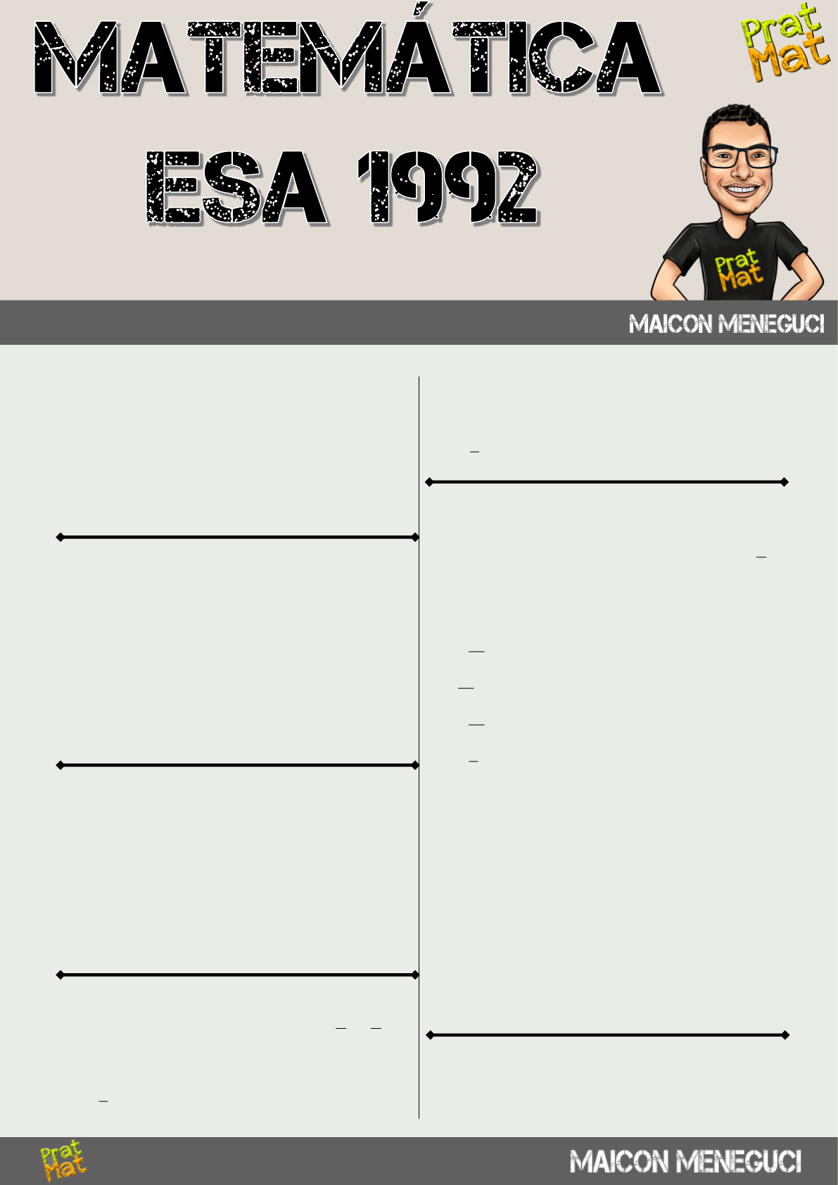 www.praticandomatematica.com 01.(ESA – 1992) Se o número N = 2x . 32 tem 6 divisores, o valor de N é: (A) 1 (B) 2 (C) 9 (D) 18 (E) 72 02.(ESA – 1992) Dois amigos têm juntos 80 selos. O mais velho possui o triplo do mais novo. O mais velho possui: (A) 20 selos (B) 30 selos (C) 40 selos (D) 60 selos (E) 70 selos 03.(ESA – 1992) Dez pessoas realizam um trabalho em 15 dias. Seis pessoas fariam o mesmo trabalho em: (A) 9 dias (B) 10 dias (C) 15 dias (D) 20 dias (E) 25 dias 04.(ESA – 1992) O resultado da expressão - 2 3 2 1 3 2 −+ é: (A) 2 3 − (B) –1 (C) 1 (D) 0 (E) -1 3 2 05.(ESA – 1992) Resolvendo a expressão 0,3 + 5 . − 5 2 + 0,333..., obtemos: (A) -2 (B) 30 41 − (C) 30 79 (D) 30 14 − (E) 3 7 − 06.(ESA – 1992) A forma simplificada da expressão (x – y)2 – (x + y)(x – y) é: (A) –2xy (B) 2x2 – 2xy (C) 2xy (D) y2 – 2xy (E) 2y(y – x) 07.(ESA – 1992) Simplificando a fração 9 96 2 2 − +− x xx , encontramos: (A) 3 3 + − x x (B) 3 2 + − x x (C) x x 3− (D) 1 (F) –1 08.(ESA – 1992) Resolvendo a equação 4 2 1 3 4 = − + − xx , obtemos para o valor de x: (A) 8 (B) 7 (C) 6 (D) 5 (E) 4 09.(ESA – 1992) Simplificando 4520 + , encontra- mos: (A) 3525 + (B) 610 (C) 55 (D) 56 (E) 5− 10.(ESA – 1992) Racionalizando a fração 23 5 + , obte- mos: (A) 10 + 35 (B) 1035 − (C) 35 (D) 35− (E) 3510 − 11.(ESA – 1992) A maior raiz da equação x2 + 9x + 8 = 0 é: (A) 1 (B) 8 (C) 0 (D) –8 (E) –1 12.(ESA – 1992) Sendo m e n raízes da equação x(x – 2) = x + 4, o valor de ( )nm2 é: (A) 16 (B) 8 (C) 1/16 (D) –8 (E) –10 13.(ESA – 1992) Na figura abaixo, o valor de é: (A) 20º (B) 30º (C) 50º (D) 60º (E) 90º 14.(ESA – 1992) Na figura abaixo, o segmento AB mede 14cm e o segmento MN mede 12cm, M é o ponto mé- dio de AB e N é o ponto médio de BC . A medida do segmento AC é: (A) 28 (B) 20 (C) 12 (D) 19 (E) 24 15.(ESA – 1992) O valor de x no triângulo abaixo é: (A) 18º (B) 36º (C) 54º (D) 60º (E) 90º 2x 5x 3x 16.(ESA – 1992) Um homem quer saber a altura de um edifício cuja sombra num determinado momento mede 30m. Sabendo-se que, nesse mesmo momento, esse ho- mem de 1,20m tem sua sombra de 40cm, podemos ga- rantir que o edifício mede: (A) 10m (B) 20m (C) 50m (D) 60m (E) 90m 17.(ESA – 1992) Calculando x e y na figura abaixo obte- mos, respectivamente: (A) 13 e 6 (B) 15 e 3 (C) 13 e 4 (D) 13 e 3 (E) 20 e 3 18.(ESA – 1992) A área, em cm2, de um losango de perí- metro 40cm e que possui uma das diagonais medindo 16cm mede: (A) 10 (B) 48 (C) 96 (D) 160 (E) 640 19.(ESA – 1992) O apótema de um hexágono regular de lado 4m mede: (A) 4m (B) 4 3 m (C) 2 3 m (D) 8 3 m (E) 2 m 20.(ESA – 1992) A área da figura a seguir é: (A) 29 (B) 37 (C) 22 (D) 55 (E) 30 GABARITO 01 → D 11 → E 02 → D 12 → C 03 → E 13 → C 04 → B 14 → E 05 → B 15 → A 06 → E 16 → E 07 → A 17 → D 08 → B 18 → C 09 → C 19 → C 10 → E 20 → B Inscreva-se no canal do Youtube para ajudar meu trabalho 2 3 4 5 5 12 4 y x 5 https://www.youtube.com/channel/UCw1x5GDOQsQ9yVrpTrKYxHg?view_as=subscriber