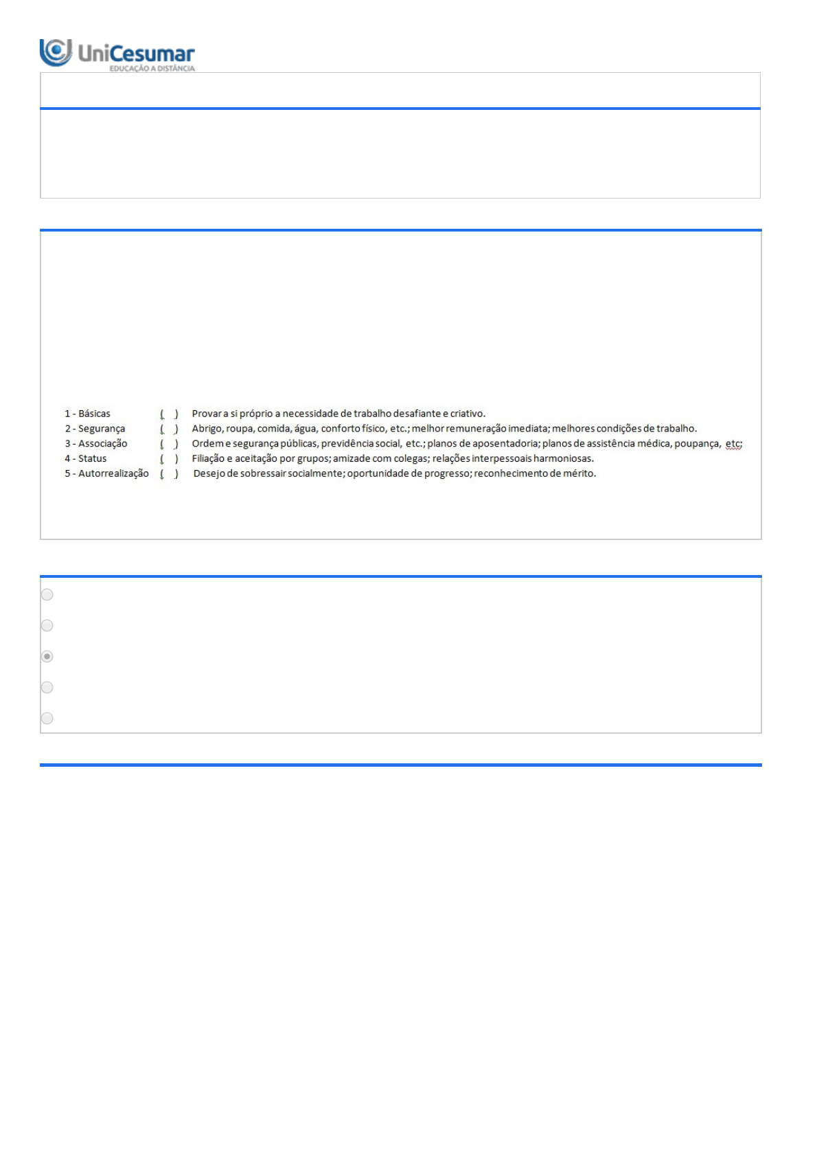 14/04/2020 Unicesumar - Ensino a Distância 1/7 ATIVIDADE 3 - SER - MOTIVAÇÃO DE INDIVÍDUOS E GRUPOS DE TRABALHO - 2020A1 Período:30/03/2020 08:00 a 17/04/2020 23:59 (Horário de Brasília) Status:ABERTO Nota máxima:0,50 Gabarito:Gabarito será liberado no dia 18/04/2020 00:00 (Horário de Brasília) Nota obtida: 1ª QUESTÃO A famosa hierarquia de necessidades de Maslow, proposta pelo psicólogo clínico americano Abraham H. Maslow, baseia-se na idéia de que cada ser humano esforça-se muito para satisfazer suas necessidades pessoais e profissionais, esta vontade de satisfazê-la é que gera o esforço. PEREIRA, Luciano Santana. Motivação de Indivíduos e Grupos de Trabalho. Maringá-Pr.:Unicesumar, 2018. Considerando a hierarquia de necessidades de Maslow, associe as duas colunas: A sequência Correta é: ALTERNATIVAS 1, 2, 3, 4 e 5 2, 4, 3, 1 e 5. 5, 1, 2, 3 e 4. 4, 1, 2, 3 e 5. 5, 4, 3, 2 e 1. 2ª QUESTÃO 14/04/2020 Unicesumar - Ensino a Distância 2/7 Todas as equipes são grupos, porém nem todos os grupos são equipes. As equipes se diferenciam dos grupos por vários aspectos distintos, pois são grupos que passaram por diferentes estágios e atingiram certa maturidade, de forma que conseguem superar as diferenças individuais e priorizam o resultado do coletivo. Por isso, o desempenho da equipe é influenciado por diferentes fatores. Considerando esse assunto, a seguir, avalie leia as afirmativas a seguir: PEREIRA, Luciano Santana. Motivação de Indivíduos e Grupos de Trabalho. Maringá-Pr.: UniCesumar, 2018. I. As equipes apresentam alto nível de formalização, rápida formação e lenta dissolução, a meta é a troca de ideias, as atividades entre os membros são complementares. II. As equipes se diferenciam dos grupos por terem metas de desempenho coletivo, apresentar sinergia positiva, possuir responsabilidades individuais e coletivas, por utilizar de habilidades complementares. III. Os aspectos que diferenciam as equipes dos grupos são compartilhamento rápido de informações, as responsabilidades individuais bem definidas, prioridade em manter o status e a amizade, habilidades individuais variadas. IV. A equipe se caracteriza pela sua motivação, coesão e seu espírito de equipe que se designa à disposição das pessoas no sentido de colaborarem umas com as outras na construção do resultado coletivo. É correto o que se afirma em: ALTERNATIVAS I e II, apenas. II e IV, apenas. I, II e III, apenas. I, II e IV, apenas. II, III e IV, apenas. 3ª QUESTÃO O profissional de serviço social e todos os outros profissionais envolvidos na organização necessitam trabalhar em grupo. Ao se abordar sobre o trabalho de grupo, Robbins (2000) define como a interação entre pessoas que compartilham informações e tomam decisões com o objetivo de se ajudarem no desempenho em sua área de responsabilidade. Estas pessoas podem estar próximas fisicamente ou não, mas terão objetivo em comum. PEREIRA, Luciano Santana. Motivação de Indivíduos e Grupos de Trabalho. Maringá-Pr.: UniCesumar, 2018. Assim, sobre o trabalho de grupo assinale a alternativa correta: ALTERNATIVAS 14/04/2020 Unicesumar - Ensino a Distância 3/7 Na coordenação de um trabalho de grupo é necessário além de direcionar as atividades das pessoas, coordenar as interações dentro do grupo, uma vez que o comportamento das pessoas é o segredo do sucesso ou fracasso do grupo. A formação de um grupo informal na organização não deve ser levada em consideração pelos gestores uma vez que seu surgimento não possui impactos no comportamento das pessoas, pois não foi criado pela organização. O trabalho de grupo na organização é criado pela organização com tarefas específicas e não são escolhidos pelos membros do grupo seus participantes. Deste modo, este grupo formal deve fazer parte da estrutura formal da organização. O profissional de serviço social deve levar em consideração apenas a mecânica dos grupos formais e o quanto isso representa para o sucesso de seu trabalho. Já os grupos informais não necessitam ser levados em consideração uma vez que não foram organizados pela organização. As organizações são formadas por grupos e cada grupo é formado por pessoas que podem entrar em conflito. Deste modo, quando isto ocorre sempre será negativo, prejudicial e deve ser evitado para não enfraquecer o grupo. 4ª QUESTÃO A atuação do assistente social, em equipes multidisciplinares, tem sido cada vez mais frequente e, com isso, o desafio diário de demonstrar aos membros das equipes a forma, a função e o lugar da assistência social enquanto política pública destinada a quem dela mais necessitar. Diante disso, é imprescindível compreender que, no trabalho em equipe, além de estarem comprometidas com um objetivo comum, as pessoas atuam de forma bastante interdependente, procurando colocar os objetivos do grupo acima dos seus interesses pessoais, ou seja, o objetivo torna-se o foco da equipe, que toma as decisões e conduz todas as ações necessárias para sua realização. Tipicamente as equipes são grupos caracterizados por três importantes determinantes. Sobre esses determinantes, analise as afirmativas: Disponível: <https://www.cress-mg.org.br/hotsites/Upload/Pics/39/397c4d3e-111c-4e38-bf90- ce85f5c44b4b.pdf>. Acesso em: 08 mar. 2018 (adaptado). PEREIRA, Luciano Santana. Motivação de Indivíduos e Grupos de Trabalho. Maringá-Pr.: UniCesumar, 2018. I. Os membros das equipes devem apresentar capacidade técnica ou funcional para realizar as funções, aptidões, conhecimento, experiência e informação. II. As capacidades e habilidades se distribuem de forma igual entre os membros de uma equipe, devido a treinamento, talentos e acesso à recursos. III. As equipes são formadas mediante o uso de agrupamento por fluxo de trabalho, de modo que seus membros são responsáveis pelo desempenho de diversas funções diferentes. IV. Os membros das equipes necessi