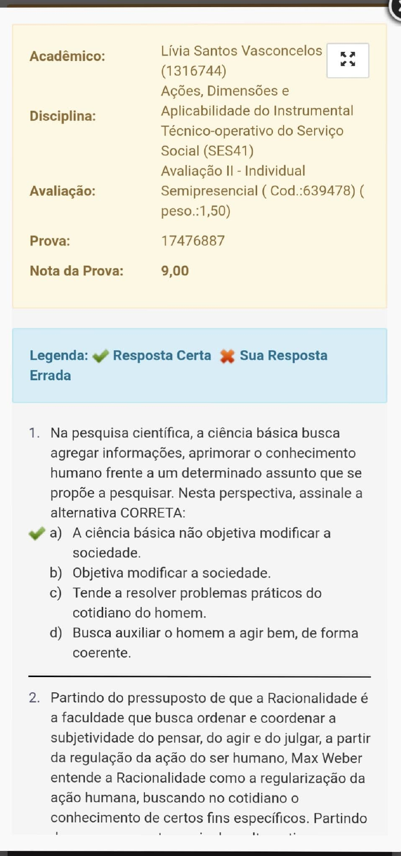 Acadêmico: Disciplina: Avaliação: Prova: Nota da Prova: Lívia Santos Vasconcelos (1316744) Ações, Dimensões e Aplicabilidade do Instrumental Técnico-operativo do Serviço Social (SES41) Avaliação li - Individual Semipresencial ( Cod.:639478) ( peso.:1,50) 17476887 9,00 Legenda: .., Resposta Certa ~ Sua Resposta Errada 1. Na pesquisa científica, a ciência básica busca agregar informações, aprimorar o conhecimento humano frente a um determinado assunto que se propõe a pesquisar. Nesta perspectiva, assinale a alternativa CORRETA: v a) A ciência básica não objetiva modificar a sociedade. b) Objetiva modificar a sociedade. c) Tende a resolver problemas práticos do cotidiano do homem. d) Busca auxiliar o homem a agir bem, de forma coerente. 2. Partindo do pressuposto de que a Racionalidade é a faculdade que busca ordenar e coordenar a subjetividade do pensar, do agir e do julgar, a partir da regulação da ação do ser humano, Max Weber entende a Racionalidade como a regularização da ação humana, buscando no cotidiano o conhecimento de certos fins específicos. Partindo • 1 1 1 5. A competência relacional do profissional de Serviço Social refere-se à capacidade de ser potencializada através do contexto da práxis nas relações sociais. Ela se direciona em qualquer espaço institucional, sendo o norte de todo o processo de trabalho do assistente social. A partir desse pressuposto, analise as sentenças a seguir: 1- O profissional de Serviço Social necessita no seu cotidiano de trabalho exercitar suas habilidades para o melhor desempenho de suas funções junto à questão social. li- O profissional de Serviço Social delimitará sua competência a partir de suas habilidades, das atitudes, ou seja, seu conhecimento junto às demandas sociais. Ili- O profissional de Serviço Social deve considerar apenas as habilidades na realização das tarefas executadas no processo de trabalho na sociedade. IV- O profissional de Serviço Social, para compreender a competência relacional, necessita compreender e interferir no contexto social as dificuldades do sujeito. Assinale a alternativa CORRETA: .,, a) As sentenças I e li estão corretas. b) As sentenças 1, li e Ili estão corretas. c) As sentenças 1, Ili e IV estão corretas. d) As sentenças 111 e IV estão corretas. 6. O assistente social, ao compreender a realidade através das expressões da questão social, desenvolve sua prática, baseando-se na intencionalidade, a qual possibilita novas oportunidades de transformação e autonomia do exercício profissional. A partir desse pressuposto, classifique V para as sentenças verdadeiras e F para as falsas: 4. O trabalhador, ao vender a força de trabalho, com o objetivo de manter a sua subsistência e de sua família, recebe em troca como produto desta venda um salário. Nesta perspectiva, assinale a alternativa CORRETA: a) Os objetos e as mercadorias produzidos através da força de trabalho são revertidos em riquezas ao trabalhador. ~ b) No processo de produção, o trabalhador apresenta-se como mera força de trabalho, servindo de mecanismo pessoal de riqueza a terceiros. c) A força de trabalho para o trabalhador transforma-se em capital real, pois em seu valor de uso está agregado a mais-valia, responsável pela geração de riquezas ao trabalhador. d) O capitalismo consome a força de trabalho e, neste processo, os meios de produção pertencem ao trabalhador. 5. A competência relacional do profissional de Serviço Social refere-se à capacidade de ser potencializada através do contexto da práxis nas relações sociais. Ela se direciona em qualquer espaço institucional, sendo o norte de todo o processo de trabalho do assistente social. A partir desse pressuposto, analise as sentenças a seguir: 1- O profissional de Serviço Social necessita no seu cotidiano de trabalho exercitar suas habilidades para o melhor desempenho de suas funções junto à questão social. li- O profissional de Serviço Social delimitará sua competência a partir de suas habilidades, das atitudes, ou seja, seu conhecimento junto às demandas sociais. Ili- O profissional de Serviço Social deve considerar apenas as habilidades na realização das tarefas executadas no processo de trabalho 2. Partindo do pressuposto de que a Racionalidade é a faculdade que busca ordenar e coordenar a subjetividade do pensar, do agir e do julgar, a partir da regulação da ação do ser humano, Max Weber entende a Racionalidade como a regularização da ação humana, buscando no cotidiano o conhecimento de certos fins específicos. Partindo desse pressuposto, assinale a alternativa CORRETA: ~ a) A Racionalidade é desenvolvida quando o homem, sujeito do conhecimento, busca controlar a natureza e o próprio homem. Usa os meios para a obtenção dos fins. b) A Racionalidade se contrapõe à razão crítica e reflexiva dos acontecimentos do cotidiano. c) A Racionalidade busca a desmistificação de tudo o que existe e acontece no mundo do ser humano. d) A Racionalidade torna-se a base do conhecimento da razão humana. Neste sentido, o mundo é considerado um mistério. 3. A instrumentalidade do Serviço Social favorece a transformação da intencionalidade em respostas profissionais, as quais podem modificar e transformar relações e a realidade posta. Nesta perspectiva, assinale a alternativa CORRETA: a) A instrumentalidade do Serviço Social constitui-se em bases a-históricas e por perspectivas teórico-empíricas. b) A intencionalidade do agir profissional ocorre exclusivamente no momento da intervenção. c) Na intervenção, a dinâmica da realidade vigente recebe pouca atenção, pois representa parte irrelevante no campo da instrumentalidade. ~ d) A instrumentalidade é construída e adquirida na proporção que são concretizados os objetivos. 6. O assistente social, ao compreender a realidade através das expressões da questão social, desenvolve sua prática, baseando-se na intencionalida