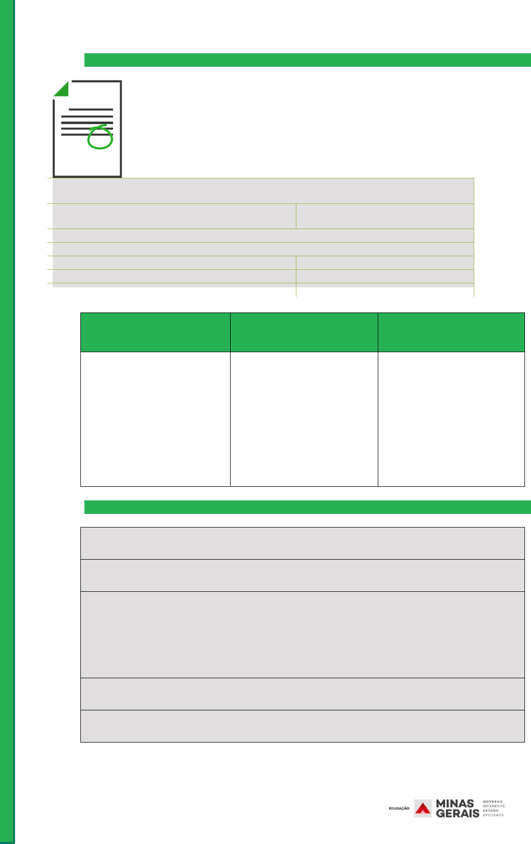 SECRETARIA DE ESTADO DE EDUCAÇÃO DE MINAS GERAIS ( PLANO DE ESTUDO TUTORADO COMPONENTE CURRICULAR: Português COMPONENTE CURRICULAR: Português NOME DA ESCOLA: ALUNO: TURMA: TURNO: MÊS: TOTAL DE SEMANAS: NÚMERO DE AULAS POR SEMANA: NÚMERO DE AULAS POR MÊS: ) ORIENTAÇÕES AOS PAIS E RESPONSÁVEIS DICA PARA O ALUNO QUER SABER MAIS? SEMANA 1 GÊNERO: Texto OBJETO DE CONHECIMENTO: Compreensão HABILIDADE(S): (EF35LP03) Identificar a ideia central do texto, demonstrando compreensão global; (EF35LP04) Inferir informações implícitas nos textos lidos; (EF04LP14) Identificar em notícias, fatos, participantes, local e momento/tempo da ocorrência do fato noticiado. CONTEÚDOS RELACIONADOS: Leitura e interpretação de textos INTERDISCIPLINARIDADE: Português e História ATIVIDADES ( 1 ) SEMANA 2 Gênero: Texto OBJETO DE CONHECIMENTO: Compreensão e construção do sistema alfabético e da ortografia HABILIDADE(S): (EF04LP01) - Grafar palavras utilizando regras de correspondência fonema-grafema regulares diretas e contextuais. CONTEÚDOS RELACIONADOS: Interpretação de texto, substantivos: classificação. INTERDISCIPLINARIDADE: Português e ciências da natureza ATIVIDADES SEMANA 3 Gênero: Charge OBJETO DE CONHECIMENTO: Construção do sistema alfabético e da ortografia HABILIDADE(S): (EF04LP01) Gravar palavras utilizando regras de correspondência fonema-grafema regulares diretas e contextuais. CONTEÚDOS RELACIONADOS: Pontuação, gramática, sinônimos e pronomes de tratamento. INTERDISCIPLINARIDADE: Português e matemática ATIVIDADES ( PLANO DE ESTUDO TUTORADO COMPONENTE CURRICULAR: Matemática COMPONENTE CURRICULAR: Matemática NOME DA ESCOLA: ALUNO: TURMA: TURNO: MÊS: TOTAL DE SEMANAS: NÚMERO DE AULAS POR SEMANA: NÚMERO DE AULAS POR MÊS: ) SEMANA 1 GÊNERO: Cálculo OBJETO DE CONHECIMENTO: Propiedades das operações para o desenvolvimento de diferentes estratégias de cálculo com números naturais. Problemas utilizando o sistema monetário brasileiro. HABILIDADE(S): (EF04MA04) – Utilizar as relações entre adição e subtração, para ampliar as estratégias de cálculo. (EF04MA05) – Utilizar as propriedades das operações para desenvolver estratégias de cálculo. (EF04MA25A) – Resolver problemas que envolvam situações de compra e venda e formas de pagamento, utilizando termos como troco e desconto, enfatizando o consumo ético consciente e responsável, utilizando o sistema monetário brasileiro. CONTEÚDOS RELACIONADOS: Subtração, arredondamento, centenas, calendário e preços. INTERDISCIPLINARIDADE: Matemática ATIVIDADES SEMANA 2 Gênero: Cálculo e geometria OBJETO DE CONHECIMENTO: Problemas utilizando o sistema monetário brasileiro. Propriedades das operações para o desenvolvimento de diferentes estratégias de cálculo com números naturais. Cálculos geométricos. Propriedades da igualdade. HABILIDADE(S): (EF04MA25A) – Resolver problemas que envolvam situações de compra e venda e formas de pagamento, utilizando termos como troco e desconto, enfatizando o consumo ético consciente e responsável, utilizando o sistema monetário brasileiro. (EF04MA04) – Utilizar as relações entre adição e subtração, para ampliar as estratégias de cálculo. CONTEÚDOS RELACIONADOS: Cálculo mental, uso de sinais, troco, adição e geometria. INTERDISCIPLINARIDADE: Matemática e Artes ATIVIDADES SEMANA 3 Gênero: Números e geometria OBJETO DE CONHECIMENTO: Propriedades das operações para o desenvolvimento de diferentes estratégias de cálculo com números naturais. Cálculos geométricos. HABILIDADE(S): (EF04MA05) – Utilizar as propriedades das operações para desenvolver estratégias de cálculo. CONTEÚDOS RELACIONADOS: Adição, geometria, algarismos e multiplicação. INTERDISCIPLINARIDADE: Matemática e Artes. ATIVIDADES ( PLANO DE ESTUDO TUTORADO COMPONENTE CURRICULAR: Geografia COMPONENTE CURRICULAR: Geografia NOME DA ESCOLA: ALUNO: TURMA: TURNO: MÊS: TOTAL DE SEMANAS: NÚMERO DE AULAS POR SEMANA: NÚMERO DE AULAS POR MÊS: ) SEMANA 1 GÊNERO: Planeta Terra, conexões e escalas OBJETO DE CONHECIMENTO: Globo terrestre; Relação campo e cidade. HABILIDADE(S): (EF04GE04) – Reconhecer especificidades e analisar a interdependência do campo e da cidade, considerando os fluxos econômicos,de informação, de ideias e de pessoas. CONTEÚDOS RELACIONADOS: Planeta terra, atividades econômicas, cidade e o campo. INTERDISCIPLINARIDADE: Geografia e História. ATIVIDADES SEMANA 2 Gênero: Município e espaço OBJETO DE CONHECIMENTO: Instâncias do poder público e canais de participação social. Sistema de orientação. Reconhecer o espaço. HABILIDADE(S): (EF04GE03) Distinguir funções e papéis dos órgãos do poder público municipal e canais de participação social na gestão do município, incluindo a câmara de vereadores e conselhos municipais. CONTEÚDOS RELACIONADOS: Serviços públicos, mapas, formas de relevo. INTERDISCIPLINARIDADE: Geografia e História. ATIVIDADES SEMANA 3 Gênero: Natureza e qualidade de vida. OBJETO DE CONHECIMENTO: Conservação e degradação da natureza. HABILIDADE(S): (EF04E04) – Reconhecer os aspectos naturais, as transformações das paisagens naturais no município e no país. CONTEÚDOS RELACIONADOS: Pesquisa, clima e reflorestamento. INTERDISCIPLINARIDADE: Geografia e História. ATIVIDADES ( PLANO DE ESTUDO TUTORADO COMPONENTE CURRICULAR: História COMPONENTE CURRICULAR: História NOME DA ESCOLA: ALUNO: TURMA: TURNO: MÊS: TOTAL DE SEMANAS: NÚMERO DE AULAS POR SEMANA: NÚMERO DE AULAS POR MÊS: ) SEMANA 1 GÊNERO: História do Brasil e produtos OBJETO DE CONHECIMENTO: História do Brasil e a invenção do comércio e a circulação de produtos. HABILIDADE(S): (EF04HI06X) – Identificar as transformações ocorridas nos processos de deslocamento das pessoas e mercadorias, analisando as fromas de adaptação ou marginalização, valorizando a produção local e regional. CONTEÚDOS RELACIONADOS: Indep