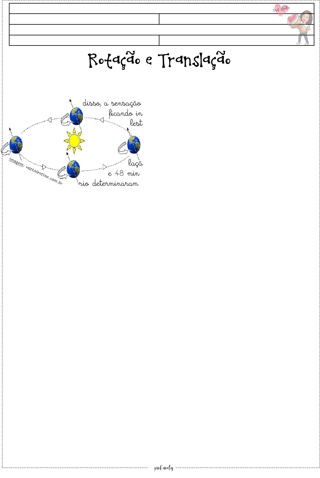 Nome: Ano/série: Professor (a) Escola: Cidade: Data: A rotação é o giro que a Terra dá em torno do seu próprio eixo. Ela demora 24 horas pa- ra completar o ciclo e o realiza em sentido anti-horário (oeste para leste). Por causa disso, a sensação que temos, em relação ao movimento do Sol, acaba ficando invertida, isto é, como a rotação vai do oeste para o leste nós vemos o Sol nascendo no leste (nascente) e se pondo no oeste (poente). Ao contrário da rotação, a translação se trata da Terra rodar em torno do Sol. O período de trans- lação do nosso planeta dura exatos 365 dias, 5 horas e 48 minutos. Para facilitar, aqueles que fizeram o calendá- rio determinaram que a cada 4 anos fevereiro teria um dia a mais para compensar as horas não contadas nos anos normais, assim surgiu o ano bissexto. Esse movimento é o responsável direto pela existência das estações do ano. Como o eixo de inclinação do nosso planeta é de 23º27', há períodos em que os dias são maiores que as noites (solstícios de verão), períodos em que as noites são maiores que os dias (solstícios de inverno) e períodos em que eles possuem a mesma duração (equinócios de primavera e outono). Além desses dois importantes movimentos, a Terra realiza outros 12 movimentos, envol- vendo a precessão, a nutação, a revolução, entre outros. Fonte: https://beduka.com/blog/exercicios/exercicios-sobre-movimentos-da-terra/ https://brasilescola.uol.com.br/o-que-e/geografia/o-que-e-rotacao-translacao.htm Responda: 1– Que nome damos ao movimento que a Terra faz em torno do próprio eixo? 2– E como chamamos o movimento que a Terra faz ao redor do Sol? 3– Complete: A Terra demora ____ horas para completar o movimento de rotação. O movimento de rotação é realizado no sentido ________- horário. O ano ______________ foi determinado por aqueles que fizeram nosso calendário. A translação é responsável pelas ______________ do ano. Há períodos em que os dias são maiores que as ______________. Durante o ________ de primavera e outono,, os dias e as noites têm a mesma dura- ção. @ https://brasilescola.uol.com.br/fisica/nasa.htm https://brasilescola.uol.com.br/fisica/nasa.htm 1 2 3 4 5 6 7 8 9 10 Horizontal 4. Mês do ano que tem um dia a mais 7. Outro movimento realizado pela Terra 9. Nome que damos ao ano que tem 366 dias 10. Movimento da Terra em torno do próprio eixo Vertical 1. Direção que vemos o Sol nascer 2. Direção que o Sol se põe 3. Movimento da Terra ao redor do Sol 5. A Terra demora 365 _______ para completar o movimento ao redor do Sol 6. Devido à rotação, temos o dia e a _________ 8. A translação também é responsável pelas ____________ do ano @ Banco de Respostas: rotação, translação, leste, oeste, dias, bissexto, fevereiro, estações, nutação, noite Responda as perguntas e complete a cruzadinha corretamente: Coloque f para falso e v para verdadeiro: [___] O movimento de translação é responsável pelos dias e noites. [___] A Terra dá uma volta completa ao redor do Sol em um ano. [___] A trajetória do Sol depende de cada região. [___] A duração do dia está sempre mudando. [___] A direção em que o Sol nasce se chama poente.