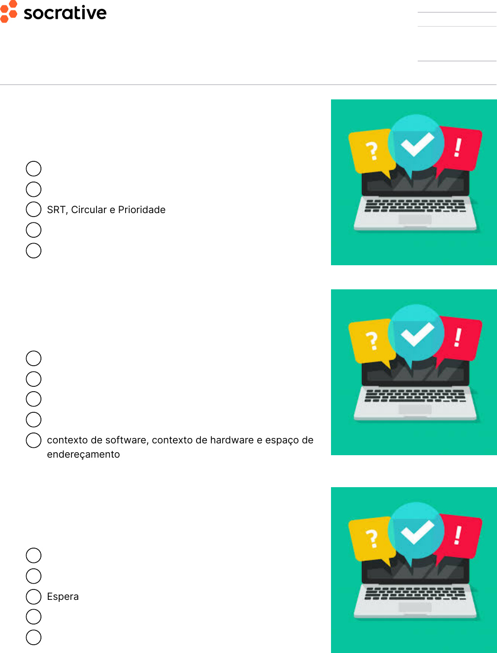 Nome Data AV2 SOP 2020.1 Nota 1. As políticas de escalonamento podem funcionar em modo não preemptivo ou em modo preemptivo. Selecione a opção que apresentam somente algoritmos de escalonamento Preemptivos: 2. Um processo é o conjunto necessário de informações para que o sistema operacional implemente a concorrência de programas. além do código do programa, o conjunto de informações é composto de: 3. De acordo com as possíveis transições de estados que um processo pode sofrer durante o seu ciclo de vida, indique qual estado que impossibilita um processo migrar de uma memória secundária para uma memória principal: A FIFO, SJF, SRT e Circular B FIFO, SJF e SRT C SRT, Circular e Prioridade D FIFO, Circular e Prioridade E SJF, SRT e Prioridade A concorrência, escalonamento e troca de contexto B troca de contexto, escalonamento e threads C bloco de controle, identificação e quotas D prioridade, tempo de execução e bloco de controle E contexto de software, contexto de hardware e espaço de endereçamento A Pronto B Execução C Espera D Criação E Término Sobral Realce Sobral Realce Sobral Realce 4. Selecione a opção que melhor descreve o que é Tempo de Turnaround: 5. Em caso de empate na seleção de um processo para ocupar a CPU, o critério utilizado para a decisão final é: 6. Qual a técnica de alocação de memória que permitiu a primeira forma de divisão da memória principal para melhor aproveitamento de espaço? A Tempo gasto na espera para alocação de memória, espera na fila de pronto, e processamento na UCP. B Representa o número de processos executados em um determinado intervalo de tempo. C É o tempo que um processo leva no estado de execução durante seu processamento. D É o tempo total que um processo permanece na fila de pronto ou aguardando por um recursos. E É o tempo total que um processo permanece na fila de pronto ou executando no processador. A SJF B FIFO C Prioridade D Menor tamanho E Tempo de espera A Particionada estática B Particionada relocável C Particionada dinâmica D Overlay E Contígua simples Sobral Realce Sobral Realce Sobral Realce 7. Considere um sistema no qual as seguintes partições vazias de tamanho fixo estão na memória, na ordem apresentada: 20K, 14K, 35K, 8K, 17K, 39K, 22K e 27K. Se um processo solicitar a alocação de uma área de memória de 21K, qual o algoritmo de alocação de memória que indica a alocação do processo na partição de 39K? 8. Um dos tipos de gerenciamento de memória utilizados por sistemas operacionais é a memória virtual. Este tipo de memória pode ser gerenciada por paginação. Assinale a alternativa que descreve o funcionamento do gerenciamento de memória virtual por paginação: A Best-fit B Worst-fit C Next-fit D First-fit E Last-fit A Divide o espaço de endereçamento virtual e espaço de endereçamento real em blocos do mesmo tamanho chamados de segmentos. B Divide o espaço de endereçamento virtual e espaço de endereçamento real em blocos do mesmo tamanho chamados de buffer. C Divide o espaço de endereçamento virtual e espaço de endereçamento real em blocos do mesmo tamanho chamados de páginas. D Divide o espaço de endereçamento virtual e espaço de endereçamento real em blocos de tamanhos semelhantes chamados de páginas. E Divide o espaço de endereçamento virtual e espaço de endereçamento real em blocos de tamanhos diferentes chamados de páginas. Sobral Realce Sobral Realce 9. Os sistemas operacionais atuais permitem usar o disco rígido para gravar dados caso a memória RAM se esgote, recurso chamado de memória virtual. Sobre a memória virtual, é CORRETO afirmar que: 10. Em um sistema com o uso de memória virtual, o mapeamento para a memória real é feita através da tabela de páginas. Qual informação desta tabela que indica a necessidade de realização de uma operação de page-in. 11. Em um sistema multitarefa, qual o recurso que foi implementado para resolver o problema de fragmentação externa na memória principal? A Permite que o processo seja sempre alocado em áreas contíguas da memória real B Permite que um processo seja fragmentado em áreas livres da memória real C Permite que um processo seja fragmentado na memória virtual e real, em conjunto D Permite que um processo seja fragmentado em áreas livres da memória virtual E Permite que o processo seja sempre alocado em áreas contíguas da memória secundária A Bit de Validade B Bit de Referência C Bit de Modificação D Bit de Swapping E Bit de Mapeamento A Swapping B Paginação C Memória virtual D Segmentação E Mapeamento Sobral Realce Sobral Realce Sobral Realce 12. Um sistema operacional, em uma máquina qualquer, faz sua gerência de memória baseada em uma política de substituição de páginas, na qual é selecionada para se carregar na memória a página que está a mais tempo sem ser referenciada. Essa política é identificada pelo acrônimo: A FIFO B LFU C LRU D NRU E NFU Sobral Realce