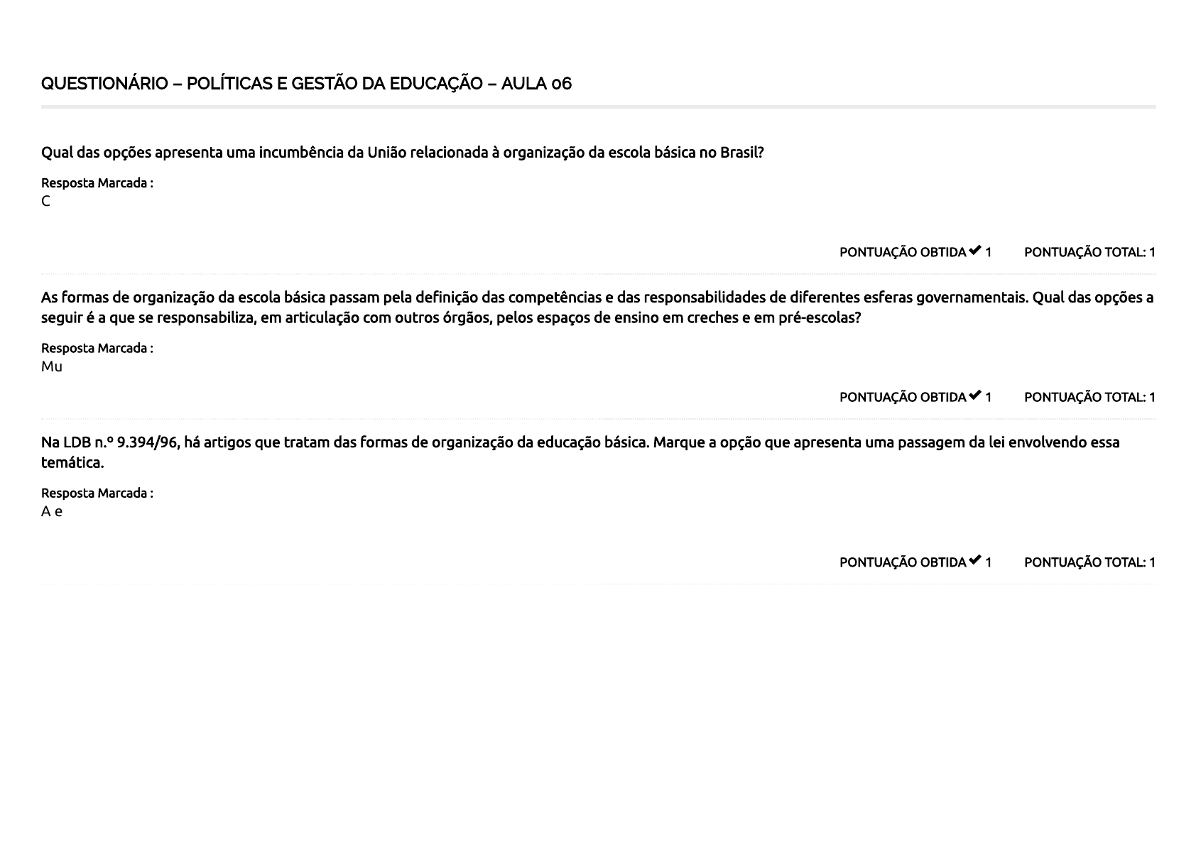 23/07/2020 Course Status – AVA Faculdade Futura https://ava.faculdadefutura.com.br/course-status/ 1/2 QUESTIONÁRIO – POLÍTICAS E GESTÃO DA EDUCAÇÃO – AULA 06 PONTUAÇÃO TOTAL: 1PONTUAÇÃO OBTIDA 1 Qual das opções apresenta uma incumbência da União relacionada à organização da escola básica no Brasil? Resposta Marcada : Caberá à União a coordenação da política nacional de educação, articulando os diferentes níveis e sistemas, exercendo função normativa, redistributiva e supletiva em relação às demais instâncias educacionais. PONTUAÇÃO TOTAL: 1PONTUAÇÃO OBTIDA 1 As formas de organização da escola básica passam pela de�nição das competências e das responsabilidades de diferentes esferas governamentais. Qual das opções a seguir é a que se responsabiliza, em articulação com outros órgãos, pelos espaços de ensino em creches e em pré-escolas? Resposta Marcada : Municípios PONTUAÇÃO TOTAL: 1PONTUAÇÃO OBTIDA 1 Na LDB n.º 9.394/96, há artigos que tratam das formas de organização da educação básica. Marque a opção que apresenta uma passagem da lei envolvendo essa temática. Resposta Marcada : A educação básica poderá organizar-se em séries anuais, períodos semestrais, ciclos, alternância regular de períodos de estudos, grupos não seriados, com base na idade, na competência e em outros critérios, ou por forma diversa de organização, sempre que o interesse do processo de aprendizagem assim o recomendar. 23/07/2020 Course Status – AVA Faculdade Futura https://ava.faculdadefutura.com.br/course-status/ 2/2 5 / 5 PONTUAÇÃO TOTAL: 1PONTUAÇÃO OBTIDA 1 Com base na formulação e na implementação de políticas educacionais, algumas conquistas vão sendo alcançadas, tais como a Emenda Constitucional n.º 59/2009, promulgada em 11 de novembro de 2009. Sobre o que essa emenda dispõe? Marque a alternativa correta. A Emenda Constitucional nº 59 alterou a Constituição Federal de 1988 nos seguintes aspectos: I – O Ensino Fundamental passa a ser obrigatório dos 4 aos 17 anos de idade, assegurada, inclusive sua oferta a todos os que a ela não tiveram acesso na idade própria. II – Na organização dos seus Sistemas de Ensino, a União, os Estados, o Distrito Federal e os municípios de�nirão formas de colaboração, de modo a assegurar a universalização do ensino obrigatório. III – A distribuição dos recursos públicos assegurará prioridade ao atendimento das necessidades do ensino obrigatório, no que se refere à universalização, garantida do padrão de qualidade e equidade, nos termos do plano nacional de educação. IV – A desvinculação de recursos da União (DRU) que, para efeito de cálculo, ocorreu gradativamente até 2011, aumentando, assim, o orçamento anual da Educação em até 20% de recursos, mantendo a totalidade dos recursos que lhe são destinados. Resposta Marcada : II, III e IV apenas PONTUAÇÃO TOTAL: 1PONTUAÇÃO OBTIDA 1 Reconhecendo os limites da organização básica no Brasil, algumas políticas governamentais são formuladas visando o enfrentamento de problemas que atravessam décadas de nossa história educacional. Marque a alternativa que compreende uma política governamental que estipula metas para o enfrentamento dessas di�culdades. Resposta Marcada : Plano Nacional de Educação – Lei n.º 13.005/2014. Total