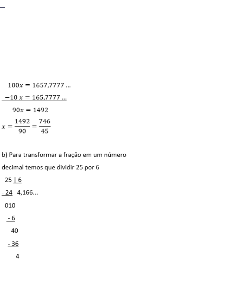 Disciplina: Introdução ao Cálculo (MAD03) Avaliação: Avaliação Final (Discursiva) - Individual Semipresencial ( Cod.:637480) ( peso.:4,00) Prova: 21793870 Nota da Prova: 10,00 Parte superior do formulário 1. Todo número decimal pode ser escrito na forma fracionária, até mesmo os números decimais que são dizimas periódicas e a fração que representa essa dizima periódica é chamada de fração geratriz. Para cada um dos itens a seguir, apresente os cálculos para justificar sua resposta. a) Encontre a fração geratriz irredutível da dizima periódica 16,57777.... b) Transforme a fração 25/6 num número decimal. Resposta Esperada: a) Para transformar a dizima periódica em fração, neste caso basta multiplicar por 10 e por 100, pois é dízima periódica composta. 2. José trabalha numa loja de roupas e tem um salário fixo de R$ 1.500,00. A cada peça de roupa vendida, José ganha uma comissão de R$ 3,00. a) Expresse a fórmula matemática que determina o salário de José. b) Se José vendeu 120 roupas num mês, qual será o seu salário? c) Se José pretende ganhar R$ 2.280,00, quantas peças de roupa ele precisa vender? Resposta Esperada: a) S(p) = 1500 + 3p b) S(120) = 1500 + 3 x 120 = 1500 + 360 = 1860 c) 1500 + 3p = 2300 3p = 2280 ? 1500 3p = 780 p = 260 peças Parte inferior do formulário