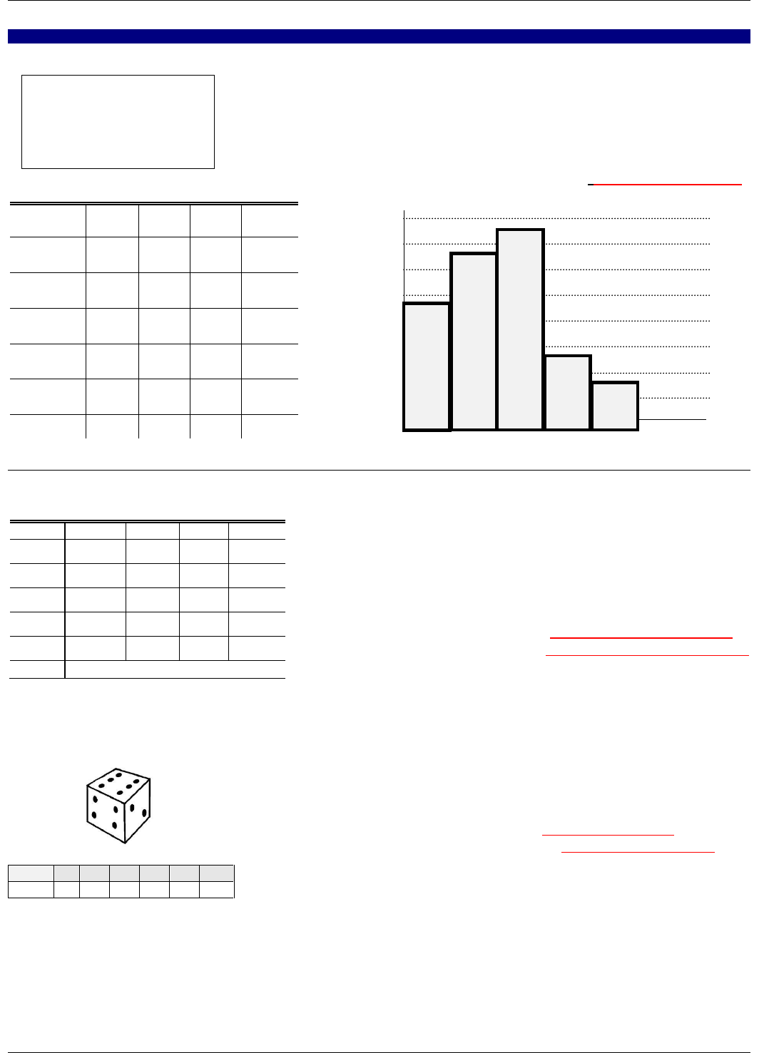 Caderno de exercícios Estatística Uanderson Rebula DISTRIBUIÇÃO DE FREQUENCIA 1. Uma loja de produtos de informática resolveu fazer uma pesquisa com seus clientes adolescentes para saber a idade da maioria deles. Para tanto, selecionou uma amostra de 25 clientes, sendo as idades mostradas abaixo. Faça as questões a) a e) Idades dos clientes (em anos) 12 13 14 15 14 13 12 15 16 16 14 13 13 12 13 13 14 14 13 14 12 14 15 14 12 a) Construa a tabela de distribuição de frequência f, fr(%), Fa e FRa(%). b) Construa um histograma da distribuição de frequência. c) Qual a idade mais frequente, segundo a amostra?____14 anos___________________ d) Quantos clientes têm idade até 14 anos?_____20 clientes__________________________ e) Qual a porcentagem de clientes com idade maior que 13 anos?___52%_(32%+12%+8%)___ Idade dos clientes f Fr(%) Fa FRa(%) 12 5 20% 5 20% 13 7 28% 12 48% 14 8 32% 20 80% 15 3 12% 23 92% 16 2 8% 25 100% - f= 100% - - Desenhe o Histograma aqui 2. Considerando a distribuição de frequência correspondente aos diferentes preços (R$) de um produto em lojas pesquisadas em Resende no ano de 2001. Construa uma tabela de frequências fr(%), Fa e FRa(%). Preços Nº lojas Fr(%) Fa FRa(%) R$50 2 10% 2 10% R$51 5 25% 7 35% R$52 6 30% 13 65% R$53 6 30% 19 95% R$54 1 5% 20 100% - 20 100% - - Informe: a) O nº total de lojas pesquisadas_______20_________________________ b) O nº de lojas com preço até R$52_______13_______________________ c) A % de lojas com preço de $53?________30%________________________ d) O nº de lojas com preço menor que R$52_______7_________________ e) A % de lojas com preço maior que R$53?________5%________________ f) O nº de lojas com preço entre R$52 e R$53______12__(6+6)______________ g) A % de lojas com preço entre R$52 e R$54______65% (30%+30%+5%)______ 3. Um dado foi lançado 50 vezes, obtendo os seguintes resultados Face 1 2 3 4 5 6 f 8 7 12 10 8 5 a) Qual a frequência com que saiu a face 3?____12______________________ b) Qual a porcentagem de saída da face 6?______10%_(5/50 x 100)_________ c) Qual a frequência de saída acumulada até 4?____37__(8+7+12+10)_______ d) Qual a frequência com que saiu a face 5?_____8___________________ e) Qual porcentagem de saída acumulada até a face 2?__30%_(8+7/50 x 100)____ f) Qual porcentagem de saída acumulada até a face 3?__54%_(8+7+12/50 x 100)__ 8 7 6 5 4 3 2 1 0 12 13 14 15 16