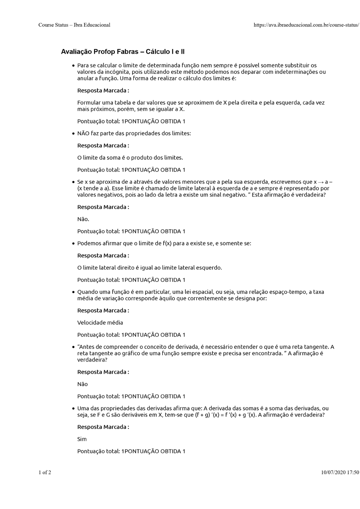 Course Status - Ibra Educacional https:// ava. ibraeducacional. com. br/course-status/ 1 of2 Avaliação Profop Fabras - Cálculo I e li • Para se calcular o limite de determinada função nem sempre é possível somente substituir os valores da incógnita, pois utilizando este método podemos nos deparar com indeterminações ou anular a função. Uma forma de realizar o cálculo dos limites é: Resposta Marcada: Formular uma tabela e dar valores que se aproximem de X pela direita e pela esquerda, cada vez mais próximos, porém, sem se igualar a X. Pontuação total: 1 PONTUAÇÃO OBTIDA 1 • NÃO faz parte das propriedades dos limites: Resposta Marcada : O limite da soma é o produto dos limites. Pontuação total: 1 PONTUAÇÃO OBTIDA 1 • Se x se aproxima de a através de valores menores que a pela sua esquerda, escrevemos que x -> a - (x tende a a). Esse limite é chamado de limite lateral à esquerda de a e sempre é representado por valores negativos, pois ao lado da letra a existe um sinal negativo." Esta afirmação é verdadeira? Resposta Marcada: Não. Pontuação total: 1 PONTUAÇÃO OBTIDA 1 • Podemos afirmar que o limite de f(x) para a existe se, e somente se: Resposta Marcada: o limite lateral direito é igual ao limite lateral esquerdo. Pontuação total: 1 PONTUAÇÃO OBTIDA 1 • Quando uma função é em particular, uma lei espacial, ou seja, uma relação espaço-tempo, a taxa média de variação corresponde àquilo que correntemente se designa por: Resposta Marcada: Velocidade média Pontuação total: 1 PONTUAÇÃO OBTIDA 1 • "Antes de compreender o conceito de derivada, é necessário entender o que é uma reta tangente. A reta tangente ao gráfico de uma função sempre existe e precisa ser encontrada." A afirmação é verdadeira? Resposta Marcada : Não Pontuação total: 1 PONTUAÇÃO OBTIDA 1 • Uma das propriedades das derivadas afirma que: A derivada das somas é a soma das derivadas, ou seja, se F e G são deriváveis em X, tem-se que (f + g) '(x) = f '(x) + g '(x) . A afirmação é verdadeira? Resposta Marcada : Sim Pontuação total: 1 PONTUAÇÃO OBTIDA 1 10/07/2020 17 :50 Course Status - Ibra Educacional https:// ava. ibraeducacional. com. br/course-status/ • Se uma função f for contínua num intervalo fechado finito [a, b], então f: Resposta Marcada: Tem ambos um máximo e um mínimo absolutos em [a, b]. Pontuação total: 1 PONTUAÇÃO OBTIDA 1 • Calcule o limite a seguir: lim x2 + 2x para x -, 2 (x tende a 2) Resposta Marcada : 8 Pontuação total: 1 PONTUAÇÃO OBTIDA 1 • Calcule o limite a seguir: lim x3 + 28 para x -, - 3 (x tende a -3) Resposta Marcada: Pontuação total: 1 PONTUAÇÃO OBTIDA 1 Total 10 / 10