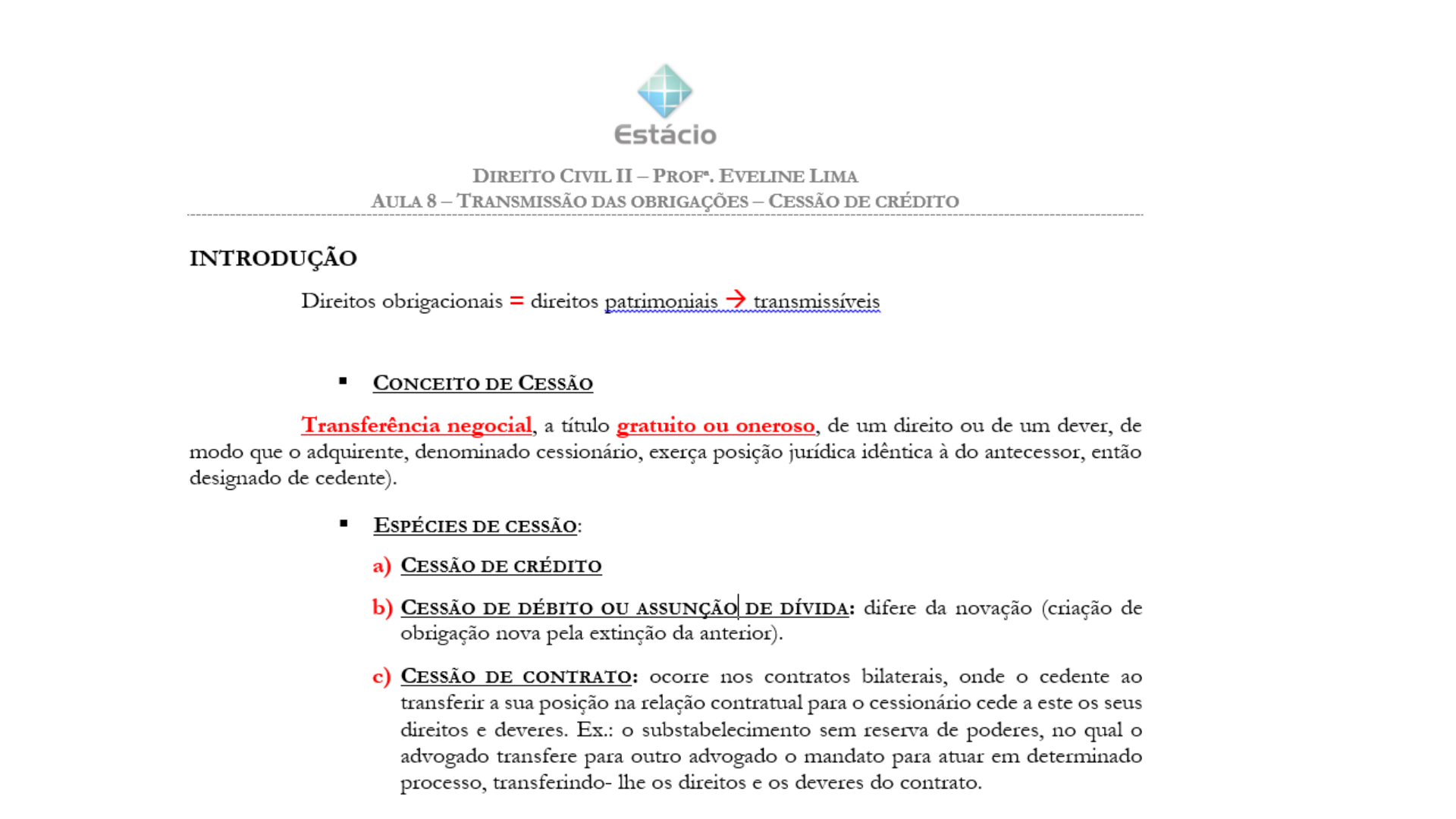 Caso concreto 4 Ana firmou com Pedro a obrigação de entregar três sacas de café Conilon, que estavam armazenadas em seu galpão ao final do mês de abril. Para tanto, Pedro adiantou a quantia de R$10.000,00 (dez mil reais). Ocorre que antes do termo fixado, uma chuva torrencial destruiu o galpão com as sacas destinadas ao credor. Nesse caso, como Pedro poderá reaver o prejuízo sofrido? Fundamente. Gabarito Obrigação de dar coisa certa. Caso fortuito/força maior. Art. 234, CC. Caso concreto 5 Antônia é uma mulher de 40 anos, 1.85 de altura e 60 quilos. Algumas pessoas de sua convivência e parentela comentam que desde a adolescência Antônia possui forte semelhança física e fisionômica com a apresentadora Xuxa. Fielmente alicerçada nessa crença, Antônia procura um cirurgião plástico conceituado que lhe afirma em consulta, poder realizar procedimento cirúrgico plástico no corpo e face que lhe deixariam idêntica à apresentadora, possibilitando que Antônia inclusive tire proveito econômico da circunstância, posto poder atuar como cover ou duble da própria Xuxa. Ante a afirmação, Antônia anui com o contrato médico, paga o valor estabelecido e ao longo de dezoito meses é submetida a várias internações e cirurgias. Ao final o resultado é um fracasso. Antônia passa a ser motivo de piadas e desprezo, que resulta em forte depressão. Em virtude de todos os fatos expostos, Antônia decide processar o médico alegando prejuízo. Diante dos fatos, qual é a modalidade obrigacional realizada entre médico e paciente, segundo o ordenamento jurídico brasileiro? Gabarito Obrigação de fazer e resultado. Caso concreto 6 Se Amanda, Bruno e Carla adquiriram, conjuntamente, um veículo, obrigando-se a pagar R$ 9.000,00, não havendo estipulação contratual em sentido contrário, qual será a responsabilidade de cada um dos sujeitos pelo pagamento do valor da dívida? Gabarito Cada um arca com R$ 3.000,00. Adquiriram conjuntamente, mas a obrigação é divisível. Solidariedade não se presume.