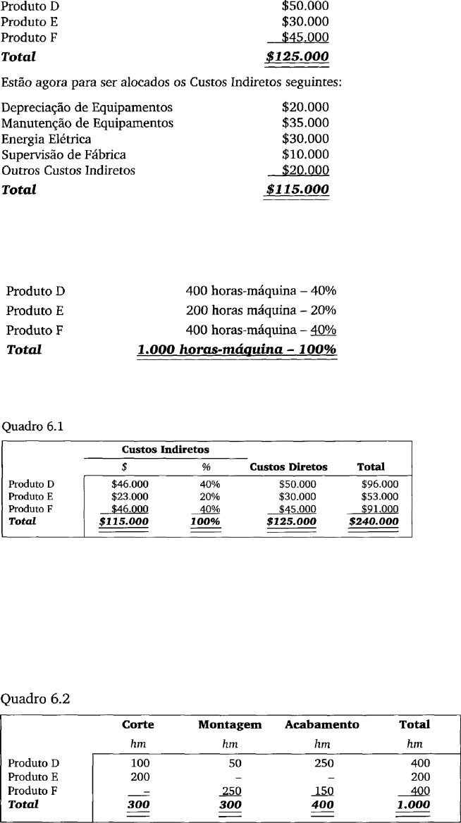 1 6 - Esquema Básico da Contabilidade de Custos (II) —Departamentalização Vamos aprofundar-nos um pouco mais no problema relativo à apropriação dos Custos Indiretos, verificando o que é e por que se faz a Departamentalização. 6.1 POR QUE DEPARTAMENTALIZAR Suponhamos que uma empresa, produzindo três produtos, D, E e F, tenha já alocado a eles os seguintes Custos Diretos: Devido à grande preponderância de Custos Indiretos ligados a equipamentos (depreciação, manutenção, energia), decide-se então fazer a distribuição aos diversos produtos com base no tempo de horas-máquina que cada um leva para ser feito. Portanto, a atribuição dos Custos Indiretos e o cálculo do Custo Total ficariam: (Custo Indireto médio por hora-máquina = $115.000 ÷ 1.000 hm = $115/hm.) Estariam por esses valores acima os Custos Totais de Produção dos três produtos. Suponhamos, entretanto, que, ao se analisar mais detidamente o processo d produção, se verifica que, apesar de os totais de horas-máquina consumidos serem aqueles mesmos, existe uma grande disparidade entre os produtos pelo seguinte: o produto gasta um total de 400 hm, distribuídas nos setores de Corte, Montagem e Acabamento, enquanto que o Produto E só passa pelo Corte, não necessitando nem de Montagem nem de Acabamento, e o Produto F só passa exatamente por esses dois últimos setores não precisando passar pelo Corte. A distribuição total é assim levantada: Completando essa investigação adicional, verifica-se, também, que o gasto com os Custos Indiretos de Produção não é uniforme entre os setores, distribuindo-se: 2 Podemos agora efetuar uma apropriação dos Custos Indiretos de forma mais adequada, levando em conta o tempo de cada produto em cada Departamento (Quadro 6.2) e o Custo por hora-máquina de cada Departamento (Quadro 6.3). Podemos fazer uma comparação entre os valores dos Custos Indiretos alocados a cada produto sem a Departamentalização (uso de uma única taxa horária para todos) e com a Departamentalização (uma taxa para cada departamento), usando os Quadros 6.1 e 6.4: Atentando para a coluna “Diferença”, verificamos o grau de distorção existente entre as duas formas, e, apesar de quaisquer arbitrariedades ocorridas na forma de apropriação por hora-máquina, é claro que na alocação com base na Departamentalização estarão sendo cometidas menos injustiças e diminuídas as chances de erros maiores. Se a empresa analisasse a lucratividade de seus produtos ou tentasse administrar seus preços de venda com base em seus custos de produção, verificaria então que, com base na Departamentalização, precisaria aumentar os dos Produtos D e E, diminuindo o de F. Sérios problemas poderiam ocorrer em processos de concorrência ou na competição no mercado com outras empresas pelo inadequado processo de custeamento. O Capítulo 19 coloca em discussão a validade do uso de informações de custos para fins de fixação de preços, principalmente em mercados muito competitivos. 6.2 QUE É DEPARTAMENTO E COMO SE CLASSIFICA Departamento é a unidade mínima administrativa para a Contabilidade de Custos, representada por pessoas e máquinas (na maioria dos casos), em que se desenvolvem atividades homogêneas. Diz-se unidade mínima administrativa porque sempre há um responsável para cada Departamento ou, pelo menos, deveria haver. Esse conceito que liga a atribuição de cada Departamento à responsabilidade de uma pessoa dará origem a uma das formas de uso da Contabilidade de Custos como forma de controle; esse aspecto será desenvolvido na Parte 1V — Custos para Controle, sob o nome Custos por Responsabilidade. 3 Para o campo de Custos para Avaliação de Estoques que estamos vendo, interessa-nos mais visualizar o Departamento como um conjunto que, apesar de na maioria das vezes ser constituído por pessoas e máquinas, pode também ocorrer sob a forma de pessoas apenas e, pelo menos teoricamente, também só máquinas, que realizam atividades homogêneas. Por exemplo: Forjaria, Cromeação, Montagem, Pintura, Almoxarifado, Manutenção, Refinaria, Administração Geral da Produção etc. Verificando esses exemplos, notamos que podem ser divididos em dois grandes grupos: os que promovem qualquer tipo de modificação sobre o produto diretamente e os que nem recebem o produto; aqueles são os que atuam sobre o produto e são conhecidos por Departamentos de Produção, enquanto os segundos, que vivem basicamente para execução de serviços auxiliares e não para atuação direta sobre os produtos, são conhecidos por Departamentos de Serviços. Os Departamentos de Serviços (impropriamente chamados às vezes de Não produtivos e também conhecidos por Auxiliares) geralmente não têm seus custos apropriados diretamente aos produtos, pois estes não passam por eles. Por viverem esses Departamentos para a prestação de serviços a outros Departamentos, têm seus custos transferidos para os que deles se beneficiam. Esse processo de transferência será estudado com mais profundidade no Capítulo 7. Os Departamentos de Produção (também conhecidos por Produtivos) têm seus custos jogados sobre os produtos, já que estes passam inclusive fisicamente por eles. 6.3 DEPARTAMENTO E CENTRO DE CUSTOS Na maioria das vezes um Departamento é um Centro de Custos, ou seja, nele são acumulados os Custos Indiretos para posterior alocação aos produtos (Departamentos de Produção) ou a outros Departamentos (Departamentos de Serviços). Em outras situações podem existir diversos Centros de Custos dentro de um mesmo Departamento. Suponhamos, por exemplo; que num Departamento de Perfuração sejam executados diversos serviços dessa natureza com o uso de três máquinas; poderiam ocorrer pelo menos três hipóteses: Primeira hipótese: Cada uma das três máquinas executa todos os tipos de serviços (furos de diversos diâmetros e profundidades em qualquer material utilizado pela empresa). Exi
