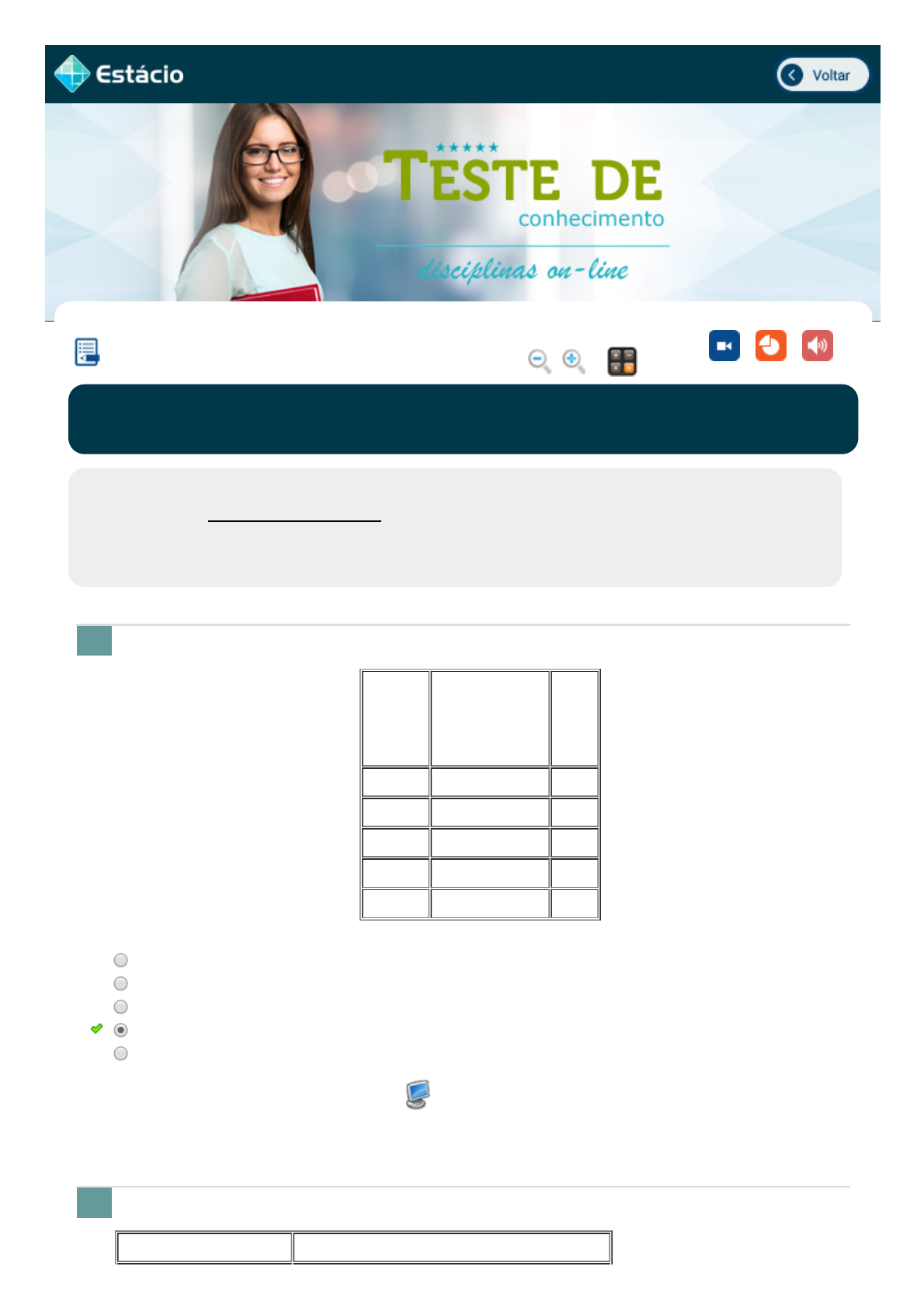 13/04/2020 EPS simulado.estacio.br/alunos/?user_cod=2016428&matr_integracao=201802299173 1/5 A tabela abaixo representa a distribuição dos funcionários de uma empresa nacional por número de salários mínimos. Quantos colaboradores ganham no mínimo 5 salários mínimos? Classe Intervalo (Nº de Salários Mínimos) QTD 1 1 |- 3 80 2 3 |- 5 50 3 5 |- 7 28 4 7 |- 9 24 5 Mais que 9 18 A tabela abaixo representa as notas dos estudantes de uma classe. Determinar qual a porcentagem dos alunos que tiveram nota menor do que 3. Nota Frequência PROBABILIDADE E ESTATÍSTICA CEL0272_A3_201802299173_V3 Lupa Calc. Vídeo PPT MP3 Aluno: FLAVIO BATISTA LOBATO BARROS Matr.: 201802299173 Disc.: PROBABILIDADE E EST. 2020.1 EAD (G) / EX Prezado (a) Aluno(a), Você fará agora seu TESTE DE CONHECIMENTO! Lembre-se que este exercício é opcional, mas não valerá ponto para sua avaliação. O mesmo será composto de questões de múltipla escolha. Após responde cada questão, você terá acesso ao gabarito comentado e/ou à explicação da mesma. Aproveite para se familiarizar com este modelo de questões que será usado na sua AV e AVS. 1. 120 130 24 70 80 Gabarito Coment. 2. javascript:voltar(); javascript:voltar(); javascript:diminui(); javascript:aumenta(); javascript:calculadora_on(); javascript:abre_frame('1','3','','PEER3MSCD5EC97FUYDAM','314398284'); javascript:abre_frame('2','3','','PEER3MSCD5EC97FUYDAM','314398284'); javascript:abre_frame('3','3','','PEER3MSCD5EC97FUYDAM','314398284'); 13/04/2020 EPS simulado.estacio.br/alunos/?user_cod=2016428&matr_integracao=201802299173 2/5 0|-2 14 2|-4 28 4|-6 27 6|-8 11 8|-10 4 Total 84 Numa determinada empresa, o número de funcionários que ganham entre 5 a 7 salários mínimos é de 35. Sabendo que o número total de colaboradores são de 200, qual é a frequência relativa dessa faixa salarial? A tabela abaixo apresenta a distribuição de frequência dos salários dos empregados da seção de orçamento de uma empresa: A média aritmética dos salários dos empregados da seção de orçamento dessa empresa é: A partir da tabela de distribuição abaixo, determine a freqüência relativa e percentual da segunda classe respectivamente: Classe Frequencia 2% 30% 45% 88% 50% 3. 14,50% 16,50% 17,50% 15,50% 13,50% 4. 13,00 9,13 18,25 8,75 10,15 5. 13/04/2020 EPS simulado.estacio.br/alunos/?user_cod=2016428&matr_integracao=201802299173 3/5 1 7 2 15 3 5 A tabela abaixo representa a distribuição dos funcionários de uma empresa nacional por número de salários mínimos. Quantos colaboradores ganham no mínimo 3 salários mínimos? Classe Intervalo (Nº de Salários Mínimos) QTD 1 1 |- 3 80 2 3 |- 5 50 3 5 |- 7 28 4 7 |- 9 24 5 Mais que 9 18 Utilizando a tabela 1 que representa a distribuição de notas dos alunos em uma avaliação, determine a amplitude de classe 20 e 40% 27 e 30,5% 15 e 10% 15/27 e 55,6 % 12/27 e 90,5% Gabarito Coment. 6. 70 130 120 28 80 Explicação: 120 funcionários ganham, no mínimo, 3 salários mínimos (50 + 28 + 24 + 18 = 120) 7. 13/04/2020 EPS simulado.estacio.br/alunos/?user_cod=2016428&matr_integracao=201802299173 4/5 5 1 4 3 2 Gabarito Coment. 8. 7|―9 3|―5 11|―13 5|―7 9|―11 Legenda: Questão não respondida Questão não gravada Questão gravada Exercício inciado em 13/04/2020 00:18:34. javascript:abre_colabore('35224','186088937','3710435519'); 13/04/2020 EPS simulado.estacio.br/alunos/?user_cod=2016428&matr_integracao=201802299173 5/5