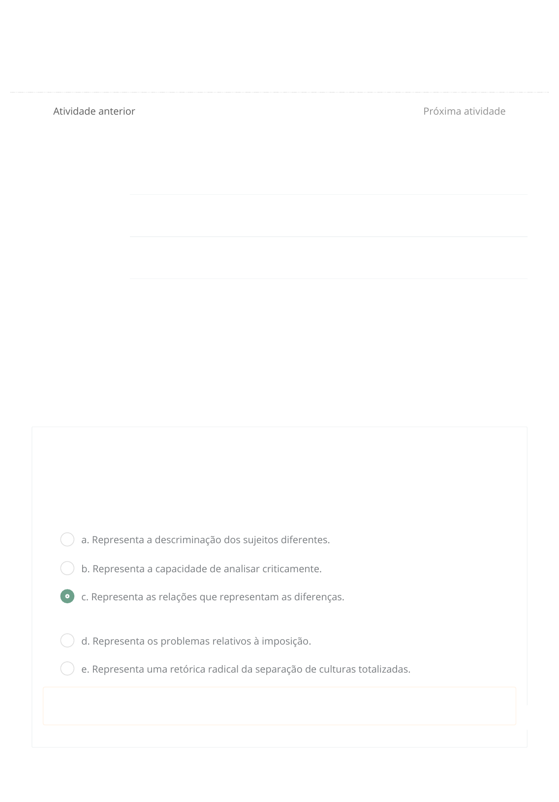 Diversidade e Inclusão Educacional Atividade anterior Próxima atividade Iniciado em domingo, 21 Jun 2020, 16:14 Estado Finalizada Concluída em domingo, 21 Jun 2020, 16:37 Avaliar 5,0 de um máximo de 10,0(50%) Questão 1 Incorreto Para Bhabha (1998), a diversidade cultural refere-se à cultura como objeto de conhecimento empírico, reconhecendo conteúdos e costumes culturais. O que representa a diversidade? Escolha uma: A resposta correta é: Representa uma retórica radical da separação de culturas totalizadas.. a. Representa a descriminação dos sujeitos diferentes. b. Representa a capacidade de analisar criticamente. c. Representa as relações que representam as diferenças. d. Representa os problemas relativos à imposição. e. Representa uma retórica radical da separação de culturas totalizadas. https://aula.fael.edu.br/mod/folder/view.php?id=49751&forceview=1 https://aula.fael.edu.br/mod/lesson/view.php?id=49753&forceview=1 https://aula.fael.edu.br/ Questão 2 Correto Sabe-se que é fundamental o trabalho com a questão da identidade nas escolas e que hoje com as mudanças de paradigmas, ainda não se faz presente em sua totalidade. Diante disso, por que os planejamentos pedagógicos, conteúdos, currículo, avaliação, etc. precisam ser reestruturados? Escolha uma: A resposta correta é: Para que sejam abandonadas as práticas educacionais tradicionais que descredenciam valores e invalidam os saberes e práticas sociais, levando muitas vezes á repetência escolar.. a. Para que sejam abandonadas as práticas educacionais tradicionais que descredenciam valores e invalidam os saberes e práticas sociais, levando muitas vezes á repetência escolar. b. Para que se possibilite um trabalho dinâmico homogeneizando as aprendizagens de todos os indivíduos independente de qualquer fator. c. Para que todos os alunos desenvolvam-se de maneira igualitária. d. Para que sejam mantidas as práticas educacionais tradicionais que descredenciam valores e invalidam os saberes e práticas sociais, levando muitas vezes á repetência escolar. e. Para que se rompa com o conceito de que a escola deverá adaptar-se ao aluno e não o contrário. https://aula.fael.edu.br/ Questão 3 Incorreto Complete as lacunas: O contexto _____________ é responsável pelo processo de identi�cação. Logicamente diferenças ________________, ________________, fenotípicas e regionais não podem, ou não devem impedir a realização da identi�cação positiva com a _________________ nacional (TEODORO, 1987 p.35). Escolha uma: A resposta correta é: Social/ Raciais/ Étnicas/ Cultura.. a. Social/ Sociais/ Étnica / Política. b. Educacional/ Raciais/ Étnicas/ Política. c. Social/ Raciais/ Étnicas/ Cultura. d. Educacional/ Sociais/ Étnicas/Política. e. Social/ Raciais/ Étnicas/Política. https://aula.fael.edu.br/ Questão 4 Correto A escola é uma instituição construída historicamente no contexto da modernidade, considerada como fundamental e apta a transmitir cultura, oferecer as gerações mais novas a cultura e o saber produzidos pela humanidade. Para Candau (2005) a escola sempre teve: Escolha uma: A resposta correta é: Di�culdade para lidar com a pluralidade e a diferença, assumindo uma visão monocultural.. a. Suas relações de cultura raramente constitutivas no âmbito da educação. b. Di�culdade para lidar com a pluralidade e a diferença, assumindo uma visão monocultural. c. Facilidade em trabalhar nas dinâmicas escolares. d. Transformações culturais que buscam privilegiar determinados temas na análise dos fenômenos sociais. e. Ideia de igualdade e do direitos de todos. https://aula.fael.edu.br/ Questão 5 Correto Na organização curricular é preciso ter em mente várias ideologias: na escola, do aluno e do professor, pois são elas que fomentarão subsídios na construção de um currículo que atenda a todas as culturas. A escola como instituição deve ser: Escolha uma: A resposta correta é: Espaço privilegiado para a construção de relações interculturais.. a. Espaço privilegiado para a construção de relações interculturais. b. Espaço para brincadeiras. c. Espaço que privilegia e minimiza o valor dos outros, produzindo relações desiguais. d. Espaço destinados apenas para os alunos. e. Espaço apenas para atividades teóricas, sempre dentro do que foi planejado. https://aula.fael.edu.br/ Questão 6 Correto TORLA (1997), aponta algumas formas de discriminação dos sujeitos diferentes. Em relação à diversidade sexual, é correto a�rmar: I – O reconhecimento desta diversidade e a promoção de uma sociedade inclusiva passam pela equivalência de direitos e pelas escolhas de cada um. II – O tema diversidade sexual na educação ainda é restrita porque existe historicamente uma posição hétero-normativa muito arraigada. III – O estudo da cultura da África, numa perspectiva histórica, geográ�ca, cultural e política, poderá ajudar a acabar com o racismo no Brasil. Assinale a alternativa correta: Escolha uma: A resposta correta é: Apenas as alternativas I e II são verdadeiras.. a. As alternativas II e III são verdadeiras. b. Apenas a alternativa I é verdadeira. c. Apenas a alternativa II é verdadeira. d. Apenas as alternativas I e II são verdadeiras. e. Apenas a alternativa III é verdadeira. https://aula.fael.edu.br/ Questão 7 Incorreto Segundo GÓMEZ (1998), o responsável de�nitivo da natureza, sentido e consistência do que os alunos e alunas aprendem na sua vida escolar é este vivo, �uido e complexo cruzamento de culturas que se produz na escola entre as propostas de cultura crítica. Desse modo o que caracteriza o universo escolar? Escolha uma: A resposta correta é: É a relação entre as culturas, relação essa atravessada por tensões e con�itos.. a. As diferenças de identidades culturais que aparecem com muita força no campo da educação. b. É a relação entre as culturas, relação essa atravessada por tens