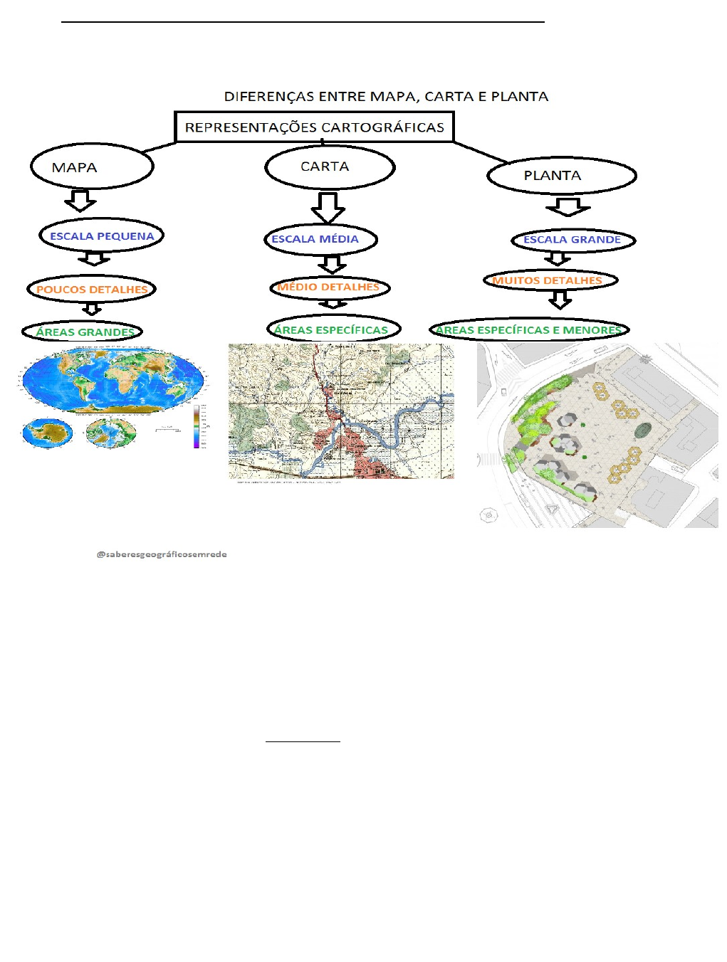 Diferenças entre Mapa, Carta e Planta Topográfica MAPAS Os mapas são instrumentos de comunicação, servem para representar graficamente uma dada área do espaço terrestre. Os mapas e cartogramas (O cartograma é uma modalidade específica dentro da cartografia que consiste em representar um território indicando de maneira proporcional os valores de determinado assunto. Assim, em um cartograma sobre a população mundial, o tamanho de cada país apareceria na proporção do número de habitantes. Este mapa poderia ser representado por retângulos para referir a cada país e para ter um guia sobre a escala do mapa especificaria uma informação complementar na qual um retângulo com área específica corresponderia a uma quantidade de milhões de habitantes.) não objetivam representar todas as informações presentes na superfície, mas apenas aquilo que o autor deseja demonstrar. Para produzir esses diferentes tipos de mapas, os cartógrafos e geógrafos utilizam técnicas e ferramentas de extrema importância, como a localização geográfica, as escalas ou até a distorção de determinadas características do espaço. Nesse sentido, mais do que apenas representações, os mapas funcionam como documentos e visões de mundo. Por isso, os mapas podem ser divididos em vários tipos e a sua classificação varia de acordo com o tema tratado. Por esse motivo, dá-se o nome de mapas GERAIS, temáticos E ESPECIAIS. · Mapas físicos São mapas que representam a superfície física da terra, como as formas de relevo, a hipsometria (as altitudes da terra divididas em cores), a hidrografia, o clima, entre outros. Exemplo: Mapa de Relevo CURIOSIDADE O Instituto Brasileiro de Geografia e Estatística (IBGE) disponibilizou na última quinta-feira (6/12/2018) o Mapa Físico do Brasil na escala 1:5 000 000. O Mapa Físico do Brasil na escala 1:5.000.000 fornece uma visão do conjunto das características fisiográficas do território, possibilitando a identificação de macrobacias hidrográficas e grandes estruturas de relevo. Abrangendo aspectos físicos da superfície terrestre do território brasileiro, o mapa é uma representação cartográfica mural que traz informações sobre a altimetria e elementos fisiográficos do país, como montes, morros, picos, serras e corpos d’água. O mapa ainda apresenta a organização político-administrativa do território nacional, com os 26 estados e respectivas capitais, além do Distrito Federal. O mapa foi elaborado a partir da versão 2016 da Base Cartográfica Contínua do Brasil ao Milionésimo (BCIM). Para a representação das altitudes, foi utilizado um sistema de graduação de cores hipsométricas que se inicia na cor verde, representando as altitudes mais baixas, e termina na cor magenta, que representa as maiores altitudes. Disponível nas versões impressa e digital, o mapa tem como usuários potenciais estudantes e profissionais da educação. A última versão desse produto havia sido produzida em 2007. · Mapas econômicos São mapas que representam a produção do espaço econômico, isto é, as atividades econômicas de uma determinada área, bem como a distribuição de dados estatísticos, por exemplo: a receita financeira dos estados brasileiros, o índice de População Economicamente Ativa (PEA) de uma região etc. Mapa econômico de industrias e sistema de Transporte · Mapas demográficos Trata-se da representação espacial das populações, como índices populacionais, taxas de analfabetismo, migrações (são elaborados para descrever dados relacionados com a população de um determinado território. Podem explicitar a quantidade de habitantes, a localização, a densidade de ocupação ou os fluxos migratórios.) · Mapas econômicos Descrevem as atividades econômicas e a apropriação do espaço geográfico por elas realizada. Os mapas econômicos são importantes na compreensão de temas como a expansão da agropecuária, a localização industrial, a disponibilidade e a extração de recursos naturais, os sistemas de produção de energia, o conjunto de meios de transporte existente em um território, entre outras questões. · Mapas políticos Representam as divisas e fronteiras entre países e/ou entre unidades federativas estabelecidas e consolidadas politicamente (descrevem as delimitações territoriais de países, estados e municípios, com as delimitações de suas fronteiras. Estas não existem na natureza, tratam-se de uma construção intelectual humana representada cartograficamente para a melhor compreensão das divisões do espaço geográfico mundial.) · Mapas históricos São mapas utilizados para representar algum acontecimento em algum período histórico, como as áreas colonizadas no Brasil até o século XVII. como o próprio nome indica, esse tipo de mapa representa algum acontecimento histórico nas suas mais variadas escalas. Eles necessitam de um título que aponte o período de sua ocorrência para melhor situar o leitor quanto ao contexto de época das informações descritas. Alguns mapas históricos também possuem a importante função de descrever como era realizada a técnica da cartografia em tempos pretéritos, bem como a visão de mundo que se tinha antigamente, antes do descobrimento das Américas, por exemplo.) · Mapas estilizados São mapas em que não há a representação fiel das proporções das diferentes áreas do espaço geográfico, alterando suas formas conforme as informações. Um exemplo desse tipo de mapa é a projeção de anamorfose. Mapa da população mundial. Observe que os países mais populosos ficaram maiores e os menos populosos, menores.¹ BR -15 8/2 42 BR -01 0 BR -36 9 BR-364 BR-242 BR -36 7 BR -40 5 BR-324 BR -24 2 BR-293 BR-4 25 BR-174 BR-156 BR-262 BR-163 BR-235 BR -12 2 BR -02 0 BR -15 8 BR- 174 BR-262 BR -31 9 BR -15 8 BR-324 BR -28 7 BR-290 BR-020 BR-1 58 BR-174 BR -11 6 BR -10 1 BR-242 BR -10 4 BR-232 BR -12 2 BR -12 2 BR -13 5 BR- 222 BR-230 BR-