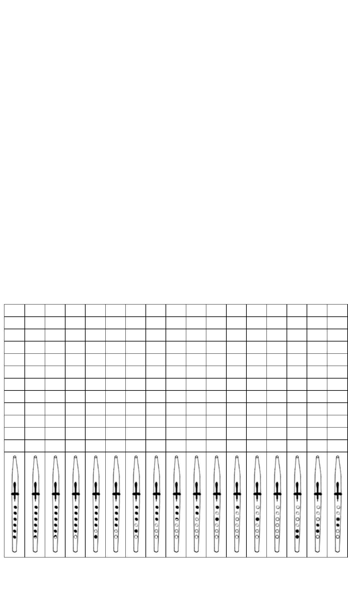 NATIVE AMERICAN FLUTE KEYS, FINGERINGS, AND SCALES On the chart below, find your flute's key in the leftmost column. This is the lowest note it can play, termed its root. Your flute should be able to play each note in the row to the right, which represents a chromatic scale. Some fingerings are difficult, however, and are played with partiallycovered holes. (Depending on its construction, not every NA flute can easily play every note in the chromatic scale or play the highest notes.) The fingering for each note is indicated in the lowermost row containing the flute diagrams. Note that some holes are half or partlycovered. The pentatonic minor scale for each key is shown in red in it's row to the right. The pentatonic scale is a fivenotes per octave scale (the sixth note is the same as the root, but an octave above). Pentatonic scales are common in much folk, Asian, and ancient European music. Almost all traditional NA flute music was composed for the pentatonic minor scale, and NA flutes are constructed to play it easily in tune. A A# B C C# D D# E F F# G G# A A# B C C# G# A A# B C C# D D# E F F# G G# A A# B C G G# A A# B C C# D D# E F F# G G# A A# B F# G G# A A# B C C# D D# E F F# G G# A A# F F# G G# A A# B C C# D D# E F F# G G# A E F F# G G# A A# B C C# D D# E F F# G G# D# E F F# G G# A A# B C C# D D# E F F# G D D# E F F# G G# A A# B C C# D D# E F F# C# D D# E F F# G G# A A# B C C# D D# E F C C# D D# E F F# G G# A A# B C C# D D# E B C C# D D# E F F# G G# A A# B C C# D D# A# B C C# D D# E F F# G G# A A# B C C# D The diatonic major scale is shown in blue for each key in it's row to the right. The diatonic scale is a sevennotes per octave scale (the eighth note is the same as the root, but an octave above). Diatonic scales are the basis of Western classical music, allowing construction of various intervals (thirds, fifths, etc.) While any wellconstructed NA flute can play a diatonic scale in tune, one note's fingering is difficult. The note (RE) one whole tone (two semitones) above the root must be played by barely covering the lowermost hole of the flute. A A# B C C# D D# E F F# G G# A A# B C C# G# A A# B C C# D D# E F F# G G# A A# B C G G# A A# B C C# D D# E F F# G G# A A# B F# G G# A A# B C C# D D# E F F# G G# A A# F F# G G# A A# B C C# D D# E F F# G G# A E F F# G G# A A# B C C# D D# E F F# G G# D# E F F# G G# A A# B C C# D D# E F F# G D D# E F F# G G# A A# B C C# D D# E F F# C# D D# E F F# G G# A A# B C C# D D# E F C C# D D# E F F# G G# A A# B C C# D D# E B C C# D D# E F F# G G# A A# B C C# D D# A# B C C# D D# E F F# G G# A A# B C C# D DO RE MI FA SO LA TI DO re mi