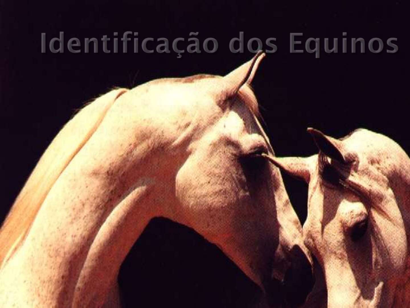 Identificação dos Equinos Nomenclatura Zootécnica Anca Costado Flanco Crista Garupa Tetos Jarrete Castanha Paleta Peito Cilhadouro Ganacha Narina Focinho Fronte Orelha Anca Costado Flanco Crina Nádega Tetos Jarrete Castanha Paleta Peito Cilhadouro Ganacha Narina Focinho Fronte Boleto Coroa Quartela Canela Casco Joelho Soldra Garupa Cernelha Dorso Ventre Pescoço RESENHA É a descrição pormenorizada de características visíveis na pelagem dos equinos Resenhar um animal é definir sua pelagem, além de descrever e assinalar minuciosamente todas as particularidades observadas em seu corpo Imprescindível para registro genealógico e exames de AIE PELAGENS DOS EQUINOS Fatores que alteram a cor das pelagens Sexo: – Garanhões e éguas prenhes apresentam a pelagem com aspecto brilhante, tonalidade mais firme e pêlo mais liso, em virtude da ação hormonal. Idade: – Algumas pelagens modificam com o avançar da idade PELAGENS DOS EQUINOS Fatores que alteram a cor das pelagens Nutrição: – Animais mal nutridos apresentam pelagem opaca e ressecada. Estação do ano e clima: – Inverno: os eqüinos apresentam pêlos maiores, mais espessos e opacos – Verão: a pelagem fica com tonalidade mais viva e os pêlos ficam curtos e brilhantes Classificação das Pelagens CATEGORIA TIPO Simples e uniformes Branca Preta Alazã Simples e uniformes com crina, cauda e extremidades pretas Castanha Baia Zaina Compostas Tordilha Rosilha Lobuna Conjugadas Pampa Persa Simples e uniformes Pelagens É a pelagem avermelhada em que o pêlo do corpo, crina, cauda membros apresentam a mesma tonalidade. É a pelagem em que a tonalidade é homogênea, semelhante à borra do café. A crina, cauda e membros apresentam a mesma tonalidade do resto do corpo. Esta pelagem pode ser confundida com o preto e o zaino quando, ao sol, apresenta reflexos para o vermelho. É a pelagem em que o pêlo do corpo, crina, cauda e membros apresentam a mesma tonalidade. Simples e uniformes com crina, cauda e extremidades pretas Pelagens Compostas Pelagens É a pelagem que apresenta a cor básica, com infiltração progressiva de pêlos brancos e de uma maneira homogênea em todo o corpo. Esta pelagem se caracteriza pelo seu aparecimento a partir do 3º ou 4º mês de idade do potro e sempre em sentido antero-posterior, ou seja, da cabeça para o corpo. É a pelagem básica castanha, preta ou alazã, com grande infiltração de pêlos brancos pelo corpo, com incidência maior nos flancos e virilhas. A distribuição dos pêlos pelo corpo poderá ser homogênea, mas a cabeça e as extremidades mantêm a pelagem básica alazã ou castanha. Seu aparecimento se caracteriza postero-anterior, ou seja, de trás para frente e também por ser observada com maior intensidade nas partes posteriores do corpo. É a pelagem acinzentada ou esfumaçada e que, por esse motivo, é também conhecida como pêlo de rato e deve apresentar as extremidades pretas. Conjugadas Pelagens Geralmente a cor branca não ultrapassa a região dorsal entre a cernelha e a cauda. Pelo menos uma ou todas as patas são escuras. O branco é irregular e um tanto espalhado. As marcas da cabeça são distintas. A cor escura cobre um ou ambos os flancos, e a cor branca vai ultrapassar o dorso entre a cernelha e a cauda. Geralmente todas os quatro membros são brancos, pelo menos abaixo do joelho e curvilhão. As manchas são irregulares e distintas tais como formas ovais ou padrões redondos que se estendem abaixo do pescoço e peito, dando a aparência de um escudo. A cauda, pode conter duas cores. Estes cavalos combinam as características de ambos os overo e tobiano. Especiais Pelagens É aquela de tom amarelo ouro, apresentando a crina e a cauda obrigatoriamente brancas e os membros com a mesma tonalidade do corpo. É aquela de tom creme, apresentando a crina, a cauda e os membros com a mesma tonalidade do corpo. Marcas na Cabeça Marcas na Cabeça Estrela - mancha branca na fronte Filete - pequena faixa no chanfro de pelos ou pele brancos Cordão – faixa intermediaria de pelos ou pele branca no chanfro Listra – faixa bem avantajada de pelos ou pele brancos Ladre – toca as narinas Beta – não toca as narinas Marcas na Cabeça Pbs acima da LSO Pequena estrela acima da LSO Marcas na Cabeça Grande estrela Estrela em forma de coração Marcas na Cabeça Estrela alongada e pbs abaixo Estrela na LSO e pbs a direita Marcas na Cabeça Estrela com cordão Estrela com listra Estrela listra Ladre Beta Combinação Marcas nos Membros Coroa Boleto Canela Coroa e Boleto Arminhado Remoinhos (Rodopio) Espigas Castanhas Estrutura localizada na parte medial de cada membro Cascos Sinais Adquiridos Cicatrizes Marcação por congelamento (N2) ou a fogo Tatuagem