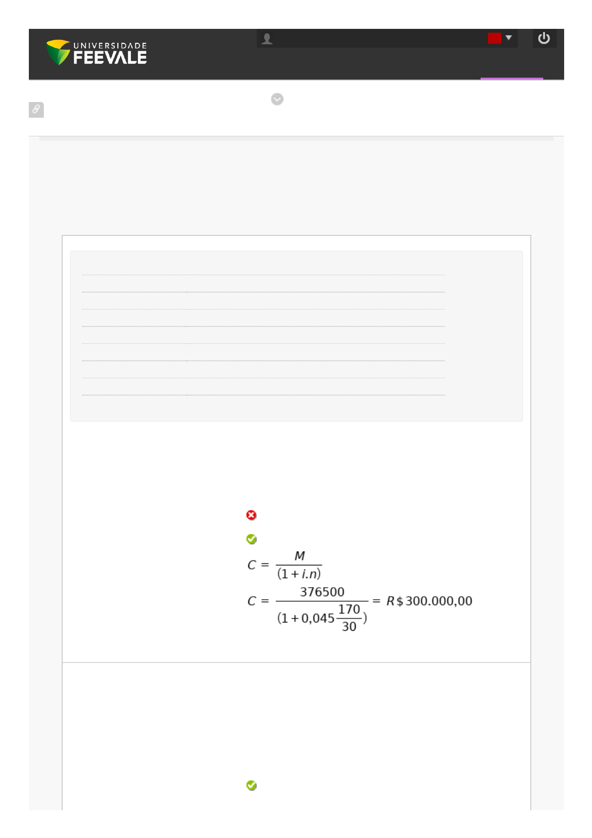 30/07/2020 Revisar envio do teste: Atividade de estudo - Lista de ... https://feevale.blackboard.com/webapps/assessment/review/review.jsp?attempt_id=_1039487_1&course_id=_92787_1&content_id=_1440240_1… 1/3 Revisar envio do teste: Atividade de estudo - Lista de exercícios – Juros Simples 20203 - EaD - MATEMÁTICA FINANCEIRA - EAD Roteiro de Estudo 2 - Juros Simples Revisar envio do teste: Atividade de estudo - Lista de exercícios – Juros Simples Usuário CAROLINE APARECIDA HERRMANN WAGNER (GRAMADO) Curso 20203 - EaD - MATEMÁTICA FINANCEIRA - EAD Teste Atividade de estudo - Lista de exercícios – Juros Simples Iniciado 30/07/20 15:49 Enviado 30/07/20 16:40 Status Completada Resultado da tentativa 0 em 0 pontos Tempo decorrido 50 minutos Resultados exibidos Respostas enviadas, Respostas corretas, Comentários Pergunta 1 Resposta Selecionada: [Sem Resposta] Resposta Correta: Feedback da resposta: Calcule o valor do capital que, aplicado a uma taxa de 4,5% ao mês, durante 170 dias, gerou um Montante de R$ 376.500,00. R$ 300.000,00 Pergunta 2 Resposta Selecionada: Calcule o valor do montante acumulado em 12 meses a partir de um principal de R$ 10.000,00, aplicado com uma taxa de 12,00% a.a. no regime de juros simples. R$ 11.200,00 A Minha Instituição Cursos 0 em 0 pontos 0 em 0 pontos CAROLINE APARECIDA HERRMANN WAGNER (G... 24 https://feevale.blackboard.com/webapps/blackboard/execute/courseMain?course_id=_92787_1 https://feevale.blackboard.com/webapps/blackboard/content/listContent.jsp?course_id=_92787_1&content_id=_1440212_1&mode=reset https://feevale.blackboard.com/webapps/portal/execute/tabs/tabAction?tab_tab_group_id=_110_1 https://feevale.blackboard.com/webapps/portal/execute/tabs/tabAction?tab_tab_group_id=_2_1 https://feevale.blackboard.com/webapps/login/?action=logout 30/07/2020 Revisar envio do teste: Atividade de estudo - Lista de ... https://feevale.blackboard.com/webapps/assessment/review/review.jsp?attempt_id=_1039487_1&course_id=_92787_1&content_id=_1440240_1… 2/3 Resposta Correta: Feedback da resposta: R$ 11.200,00 Pergunta 3 Resposta Selecionada: [Sem Resposta] Resposta Correta: Feedback da resposta: Aplicou-se, em um regime de juros simples, R$ 10.000,00 durante cinco meses e doze dias e obteve-se R$ 10.270,00. Qual a taxa de juros anual? 6% a.a. Pergunta 4 Resposta Selecionada: [Sem Resposta] Resposta Correta: Feedback da resposta: Uma pessoa deve dois títulos no valor de R$ 25.000,00 e R$ 56.000,00 cada. O primeiro título vence de hoje a 2 meses, e o segundo um mês após. O devedor deseja propor a substituição destas duas obrigações por um único pagamento ao �nal do 5o mês. Considerando 3% ao mês a taxa corrente de juros simples, determinar o valor deste pagamento único, considerando como data focal o �nal do quinto mês. R$ 86.610,00 Pergunta 5 0 em 0 pontos 0 em 0 pontos 0 em 0 pontos 30/07/2020 Revisar envio do teste: Atividade de estudo - Lista de ... https://feevale.blackboard.com/webapps/assessment/review/review.jsp?attempt_id=_1039487_1&course_id=_92787_1&content_id=_1440240_1… 3/3 Quinta-feira, 30 de Julho de 2020 16h40min10s BRT Resposta Selecionada: [Sem Resposta] Resposta Correta: Feedback da resposta: Calcule o número de meses necessário para um capital dobrar de valor, com uma taxa de juros de 2,00% a.m. no regime de juros simples. 50 meses. ← OK javascript:launch('/webapps/blackboard/content/listContent.jsp?content_id=_1440212_1&course_id=_92787_1&nolaunch_after_review=true');