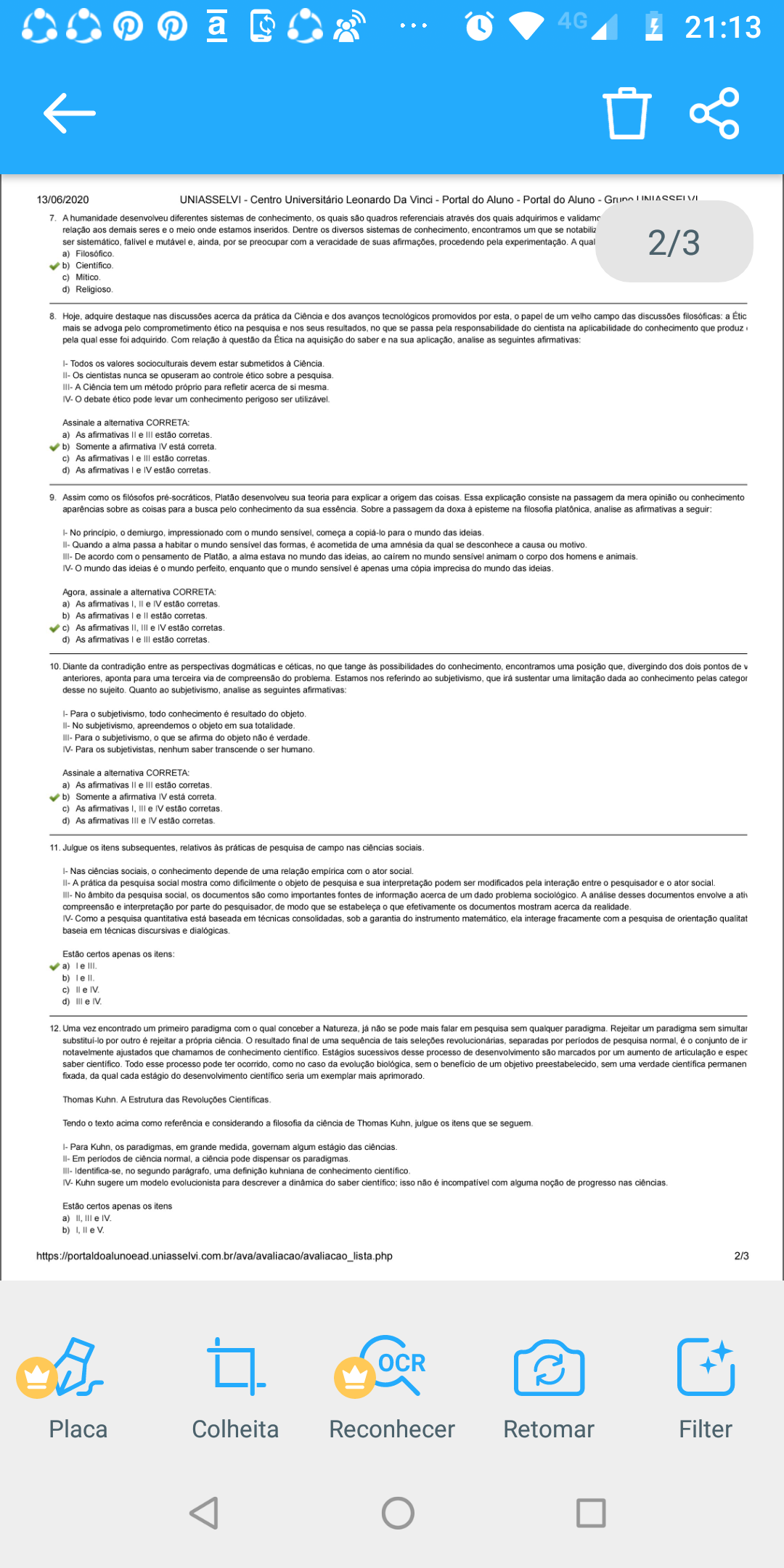 Uma vez encontrado um primeiro paradigma com o qual conceber a Natureza, já não se pode mais falar em pesquisa sem qualquer paradigma. Rejeitar um paradigma sem simultaneamente substituí-lo por outro é rejeitar a própria ciência, resultado final de uma sequência de tais seleções revolucionárias separadas por períodos de pesquisa normal e um conjunto de irnotavelmente ajustados que chamamos de conhecimento científico. Tendo o texto acima como referência e considerando a filosofia da ciência de Thomas Kuhn, julgue os itens que se seguem. I. Para Kuhn, os paradigmas, em grande medida, governam algum estágio das ciências. II. Em períodos de ciência normal, a ciência pode dispensar os paradigmas. III. Identifica no segundo parágrafo uma definição kuhniana de conhecimento científico. IV. Kuhn sugere um modelo evolucionista para descrever a dinâmica do saber científico: isso não é incompatível com alguma noção de progresso nas ciências. a) Estão certos apenas os itens I e IV. b) Estão certos apenas os itens II e III. c) Estão certos apenas os itens III e IV. d) Estão certos apenas os itens I, II e III.