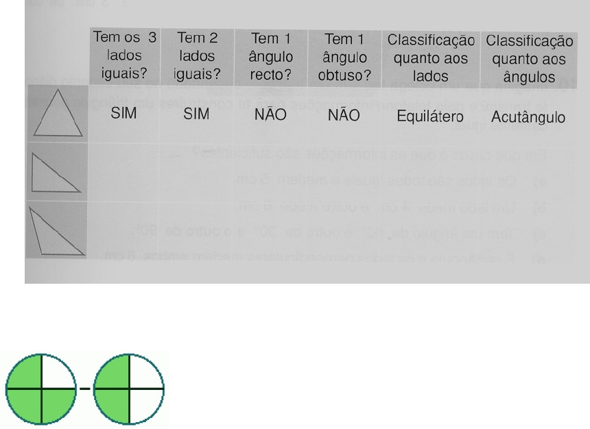 1) Num país, a eleição para presidente ocorre a cada 5 anos e para prefeito, a cada 4 anos. Se em 2012 houve coincidência das eleições para esses cargos, qual o próximo ano em que elas voltarão a coincidir? 2) Coloque V (verdadeiro) ou F (falso); ( ) Todo número natural é múltiplo de 1. ( ) Todo número natural é múltiplo de zero. ( ) O número zero é múltiplo de todos os números. ( ) O conjunto dos múltiplos de 3 é o conjunto dos números ímpares. ( ) Todo número primo é ímpar. ( ) Alguns números primos são ímpares. ( ) 1 é primo e ímpar. ( ) Todo número múltiplo de 4 é múltiplo de 2. ( ) Todo múltiplo de 2 e 5 tem como algarismos das unidades o 0. 3) Observa o quadro e completa-o, relembrando a classificação de triângulos quanto ao comprimento dos lados e quanto à amplitude dos ângulos. 4) Cada área colorida em cada círculo representa uma fração de um inteiro. Qual é a alternativa que representa a diferença destas frações indicada na figura? a) 1/2 b) 3/4 c) 1/4 d) 4/4 5) Para encher um álbum de figurinhas, Karina contribuiu com 1/6 das figurinhas, enquanto Cristina contribuiu com ¾ das figurinhas. Com que fração das figurinhas as duas juntas contribuíram?