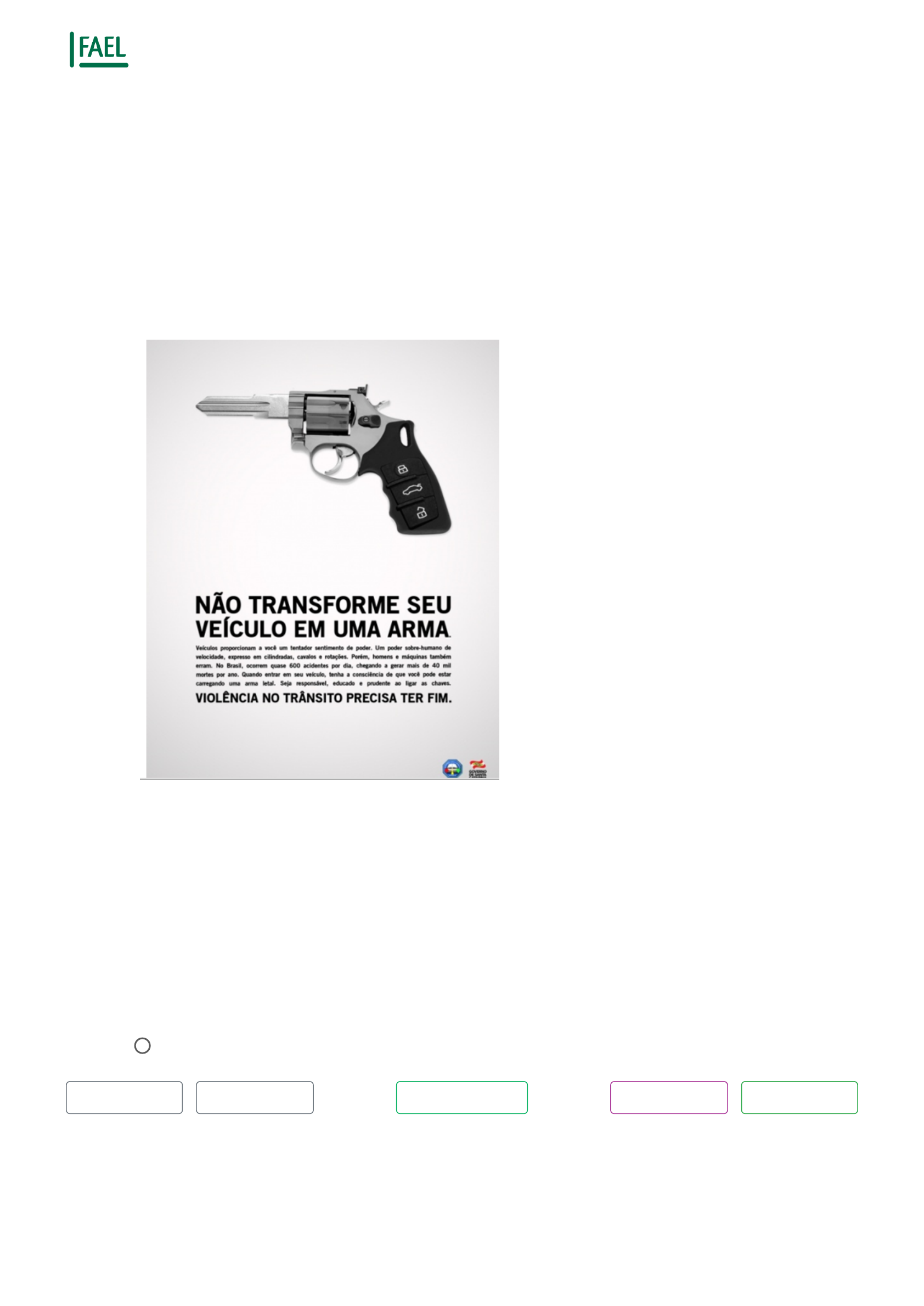 / Resultado Aluno: Emerson Camargo Vaz Prova de O Papel do Gestor de Trânsito - Objetiva - Tentativa 1 de 3 Questão 9 de 10 Analise a �gura a seguir: Analise a �gura a seguir, e assinale a alternativa que contemple o princípio da mensagem contemplado. A - Concretude B - Credibilidade C - Emoção D - Simplicidade Resposta correta E - Surpresa Respondida Voltar Questões Referência Reportar erro Avançar https://firequiz.fael.edu.br/prova?question_number=8 https://firequiz.fael.edu.br/prova/questoes /