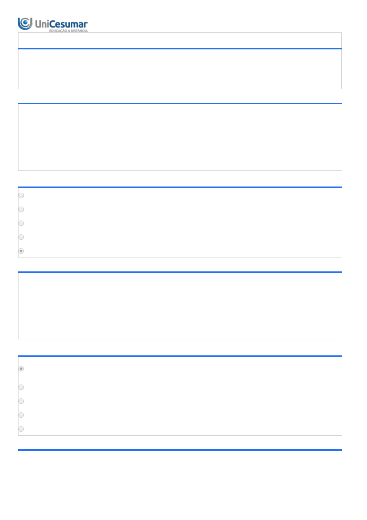 18/03/2020 Unicesumar - Ensino a Distância 1/3 Nivelamento de Biologia - ATIVIDADE 2 - 51/2020 Período:04/03/2020 08:00 a 05/04/2020 23:59 (Horário de Brasília) Status:ABERTO Nota máxima:0,50 Gabarito:Gabarito será liberado no dia 06/04/2020 00:00 (Horário de Brasília) Nota obtida: 1ª QUESTÃO Os polissacarídeos são carboidratos complexos formados por muitas unidades de monossacarídeos. Estas moléculas, são responsáveis pela reserva energética. Nos vegetais, por exemplo o polissacarídeo de reserva energética é chamado amido. KAMEI, Marcia Cristina de Souza Lara. Nivelamento de Biologia. Maringá-Pr.: UniCesumar, 2017. 116 p. Considerando o texto acima, podemos afirmar que nos animais o polissacarídeo de reserva energética é o: ALTERNATIVAS Quitina. Glicose. Celulose. Sacarose. Glicogênio. 2ª QUESTÃO As células são constituídas de moléculas combinadas em uma ordem precisa. Os componentes químicos das células podem ser classificados em inorgânicos, que corresponde a água e os sais minerais, e em orgânicos que são os ácidos nucléicos, carboidratos, lipídios e proteínas. KAMEI, Marcia Cristina de Souza Lara. Nivelamento de Biologia. Maringá-Pr.: UniCesumar, 2017. 116 p. Considerando o texto acima, sobre a a composição química das células, é correto afirmar que: ALTERNATIVAS A água é apenas um meio de transporte, em que as diversas substâncias presentes nas células estão estão dissolvidas. Os glicerídeos são considerados moléculas de reserva energética tanto em animais, quanto em vegetais. As proteínas são polímeros de aminoácidos usados para exclusivamente para fins estruturais. Lipídios são elementos altamente solúveis em meio aquoso e tem função energética. Carboidratos são os principais elementos estruturais das células. 3ª QUESTÃO 18/03/2020 Unicesumar - Ensino a Distância 2/3 As proteínas são macromoléculas formadas por aminioácidos, que se ligam por meio de ligações peptídicas. Estas exercem ainda inúmeras funções no organismo, devido a sua estrutura. A respeito da estrutura e do papel biológico das proteínas, avalie as afirmativas abaixo: I. Proteínas são polímeros de aminoácidos que apresentam, em seu estado nativo, uma estrutura tridimensional linear, mantida por ligações covalentes chamadas de ligações peptídicas. II. As proteínas atuam exclusivamente com ação enzimática. III. Proteínas são moléculas complexas, com estruturas diversificadas chamadas de primárias, secundárias, terciárias e quaternárias. IV. Quando submetidas em altas temperaturas as proteínas desnaturam e melhoram sua atividade biológica. V. Uma das funções das proteínas é a atividade enzimática. KAMEI, Marcia Cristina de Souza Lara. Nivelamento de Biologia. Maringá-Pr.: UniCesumar, 2017. 116 p. É correto o que se afirma em: ALTERNATIVAS I, apenas. III, apenas. V, apenas. III e V, apenas. III e IV, apenas. 4ª QUESTÃO As Enzimas são substâncias orgânicas de natureza normalmente proteica, que participam de atividades intra ou extracelular e com funções diversas. As enzimas podem ainda, se ligar a outros compostos que irão sofrer a reação química, por meio de regiões específicas e que formam o complexo enzima/substrato. KAMEI, Marcia Cristina de Souza Lara. Nivelamento de Biologia. Maringá-Pr.: UniCesumar, 2017. 116 p. Considerando o texto acima, com relação à estrutura e atividade enzimática, assinale a alternativa correta. ALTERNATIVAS As enzimas não podem atuar em ambientes ácidos. Uma determinada enzima pode promover reações químicas em qualquer molécula. As enzimas atuam acelerando as reações químicas no interior dos sistemas biológicos. As moléculas que sofreram a ação de uma enzima são chamadas de produto da enzima. Enzimas sofrem ação da temperatura em seu mecanismo de ação, pois são carboidratos que não toleram altas temperaturas. 5ª QUESTÃO 18/03/2020 Unicesumar - Ensino a Distância 3/3 Os ácidos nucléicos são macromoléculas formadas por nucleotídeos, responsáveis pela formação do DNA e do RNA, elementos importantes das células. Tem esta denominação devido a seu caráter ácido e por serem encontrados no núcleo da célula. Os ácidos nucléicos são essenciais, uma vez que, a partir das moléculas de DNA e RNA é que são sintetizadas proteínas, multiplicação das células e a transmissão de características hereditárias. KAMEI, Marcia Cristina de Souza Lara. Nivelamento de Biologia. Maringá-Pr.: UniCesumar, 2017. 116 p. Considerando o texto acima avalie as afirmativas abaixo a respeito dos ácidos nucléicos. I. Apenas o DNA é encontrado no núcleo de células eucariontes. II. Ácidos nucléicos são polímeros de aminoácidos. III. Ácidos nucléicos são polímeros de nucleotídeos. IV. Os nucleotídeos que formam o DNA se diferenciam dos nucleotídeos de RNA apenas em sua pentose. V. Adenina, guanina, alanina, timina e glicose são variedades de bases nitrogenadas encontradas nos nucleotídeos. É correto o que se afirma em: ALTERNATIVAS I, apenas. III, apenas. IV, apenas. II e III, apenas. III e V, apenas. 6ª QUESTÃO As células são formadas por moléculas orgânicas que, em sua maioria são macromoléculas. Macromoléculas são moléculas grandes, e que são formadas por unidades menores, denominadas de monômeros. Associe as duas colunas, relacionadas as Macromoléculas a seus respectivos Monômeros. KAMEI, Marcia Cristina de Souza Lara. Nivelamento de Biologia. Maringá-Pr.: UniCesumar, 2017. 116 p. Macromoléculas Monômeros A) Proteínas ( ) Monossacarídeos B) Polissacarídeos ( ) Nucleotídeos C) Ácidos nucléicos( ) Aminoácidos A sequência correta é: ALTERNATIVAS B, C, A C, A, B A, B, C B, A, C A, C, B