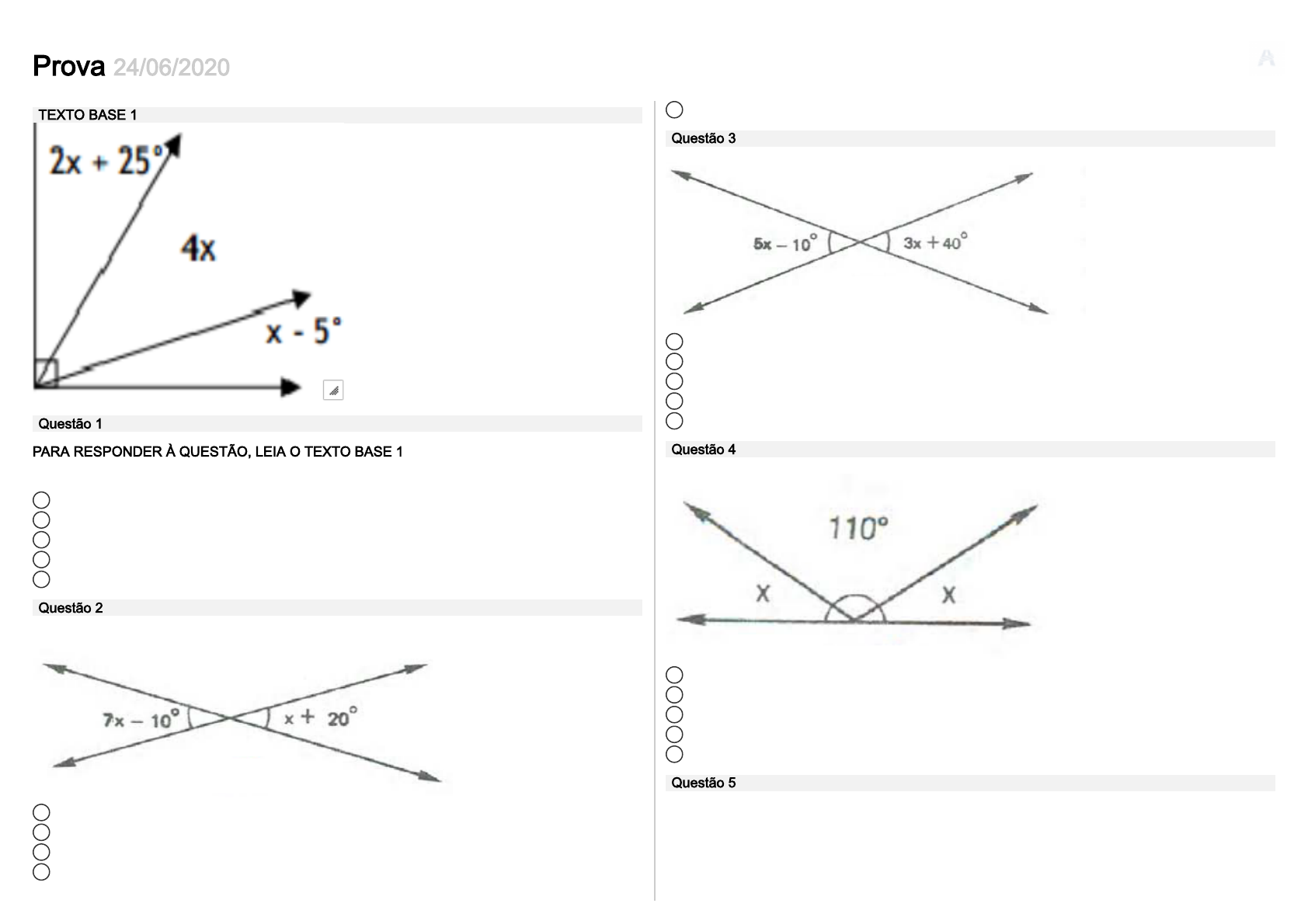 22/06/2020 https://cpbprova.com.br/empresas_provas_imprimir / Prova 24/06/2020 a b c d e a b c d e a b c d e a b c d e TEXTO BASE 1 Questão 1 PARA RESPONDER À QUESTÃO, LEIA O TEXTO BASE 1 Determine o valor de x: 10º 20º 30º 45º 90º Questão 2 Calcule o x: 30º 15º 5º 12º 6º Questão 3 Calcule o x: 50º 25º 30º 15º 5º Questão 4 Calcule o x: 180º 90º 40º 35º 30º Questão 5 Calcule o x: 22/06/2020 https://cpbprova.com.br/empresas_provas_imprimir / a b c d e a b c d e a b c d e a b c d e 90º 80º 60º 30º 20º Questão 6 Calcule a medida dos ângulos indicados: X = 30º X = 60º X = 25º X = 50º X = 23º Questão 7 Calcule a medida dos ângulos indicados: X= 15º ; M = 100º ; N = 55º X= 45º ; M = 125º ; N = 45º X= 45º ; M = 100º ; N = 55º X= 15º ; M = 125º ; N = 55º X= 45º ; M = 125º ; N = 55º Questão 8 As medidas de dois ângulos opostos pelo vértice são expressas em graus por: 4x + 10º e 2x + 40º. Quanto vale x? 10º 15º 20º 25º 30º Questão 9 Os valores de x, y, z e w, na figura abaixo, são, respectivamente: 22/06/2020 https://cpbprova.com.br/empresas_provas_imprimir / a b c d e a b c d e 35º, 60º, 95º, 60º 35º, 40º, 95º, 40º 35º, 50º, 95º, 50º 95º, 35º, 50º, 65º Nenhuma das alternativas anteriores. Questão 10 Calcule o valor de x: 100º 95º 85º 105º Nenhuma das alternativas