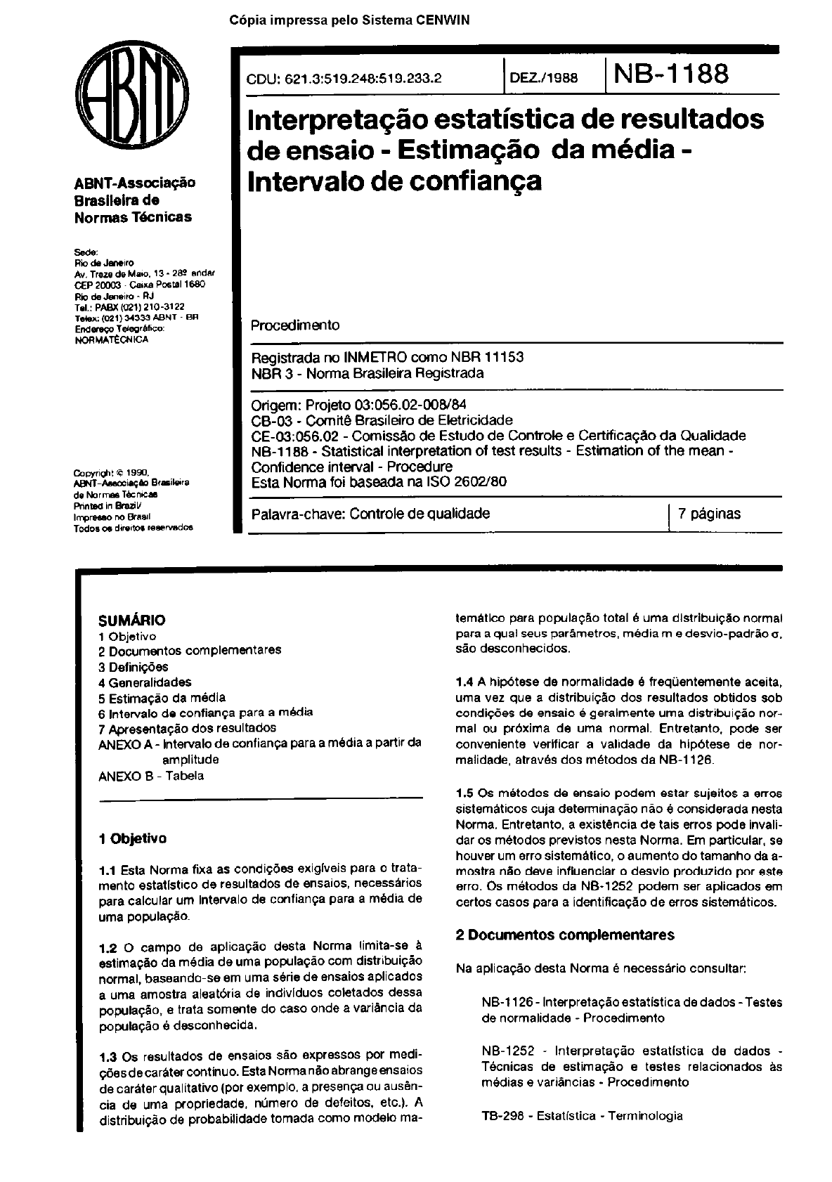 Copia impressa pelo Sistema CENWIN ABNT-Associaeo Brasileira de Normas Tbcnicas CDU: 621.3:519.248:519.233.2 1 DEZ./l988 1 NB-1 188 Interpreta@o estatistica de resultados de ensaio - Estima@o da media - lntervalo de confianqa Registrada no INMETRO coma NBR 11153 NBR 3 - Norma Brasileira Registrada Origem: Projeto 03:056.02-oOfYEi4 CB-93 - Cwnit6 Brasilefro de Eletricidade CE-Cx3:056.02 Comistio de Estudo de Controk? e Certifica@o da Qualidade NB-1188 - Statistical interpretation of test results - Estimation of the mean - Confidence interval - Procedure Esta Norma foi baseada na IS0 2602/80 Palavra-chave: Controle de qualidade 7 pAginas SUMhlO 1 Objetivo 2 Documentos complementares 3 Defini@es 4 Generalldades 5 Estima$io da media 6 lntetvalo da confiat?@ para a media 7 Aptesant@o dos resultados ANMO A - lntervalo de confiarya para a media a partir da amplitude ANEXO B Tabela 1 Objetivo 1.1 Esta Norma fwa as condigdes exlgiveis para o trata- mento estatistico da resultados de ensaios. necessaries para calcular urn lntervalo de confianga para a media de uma popula@o. 1.2 0 campo de aplica$Ho desta Norma limita-se a astirnaCHo da media de urna populaCao corn distribuiteo normal, baseando-se em urna serie de ensaios aplicados a urns amostra aleatrkia da individuos cotetados dessa popul@o, e trata somante do case onde a variancia da popula@o B desconhecida. 1.3 OS resultados de ensaios SHO expresses por medi- @esdecaratercontinuo. EstaNonanHoabrangeensaios de carater qualitatiio (par exempl0, a presenpa ou ausan- cia de uma fxopriedade. nrimero de defeitos. etc.). A distrlbui@io da probabilidade tomada como modelo ma- temstko pare popula@o total 6 uma dlstribui@o normal para a qua1 seus par&metros, media m e desvio-padrfio o, s20 desconhecidos. 1.4 A hip6tese de normalidade e freqijentemente aceita. uma vez que a distrfbuiqao dos resultados obtidos sob condi@es de ensaia a geralmente urns distribui$Bo nor- mal ou pr6xima da uma normal. Entretanto. pode ser convenienta verlflcar a validade da hlp6tese de nor- malidade, atraves dos metodos da NE-1 126. 1.5 OS metodos de ensaio podem estar sujeitos a enos sistematicos cuja detenina$Ho n&o 6 considerada nesta Norma. Entretanto. a existencia de tais erros pode invali- dar os metodos previstos nesta Norma. Em particular. se houver urn erro sistematico. o aumento do tamanho da a- mostra n&o deve influenclar o desvfo produzido por este erro. OS metados da NB-1252 podem ser aplicados em certos cases para a identiffca@o de erros siatematicos. 2 Documentos complementares Na aplica@o desks Norma B necessario consultar: NB-1126 - Interpreta$8oestatistica de dados -Testes de normalidade - Procedimento NB-1252 lnterpretaplo estatistica de dados Tecnicas de estima@o e testes relacicnados as m4dias s variancias _ Procedimanto TB-298 - Estatistica - Temtinologia 2 C6pia impressa pelo Sistema CENWIN NB-1188/1988 3 Defini@es OS terrnos Mcnicos utilizados nesta Norma s80 detinidos “a TB-29.9. 4 Generalidades 4.1 OS m&ados de ensaio geralmente pev4em a reali- za@~ de uma s4rie repetitiva de medl@as que s80 efe- tuadas: a) sobre o mesmo item (quando o ensaio 4 Go-des- trutivo); b) sobre por@es distintas de urn material muito ho- mog6neo (urn IMquido. por exemplo); c) sobre itens dlsthtos. amostrados de urn agregado corn uma determinada variabilidade. Nota: Noa dds prirneiros c-. 08 desviw entm w reMtedo(, obtldos dependem somnte de repetibiridede do m&do. No tarcalm ~890, eles dependem ternbern da vaiatMida& do ~r+.w-io matWal. 4P 0 tratamento estatistico dos resultados permite 0 cakulo de urn htervalo que ccot&n. corn uma determina- da probabilidade. a media da popula@o de resultados que seria obtida a partir de urn ntimero muito grande de determina@es. efetuadas sob as meSma.6 condl@3s. NO CBSO de itens corn vartabilidade, esta Norma assume que as hdivlduos nos quais as verlfka~des S&I efetuadas constituem-se em uma amostra aleat6ria da pop&@ original e podem ser considerados coma independentes. 4.3 0 intezvalo cskulado desta forma 6 chamado de inten/alodecontian~adam6dia.Asscciadoaesteintervalo. hB urn nivel de confianqa (algumas vezes denominado coeficiente de confian$a). que 6 a probabilidade. usualmente expressa em porcentagam, deque o intervalo realments contenha a media da popula$~o. N&a Norma s80 fomecidas Tab&s apenas pars OS nlveis de 95% e 99% (VW Anexo 6). 4.4 OS c~kulos podem ser slmpliticsdos par uma mudan- $a da origem cu da unidade dos resultados de ensaio, mas n~oBrecomendbveloarredondamentodestesresultados. 4.5 Nio 6 permltido o descarte de qualquer observaqgo ou 8 apllcap&~ de qualquer corre$Bo sem justificativas corn base experimental, Mcnica ou em outros motives evtdentes, que devem SW claramente registrados. 5 Estimago da media 6.1 Caeo de obrewac6es 8160 agrupadas sm claSSOs al., Ap& o descarte de quaisquer obsewa@es duvido- sas (VW 4.5). a s&k compreende n mediG& x, (onde i = 1,2.3. , n), algumss das quais podem ter 0 mesmo valor. 6.1.2 A media m da distribui@o normal 6 estimada pela media aritmbtica W das n obsewap6es. 52 Case de observa@es agrupadas em clawss 5.21Quandoonljmerodeobserva~6esforsuflcientemen- te grande (acims de 50 par exemplo), pcde ser vantajoso agrupblas em classes de mesmo intervalo. 5.22 A freqO&cis da i-6sina classe. isto 6. o ntimero de observa@es da classe i, 6 indicada por ni. 5.23 Sendo k o ntimero de classes, tern-se: n= 5”: 5.24 0 pato m&dio da classe i 6 indicado por y.. A media, m d enGo estimada pela m6dia ponderada de todos as pontos m6dios das classes: 6 lntervalo de confiaqa para a media 0 intervalo de contian@? para a media da popula~Ho 6 cakulado a partir das estimativas da media e do desvio- padrgo. Nota: 0 m&do dtemetlvo de calcular 0 intewalo de con(ian~a atraveS do “SO da amplitude 4 &do no Anexo A. 6.1 EstimaCgo do desvio-pedr6o (1.1.1 csso de obseNeg6ea n60 agrupades A estimativa do desvio-pad& (r. cakulada a partir do somatdrio dos quadrados dos desvios da media arltm& lica, 6 dada pela f&mul