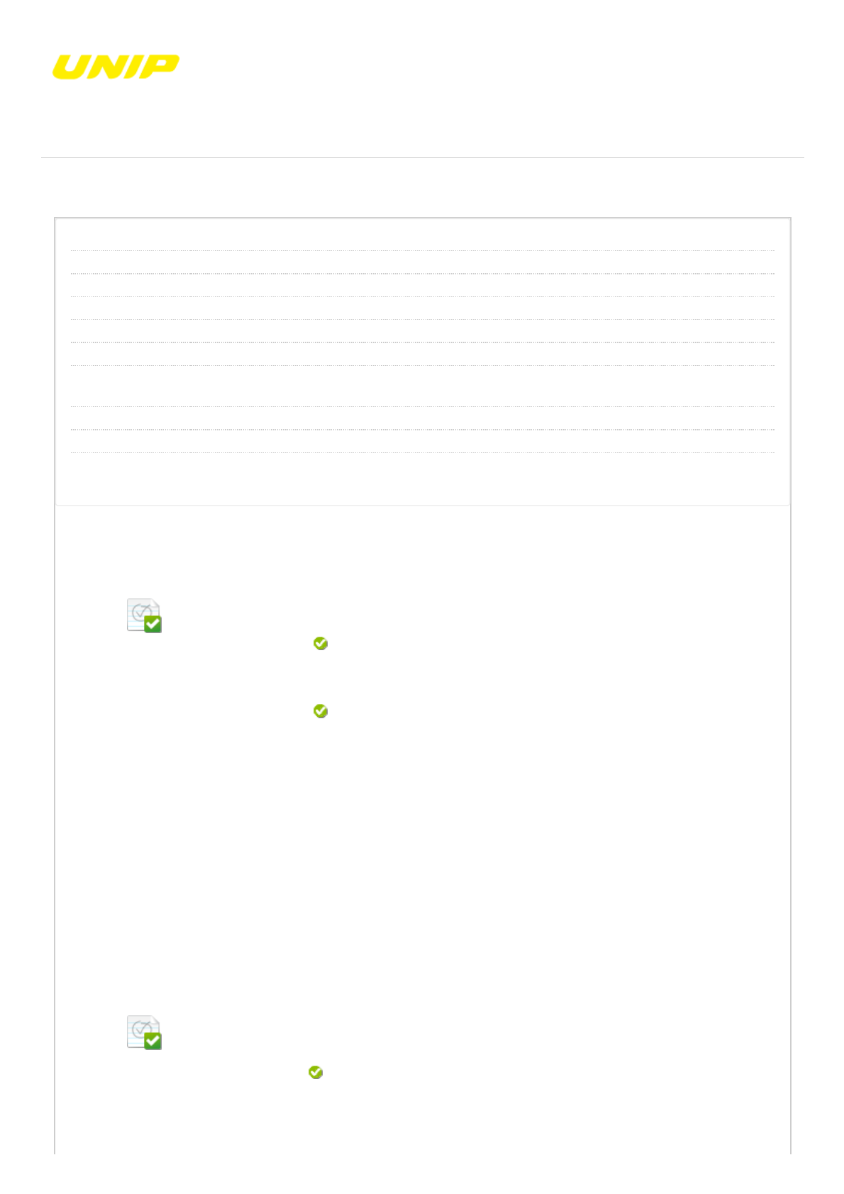 14/08/2020 Revisar envio do teste: ATIVIDADE TELEAULA I – 6540-60_... https://ava.ead.unip.br/webapps/assessment/review/review.jsp?attempt_id=_41702655_1&course_id=_106402_1&content_id=_1437108_1&retur… 1/3 Revisar envio do teste: ATIVIDADE TELEAULA IAUDITORIA 6540-60_59801_R_20202 CONTEÚDO Usuário suelizete.mauro @aluno.unip.br Curso AUDITORIA Teste ATIVIDADE TELEAULA I Iniciado 14/08/20 12:25 Enviado 14/08/20 12:31 Status Completada Resultado da tentativa 0 em 0 pontos Tempo decorrido 5 minutos Autoteste O aluno responde e o resultado do aluno não é visível ao professor. Resultados exibidos Todas as respostas, Respostas enviadas, Respostas corretas, Comentários, Perguntas respondidas incorretamente Pergunta 1 Resposta Selecionada: b. Respostas: a. b. c. d. e. Feedback da resposta: A atividade fundamental do auditor independente é: Expressar uma opinião sobre as demonstrações contábeis. Orientar o diretor �nanceiro da empresa auditada. Expressar uma opinião sobre as demonstrações contábeis. Localizar as fraudes que estejam ocorrendo. Conferir a conta “Caixa”. Conferir o patrimônio da empresa. Resposta: b) Pergunta 2 Resposta Selecionada: d. Respostas: a. Entre as opções a seguir, não é de competência da auditoria interna examinar os seguintes objetivos: E�ciência e e�cácia dos pareceres dos auditores independentes. E�cácia das informações físicas, contábeis e �nanceiras. CONTEÚDOS ACADÊMICOS BIBLIOTECAS MURAL DO ALUNO TUTORIAISUNIP EAD 0 em 0 pontos 0 em 0 pontos http://company.blackboard.com/ https://ava.ead.unip.br/webapps/blackboard/execute/courseMain?course_id=_106402_1 https://ava.ead.unip.br/webapps/blackboard/content/listContent.jsp?course_id=_106402_1&content_id=_1433450_1&mode=reset https://ava.ead.unip.br/webapps/portal/execute/tabs/tabAction?tab_tab_group_id=_25_1 https://ava.ead.unip.br/webapps/portal/execute/tabs/tabAction?tab_tab_group_id=_27_1 https://ava.ead.unip.br/webapps/portal/execute/tabs/tabAction?tab_tab_group_id=_47_1 https://ava.ead.unip.br/webapps/portal/execute/tabs/tabAction?tab_tab_group_id=_29_1 https://ava.ead.unip.br/webapps/portal/execute/tabs/tabAction?tab_tab_group_id=_10_1 https://ava.ead.unip.br/webapps/login/?action=logout 14/08/2020 Revisar envio do teste: ATIVIDADE TELEAULA I – 6540-60_... https://ava.ead.unip.br/webapps/assessment/review/review.jsp?attempt_id=_41702655_1&course_id=_106402_1&content_id=_1437108_1&retur… 2/3 b. c. d. e. Feedback da resposta: Adequação dos controles internos e das informações físicas. Integridade das informações operacionais, �nanceiras e físicas. E�ciência e e�cácia dos pareceres dos auditores independentes. Emitir relatórios para a melhoria dos processos da companhia. Resposta: d) Pergunta 3 Resposta Selecionada: c. Respostas: a. b. c. d. e. Feedback da resposta: Um dos principais objetivos do auditor interno é: Examinar os controles internos e emitir a sua opinião via relatório. Veri�car a necessidade de aprimorar as normas internas vigentes. Examinar a demonstração do resultado do exercício e emitir o seu parecer. Examinar os controles internos e emitir a sua opinião via relatório. Descobrir todas as irregularidades e emitir relatório sobre o fato. Auxiliar a auditoria externa. Resposta: c) Pergunta 4 Resposta Selecionada: b. Respostas: a. b. c. d. Um dos sistemas que diferenciam o auditor interno do externo é a(o): Volume de testes nos serviços realizados. Forma de avaliar o sistema de controle interno. Volume de testes nos serviços realizados. Forma de se portar na empresa e a sua responsabilidade. Forma de preparar os papéis de trabalho. 0 em 0 pontos 0 em 0 pontos 14/08/2020 Revisar envio do teste: ATIVIDADE TELEAULA I – 6540-60_... https://ava.ead.unip.br/webapps/assessment/review/review.jsp?attempt_id=_41702655_1&course_id=_106402_1&content_id=_1437108_1&retur… 3/3 Sexta-feira, 14 de Agosto de 2020 12h31min17s BRT e. Feedback da resposta: Amplitude dos testes e a emissão de documentos. Resposta: b) ← OK javascript:launch('/webapps/blackboard/content/listContent.jsp?content_id=_1433450_1&course_id=_106402_1&nolaunch_after_review=true');