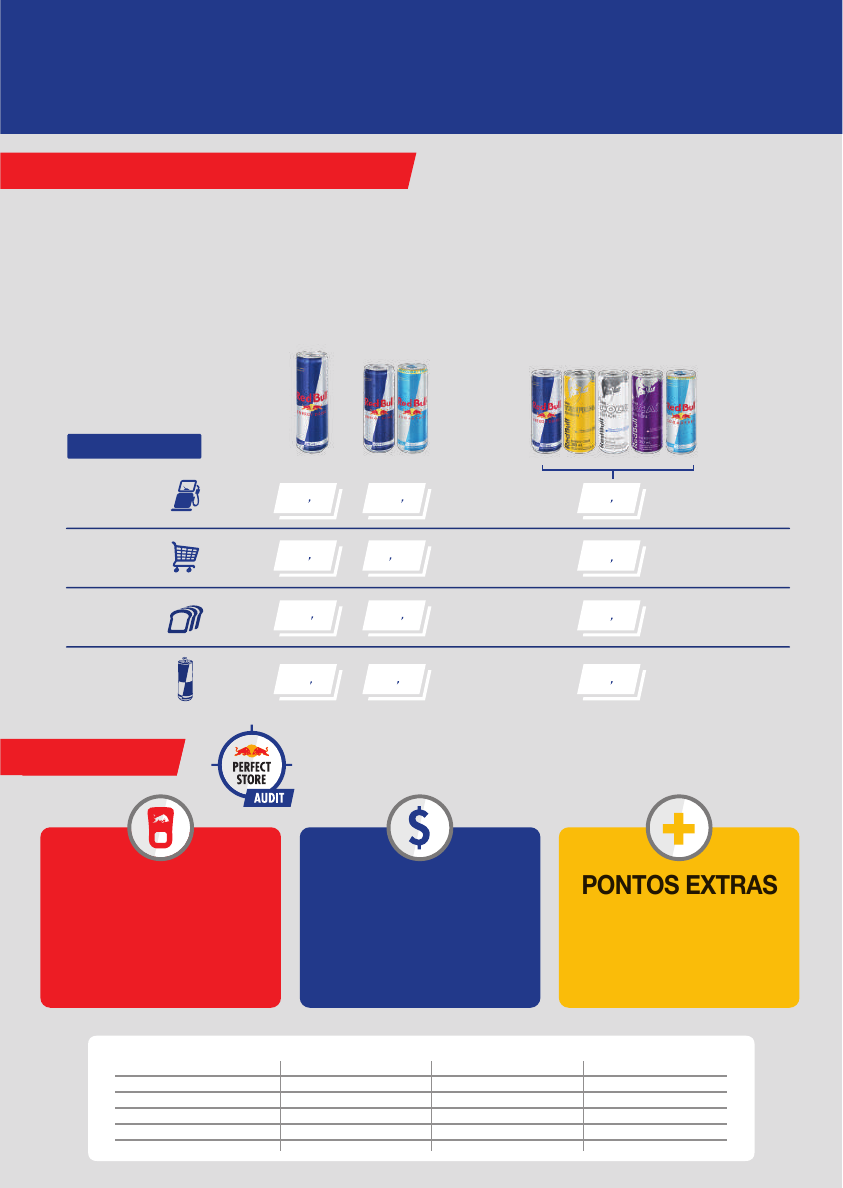 DISPONIBILIDADE E PREÇOS 1299R$ 10 99R$ 10 99R$ 9 99R$1199R$ 1199R$ 12 99R$ 13 99R$ É FUNDAMENTAL GARANTIR O MIX COMPLETO POIS CADA SKU TEM UM PAPEL. REGULAR: DEFENDER LIDERANÇA SABORES: EXPERIMENTAÇÃO E NOVOS USUÁRIOS SEM AÇÚCAR: SAUDABILIDADE E FIDELIZAÇÃO PREÇO É UM DOS PRINCIPAIS CRITÉRIOS DE ESCOLHA DOS CONSUMIDORES NO MOMENTO DA COMPRA, POR ISTO É IMPORTANTE TER O PREÇO CORRETO E VISÍVEL. PREÇO AO CONSUMIDOR CONVENIÊNCIA / FARMÁCIA AUTOSSERVIÇO 7 49R$ 9 49R$ 8 49R$ 9 99R$REGULAR PADARIA ESTRUTURA NOTA PSA LÂMINA DE VENDAS RED BULL PSA PRECIFICAÇÃO PONTOS EXTRASDISPONIBILIDADE COOLER CHECKOUT PTO. EXTRA AMBIENTE PTO. EXTRA GELADO 20 10 10 TODOS SKUS ESPAÇO CORRETO ALTURA DOS OLHOS MSG. DE MARCA 30 10 5 3 PREÇO MÁXIMO PRECIFICADOR VISÍVEL DESCONTO NOS BIG CANS VS 250 ML 5 2 5 1 - 4 5 - 10 11 - 20 21 - 30 31+ CHECKOUTS 1 2 4 7 10 COOLER 1 1 2 3 4 GELADO 1 2 3 4 6 AMBIENTE PONTO EXTRA ÁREA PRIMÁRIALATA GELADA AS GELADEIRACONV. INSIGHTS INFORMAÇÕES CADASTRAIS PLANOGRAMAS INSIGHTSINSIGHTS LATA GELADA É A PRINCIPAL ALAVANCA PARA CONQUISTAR NOVOS CONSUMIDORES E AUMENTAR AS VENDAS. 52% DOS CLIENTES BUSCAM RED BULL PARA CONSUMO IMEDIATO E POR ISTO PRECISAMOS ESTAR PRESENTES EM PONTOS ESTRATÉGICOS E DE ALTO FLUXO, COMO O CHECKOUT E A GELADEIRA DA LOJA. RED BULL É UMA BEBIDA FUNCIONAL E DEVE ESTAR SEMPRE PRÓXIMA A NÃO ALCOÓLICOS. A CATEGORIA DEVE REFLETIR A SUA IMPORTÂNCIA NA LOJA, SENDO 2X MAIOR DO QUE ÁGUA DE COCO E 3X MAIOR DO QUE ISOTÔNICOS, LEMBRANDO QUE É NECESSÁRIO GARANTIR O ESPAÇO CORRETO DE RED BULL DE ACORDO COM A SUA PARTICIPAÇÃO DE MERCADO (NO MÍNIMO 50%). RED BULL ENERGY DRINK 250 ML EAN 611269991000 DUN14 9002490100094 RED BULL ENERGY DRINK 355 ML EAN 9002490209346 DUN14 9002490209438 RED BULL ENERGY DRINK 473 ML EAN 9002490214166 DUN14 9002490214173 RED BULL ENERGY DRINK COCO E AÇAÍ - 250 ML EAN 9002490240875 DUN14 9002490241544 RED BULL ENERGY DRINK TROPICAL - 250 ML EAN 9002490229160 DUN14 09002490229016 RED BULL ENERGY DRINK SEM AÇÚCAR - 355 ML EAN 9002490243678 DUN14 9002490244552 RED BULL ENERGY DRINK SEM AÇÚCAR - 250 ML EAN 611269101713 DUN14 9002490200398 RED BULL ENERGY DRINK AÇAÍ - 250 ML EAN 9002490235192 DUN14 9002490235215 RED BULL ENERGY DRINK 250 ML (4 LATAS) EAN 9002490100490 DUN14 9002490100445