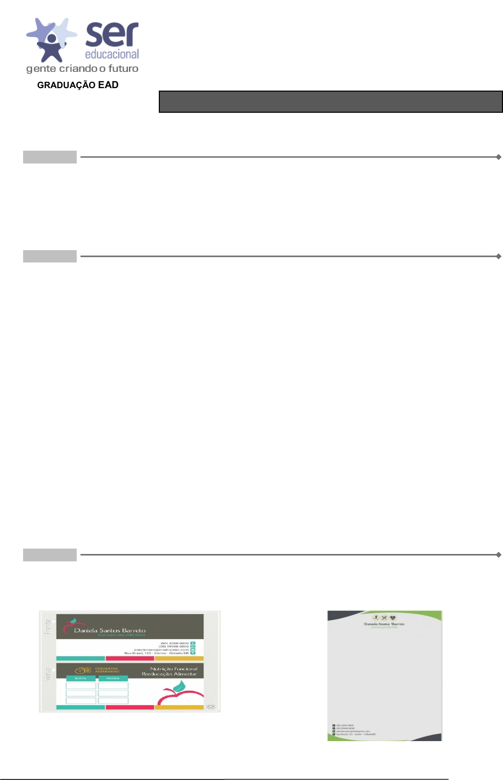 Página 1 de 2 GRADUAÇÃO EAD SEGUNDA CHAMADA 2018.2B 15/12/2018 QUESTÃO 1. O excesso de peso é considerado um fator de risco para muitas doenças, sendo assim, um problema de saúde pública. Dentre as patologias descritas abaixo, para qual delas o excesso de peso não é considerado um fator de risco? R: Tuberculose pulmonar. QUESTÃO 2. Consulta nutricional é definida como a atividade realizada por nutricionista para o levantamento de informações que possibilitem o diagnóstico nutricional, o conhecimento sanitário, a prescrição dietética e orientação dos pacientes ou clientes de forma individualizada. Sobre os tipos de consulta, relacione as definições a seguir e marque a alternativa correspondente. 1. Consulta inicial 2. Reconsulta 3. Retorno ( ) Atendimento prestado pelo nutricionista em consultório, em ambulatório de nutrição ou em domicílio, como se fosse uma primeira consulta, devido ao longo tempo passado em relação à consulta anterior (reinício do tratamento). ( ) Atendimento prestado pelo nutricionista em consultório, em ambulatório de nutrição ou em domicílio, realizado após um primeiro atendimento, dentro de um prazo determinado. ( ) Primeiro atendimento de nutrição feito pelo nutricionista em unidade de ambulatório, em consultório ou em domicílio, onde é realizada uma entrevista para coleta de dados pessoais e avaliação do estado nutricional, para em seguida proceder ao diagnóstico nutricional, o plano alimentar e orientação individualizada. A sequência correta é: R: 2, 3, 1. QUESTÃO 3. Ao decidir abrir um consultório de nutrição e dietética, o nutricionista precisa produzir alguns materiais que serão úteis na sua prática clínica. Veja a figura a seguir e marque a alternativa correspondente a este material. R: Receituário. TÓPICOS INTEGRADORES III - NUTRIÇÃO Página 2 de 2 QUESTÃO 4. Valéria estava em atendimento em uma clínica e durante a consulta se desconcentrou várias vezes por ouvir as conversas que aconteciam fora da sala de atendimento. Nesse caso, Valéria precisa melhorar: R: A acústica da sala. QUESTÃO 5. O cartão de visita pode ser o primeiro contato do profissional com seu futuro cliente, e por isso deve conter informações essenciais. Veja o cartão de visita a seguir e identifique qual informação falta ser colocada. R: Formas de contato. QUESTÃO 6. Maria fez as medidas antropométricas do seu cliente e vai registar no formulário de atendimento. Qual o local mais indicado para esse registro? R: Seção de avaliação nutricional. QUESTÃO 7. O atendimento nutricional é algo complexo por trabalhar com um dos atos mais primitivos do ser humano, a alimentação. Assim, o nutricionista deve compreender os aspectos que envolve a adesão do tratamento para aumentar as chances de sucesso da conduta nutricional. Quando se trata de excesso de informações dadas durante a consulta, sabemos que esse é um aspecto negativo que está relacionado: R: Ao cliente. QUESTÃO 8. Analise o trecho abaixo. “Na ______ lidamos com o mais primitivo e essencial ato, que é a ______ e o mais sofisticado e também essencial evento que é a vida, tendo a saúde, a boa saúde, como sua melhor representação.” Os termos que preenchem, correta e respectivamente, as lacunas acima são: R: nutrição, alimentação QUESTÃO 9. Uma das estratégias de marketing é a localização do consultório, diante disso, alguns aspectos devem ser considerados para essa escolha. Dessa forma, marque a alternativa que apresenta aspectos importantes para avaliação da localização de um consultório. R: Origem dos pacientes/clientes, acesso e estacionamento. QUESTÃO 10. A transição nutricional brasileira é derivada da interação entre inúmeros fatores do cotidiano da população, como: prática de atividade física, hábitos alimentares, nível de escolaridade, perfil demográfico, acesso aos serviços de saúde, entre outros. Ela pode ser definida de forma simplificada por: R: Aumento do excesso de peso e redução da desnutrição.