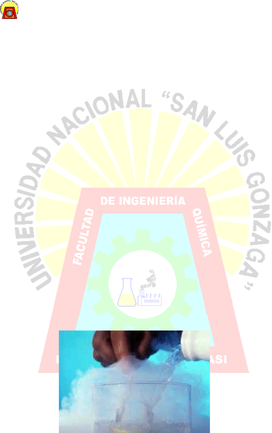 Universidad Nacional “San Luis Gonzaga” Facultad De Ingeniería Química Y Petroquímica 1. Introducción: A continuación, hablaremos sobre lo que fue la práctica en el laboratorio de química acerca de la obtención del nitrógeno, detallaremos paso a paso los conocimientos adquiridos a través de la experimentación. A través de las páginas que veremos en este trabajo, presentamos información elemental sobre lo aprendido durante la práctica de laboratorio, así como también profundizamos y damos explicaciones sencillas. Sabemos que la mejor forma de aprender es haciendo y llevando a la práctica los conocimientos teóricos, de manera que podamos enriquecer y fortalecer nuestra experiencia en el amplio mundo de la química. Hemos tratado de presentar imágenes e ilustraciones para que la lectura resulte amena e interesante y que al mismo tiempo sea más fácil comprender lo que se dice y explica. Deseamos que al terminar la lectura de nuestro trabajo sea fácil comprender y tener una idea clara de las propiedades y obtención del nitrógeno en nuestro laboratorio y algunos experimentos y explicaciones interesantes que aquí se presentan. 2. Objetivos: · Obtener nitrógeno · Comprobar sus propiedades 3. Marco teórico: Definición El nitrógeno es un elemento químico, de número atómico 7, símbolo N y que en condiciones normales forma un gas diatómico que constituye del orden del 78% del aire atmosférico. El nitrógeno fue aislado por el físico británico Daniel Rutherford en 1772 y reconocido en 1776 como gas elemental por el químico francés Antoine Laurent de Lavoisier. En ocasiones es llamado ázoe antiguamente se usó también Az como símbolo del nitrógeno. Propiedades El nitrógeno es un gas no tóxico, incoloro, inodoro e insípido. Puede condensarse en forma de un líquido incoloro que, a su vez, puede comprimirse como un sólido cristalino e incoloro. El nitrógeno aparece en dos formas isotópicas naturales; artificialmente se han obtenido cuatro isótopos radiactivos. Tiene un punto de fusión de -210,01 °C, un punto de ebullición de -195,79 °C y una densidad de 1,251 g/l a 0 °C y 1 atmósfera de presión. Su masa atómica es 14,007. Características del nitrógeno A continuación, puedes ver una tabla donde se muestra las principales características que tiene el nitrógeno. Nitrógeno Símbolo químico N Número atómico 7 Grupo 15 Periodo 2 Aspecto incoloro Bloque p Densidad 1.2506 kg/m3 Masa atómica 14.0067 u Radio medio 65 pm Radio atómico 56 Radio covalente 75 pm Radio de van der Waals 155 pm Configuración electrónica [He] 2s2 2p3 Electrones por capa 2, 5 Estados de oxidación +-3, 5, 4, 2, 1 (ácido fuerte) Estructura cristalina hexagonal Estado gaseoso Punto de fusión 63.14 K Punto de ebullición 77.35 K Calor de fusión 0.3604 kJ/mol Temperatura crítica 126,19 K Presión crítica 3.39 MPa Pa Electronegatividad 3,04 Calor específico 1040 J/(K·kg) Conductividad eléctrica __ 106S/m Obtención y abundancia Se obtiene de la atmósfera haciendo pasar aire por cobre o hierro calientes; el oxígeno se separa del aire dejando el nitrógeno mezclado con gases inertes. El nitrógeno puro se obtiene por destilación fraccionada del aire líquido. Al tener el nitrógeno líquido un punto de ebullición más bajo que el oxígeno líquido, el nitrógeno se destila antes, lo que permite separarlos. Compuestos Con el hidrógeno forma el amoníaco (NH3), la hidracina (N2H4) y el aziduro de hidrógeno (N3H, también conocido como azida de hidrógeno o ácido hidrazoico). El amoníaco líquido, anfótero como el agua, actúa como una base en una disolución acuosa, formando iones amonio (NH4+), y se comporta como un ácido en ausencia de agua, cediendo un protón a una base y dando lugar al anión amida (NH2). También se conocen largas cadenas y compuestos cíclicos de nitrógeno, pero son muy inestables. Aplicaciones La mayor parte del nitrógeno utilizado en la industria química se obtiene por destilación fraccionada del aire líquido, y se usa para sintetizar amoníaco. A partir de este amoníaco se preparan una gran variedad de productos químicos, como fertilizantes, ácido nítrico, urea, hidracina y aminas. También se usa el amoníaco para elaborar óxido nitroso (N2O), un gas incoloro conocido popularmente como gas de la risa. Este gas, mezclado con oxígeno, se utiliza como anestésico en cirugía. 4. Materiales: 1 balanza 2 matraz Erlenmeyer de 250 ml 6 tubos de ensayo de 18*150 1 pinza 1 soporte universal 1 aro 1 tela de asbesto 1 cuba hidroneumática 1 mechero 1 tapón mono horadado 1 espátula 5. Reactivos: Cloruro de amonio NH4Cl Nitrato de sodio NaNO3 Cinta de magnesio Ácido nítrico HNO3 Virutas de cobre Plancha de cobre Agua destilada 6. Parte teórica 1. Obtención de nitrógeno En un tubo de ensayo sulfhidricador grande, coloque 2gr de cloruro de amonio, 2gm de nitrato de sodio y 10gr de agua destilada. Sujete el tubo de ensayo al soporte mediante unas pinzas. Conecte al tubo de ensayo un tubo de desprendimiento, dirigido a una cuba hidroneumática llena de agua, contenga 3 tubos de ensayos invertidos y llenos de agua. Caliente con precaución el tubo que contiene la mezcla y colecte el gas generado en los tubos de ensayo por desplazamiento de agua y tápelos. a) Tome uno de los tubos que contiene Nitrógeno, manténgalo boca abajo, tápelo con el pulgar; encienda un cerillo e introdúzcalo en el tubo. b) Tome otros de los tubos lleno de Nitrógeno, introduzca con unas pinzas una cinta de magnesio encendida. Anote y explique sus observaciones 2. Acción sobre los metales de ácido nítrico Disponer en un tubo de ensayo virutas de cobre; agregar ácido nítrico y observar el desprendimiento de vapores rutilantes y la formación de los correspondientes nitratos. Evaporar las soluciones a sequedad en capsulas de porcelana y calcinar para transformar los nitratos en óxidos. Observar el color de estos últimos 3. Grabado al agua fuer