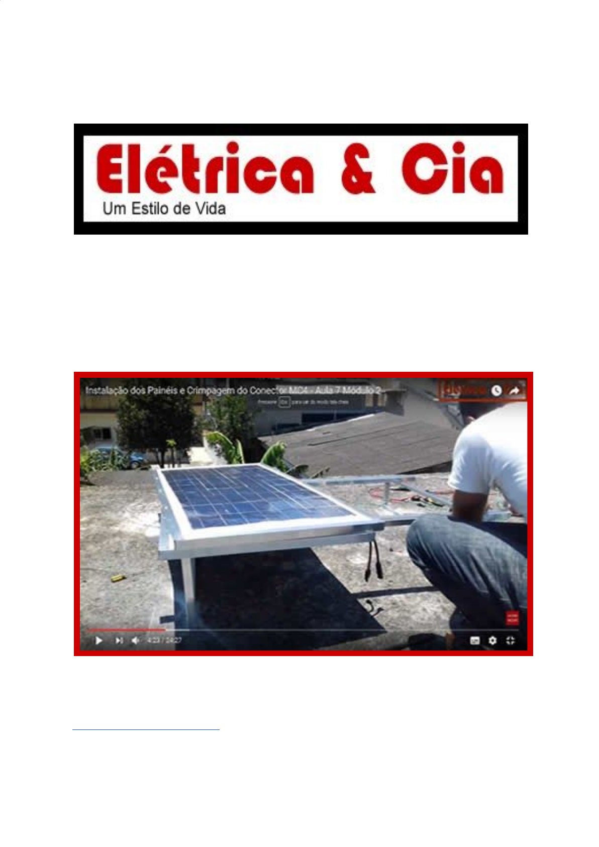 2ª Edição - Para baixar vá em Arquivo depois em Fazer download como, é só escolher o formato, recomendo em PDF. ABC da Energia Solar Fotovoltaica Por Alex Lima www.cursoeletricaecia.com.br http://www.cursoeletricaecia.com.br/ Olá eu sou Alex Lima, e elaborei este material para lhe auxiliar Nesta Palestra estou abordando a possibilidade de instalar um sistema de energia solar fotovoltaico do absolutamente Zero com pouco dinheiro, Exatamente, gastando pouco, sem desperdício ou coisas desnecessário, com um bom planejamento isso realmente é possível. A Palestra Foi elaborada em 4 partes de aproximadamente 25 minutos onde estarei explicando tudo que você precisa saber para iniciar as suas instalações. Nesta Primeira parte vamos conhecer os primeiros passos que devemos tomar. A primeira coisa que deve ser obtida como dito na palestra, obviamente é iniciar um planejamento para adquirir todo o conhecimento necessário veja a lista de informações que devemos adquirir: 1. Conhecimento do Sistema de Energia Solar Fotovoltaica 2. Conhecimento dos Equipamentos e Acessórios 3. Conhecimento Básico da Elétrica 4. Instalação do Sistema 5. Pesquisa de Preços Sem perda de tempo vamos iniciar este planejamento listado acima. Eu vou dar as dicas para você achar estas informações que vão te ajudar a ter o conhecimento sólido, para com segurança, iniciar o seu projeto. 1 - Conhecimento do Sistema de Energia Solar Fotovoltaica Deixo abaixo uma lista de vídeos e sites que vão te fazer entender com exatidão o funcionamento do sistema de energia solar. Primeiramente Assista estes vídeos abaixo. Estes vídeos pertencem a grade do nosso curso de energia solar Tipos de Sistemas fotovoltaico - Curso de Energía Solar Fotovoltaica - Aula 4 - 1º Módulo https://www.youtube.com/watch?v=v1_XiESF4WA Gerador de Energia solar como funciona célula fotovoltaica Como Funciona Inversor Off Grid Energia Solar Isolada Posicionamento das Paineis Solares - Gerador de Energia Solar Painéis Solares ligadas em Série e Paralelo Energia Solar Gerador de energia Solar o que é controlador de carga Gerador de energia Solar Como Funciona a Bateria estacionaria https://www.youtube.com/watch?v=TWfN_KT3ibc https://www.youtube.com/watch?v=v1_XiESF4WA https://www.youtube.com/watch?v=wtyZW-2GkFU https://www.youtube.com/watch?v=wtyZW-2GkFU https://www.youtube.com/watch?v=zTQkBnBIgD4 https://www.youtube.com/watch?v=zTQkBnBIgD4 https://www.youtube.com/watch?v=WlYN0HL8gNU https://www.youtube.com/watch?v=WlYN0HL8gNU https://www.youtube.com/watch?v=mJcDyxcSFf4 https://www.youtube.com/watch?v=mJcDyxcSFf4 https://www.youtube.com/watch?v=uBqWkq1mfdk https://www.youtube.com/watch?v=uBqWkq1mfdk https://www.youtube.com/watch?v=zTQkBnBIgD4 https://www.youtube.com/watch?v=hcS9jnN-wV4 https://www.youtube.com/watch?v=hcS9jnN-wV4 Aterramento do Sistema Fotovoltaico 🔌Dicas de Manutenção - Jabá Meu Painel Solar Está Com Baixa Eficiência - Dicas de Manutenção Bateria De Gel em Sistema de Energia Solar uma Ótima Opção - Jabá Energia Solar com 🔋 Baterias em Série 24v Dicas de Ligações Corretas Bateria Estacionária 🔋 Como Garantir a Vida Útil - Algumas Dicas Meu Sistema de Energia ☀ Solar Está Perdendo Eficiência, Dicas na Prática ☀ Energia Solar On-gride ou Off-Grid Vantagens e Desvantagens https://www.youtube.com/watch?v=ML-QnWU2SrA https://www.youtube.com/edit?o=U&video_id=ML-QnWU2SrA https://www.youtube.com/watch?v=IjwHmCD7-b0 https://www.youtube.com/edit?o=U&video_id=IjwHmCD7-b0 https://www.youtube.com/watch?v=rVeUER94XPw https://www.youtube.com/edit?o=U&video_id=rVeUER94XPw https://www.youtube.com/edit?o=U&video_id=iGR3PnY7YYs https://www.youtube.com/watch?v=i7MGeiv-x7o https://www.youtube.com/edit?o=U&video_id=i7MGeiv-x7o https://www.youtube.com/watch?v=ZVfFsn3egrc https://www.youtube.com/edit?o=U&video_id=ZVfFsn3egrc https://www.youtube.com/watch?v=VF89qv9XSVs https://www.youtube.com/edit?o=U&video_id=VF89qv9XSVs https://www.youtube.com/edit?o=U&video_id=ZVfFsn3egrc https://www.youtube.com/edit?o=U&video_id=i7MGeiv-x7o https://www.youtube.com/edit?o=U&video_id=iGR3PnY7YYs https://www.youtube.com/edit?o=U&video_id=IjwHmCD7-b0 2 Conhecimento dos Equipamentos e Acessórios Separei 2 vídeos que também fazem parte da nossa Grade do Curso de energia solar Equipamentos - Curso de Energia Solar Fotovoltaica - Aula 5 Módulo 1 Acessórios - Curso de Energia Solar Fotovoltaica - Aula 6 Módulo 1 3 Conhecimento Básico da Elétrica Separei 2 vídeos que também fazem parte da nossa Grade do Curso de energia solar Corrente Contínua e Corrente Alternada - Aula 5 - Eletricidade Básica Medidas grandezas e valores da Elétrica da - Aula 2 - Eletricidade Básica Para um maior conhecimento neste assunto deixo o nosso curso de eletrônica básica grátis que está nessa playlist abaixo que vão te dar pleno conhecimento da elétrica e da eletrônica básica, São 20 vídeo-aulas completas que capacitou muitos a construir seus próprios inversores de tensão Curso Treinamento de Eletrônica Básica https://www.youtube.com/watch?v=0PEC8nbseek https://www.youtube.com/watch?v=0PEC8nbseek https://www.youtube.com/watch?v=ssmC8GV3fx0 https://www.youtube.com/watch?v=ssmC8GV3fx0 https://www.youtube.com/watch?v=JonZ3K_S5NU https://www.youtube.com/watch?v=JonZ3K_S5NU https://www.youtube.com/watch?v=xbBzlW7kruM https://www.youtube.com/watch?v=xbBzlW7kruM https://www.youtube.com/watch?v=3Rk4SBTczCE&list=PLVb_r3fih8wavGfUgg4C-d8fmEc74ndcB 3 - Instalação do Sistema e Pesquisa de Preços Para esta parte recomendo que você conheça o nosso curso de energia solar Veja algumas das matérias que fazem parte do nosso curso de instalação. Cálculo e Dimensionamento do sistema Solar Módulo em que ensino a fazer os cálculos para saber quantas Baterias, quantos paineis, qual a amperagem do controlador de carga e qual a potência do inversor de tensão. Instalações de Todo sistema Passo a Passo Módulo Principal onde ensino 