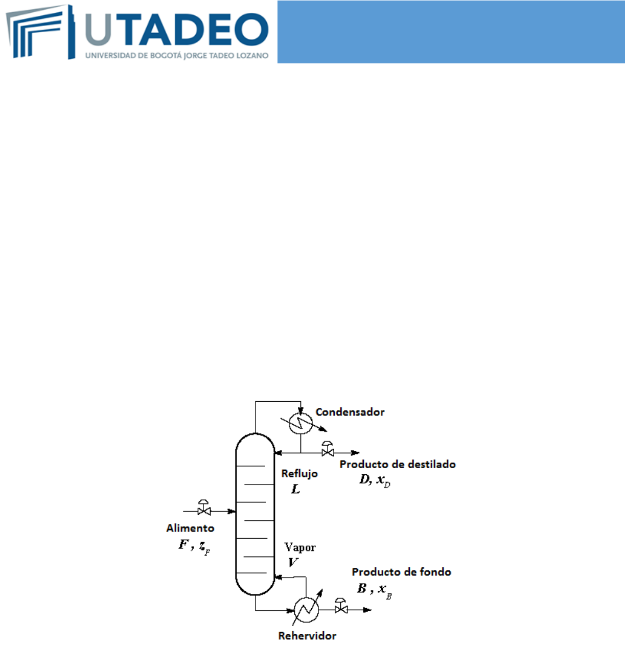 LABORATORIO DE OPERACIONES UNITARIAS II - GUÍA DE PRÁCTICAS DESTILACIÓN 1. Objetivo Llevar a cabo el proceso de destilación continua de una mezcla binaria etanol-agua en la torre de destilación. 2. Introducción La destilación es una de las operaciones unitarias más empleadas a nivel industrial y se utiliza frecuentemente para concentrar bebidas alcohólicas. La destilación es un proceso de separación física que aprovecha las diferencias entre los puntos de ebullición de los componentes involucrados en la mezcla a separar. Cuando una mezcla de dos componentes o más es introducida a una columna de destilación (Figura 1), el vapor que se genera tendrá una concentración mayor en el componente más volátil (Menor punto de ebullición) saliendo por el tope de la columna mientras que el componente más pesado saldrá por los fondos de la torre de destilación. La separación en destilación está regida por el Equilibrio Liquido Vapor (ELV) del sistema donde la relación de las fracciones molares en la fase vapor y liquida (K) depende de la temperatura, presión y composición, lo que permite definir la volatilidad relativa (αij) de los componentes i y j conforme a la ecuación (1): Figura 1. Columna de destilación. (Tomado de: Industria e Ingeniería Química. www. goo.gl/QGBKQs) LABORATORIO DE OPERACIONES UNITARIAS II - GUÍA DE PRÁCTICAS 𝛼𝑖𝑗 = 𝑉𝑎𝑙𝑜𝑟 𝐾 𝑝𝑎𝑟𝑎 𝑒𝑙 𝑐𝑜𝑚𝑝𝑜𝑛𝑒𝑛𝑡𝑒 𝑖 𝑉𝑎𝑙𝑜𝑟 𝐾 𝑝𝑎𝑟𝑎 𝑒𝑙 𝑐𝑜𝑚𝑝𝑜𝑛𝑒𝑛𝑡𝑒 𝑗 (1) Para sistemas binarios, es posible expresar la composición molar en el vapor del componente i en función de las volatilidades relativas conforme a la ecuación (2): 𝑦𝑖 = 𝛼𝑖𝑗𝑥𝑖 1+(𝛼𝑖𝑗−1)𝑥𝑖 (2) La fugacidad del vapor y del líquido en el equilibrio son iguales (fV = fL), mientras que la fugacidad del vapor puede mirarse como una presión parcial corregida conforme a la ecuación (3), la fugacidad en la fase liquida puede mirarse como una presión de vapor corregida conforme a la ecuación (4). 𝑓𝑖 𝑉 = 𝜙𝑖 𝑉(𝑃𝑦𝑖) (3) 𝑓𝑖 𝐿 = 𝜙𝑖 𝐿𝛾𝑖𝜓𝑖(𝑥𝑖𝑃𝑖 𝑇) (4) Donde φiV es el coeficiente de fugacidad en el vapor que involucra el efecto de la no idealidad en la fugacidad del vapor. φiL es el coeficiente de fugacidad en el líquido y que considera el efecto de la no idealidad del vapor en la fugacidad del líquido. Ψi es el factor de Poynting y tiene en cuenta el efecto de la presión en la fugacidad liquida, este efecto es pequeño a presiones bajas y puede no considerarse. ϒi es el coeficiente de actividad de la fase liquida y corrige la fugacidad del líquido por el efecto de la composición. Por otro lado, la sumatoria de las fracciones molares en la fase de vapor y liquido suman la unidad de acuerdo a las ecuaciones (5) y (6). ∑ 𝑥𝑖 𝑛𝑐 𝑖=1 = 1 (5) ∑ 𝑦𝑖 𝑛𝑐 𝑖=1 = 1 (6) Los diagramas de fase sirven para representar los sistemas binarios usando dos de las tres variables: temperatura, presión y composición. El diagrama x-y permite conocer las composiciones en el equilibrio (Figura 2(a)) mientras que el diagrama T-xy permite conocer las relaciones de las composiciones con la temperatura (Figura 2(b)). En la figura 2(b), a una composición x1 y una temperatura T1, el punto B representa el punto de burbuja, es decir, cuando el líquido está listo LABORATORIO DE OPERACIONES UNITARIAS II - GUÍA DE PRÁCTICAS para comenzar su ebullición. Cuando el líquido comienza a hervir a la temperatura T1, su composición en el vapor es y1 y está en su punto de roció, punto D. Figura 2. (a) Diagrama x-y. (b) Diagrama temperatura composiciones. Existen mezclas binarias y multicomponentes que tienen una alta interacción física y/o química, lo que hace que los diagramas nombrados tengan un comportamiento diferente. En un diagrama de composiciones x-y, la línea del equilibrio intersecta a la línea diagonal haciendo que las composiciones de líquido y vapor sean idénticas. A este punto se le denomina azeotropo. Las mezclas binarias pueden tener azeotropos de mínimo y máximo punto de ebullición (Figura 3) lo que limitara los productos de destilado y fondo en una destilación, impidiendo obtener separados completamente a los dos componentes en las condiciones de temperatura y presión dadas. Figura 3. Azeotropos de mínimo y máximo punto de ebullición LABORATORIO DE OPERACIONES UNITARIAS II - GUÍA DE PRÁCTICAS 3. Materiales Torre de destilación ubicada en el CIPI Baldes de 50 litros Alcoholímetro Cronómetro Refractómetro Probetas 4. Procedimiento NOTA: Cada grupo de trabajo debe revisar el equipo a utilizar en el laboratorio la semana previa a la práctica, con el ánimo de conocer su funcionamiento y que la práctica se desarrolle de manera fluida. Cada grupo deberá realizar la curva de calibración de Índice de refracción vs concentración de alcohol con el ánimo de calcular las concentraciones de etanol en el transcurso de la práctica. Una vez conocida la torre de destilación y su funcionamiento, debe prenderse la caldera (Apóyese en los técnicos del laboratorio para esta tarea). Una vez se cuenta con vapor, debe purgarse la línea de vapor. Debe luego, dar paso al alimento que previamente preparo a una concentración conocida (Sugerencia: mezcla de etanol entre el 10% y 25%). Debe proporcionar un flujo de alimento a la torre de 1 L/min aproximadamente (Este flujo deberá ser organizado por el grupo). Una vez tenga este flujo debe abrir las válvulas para empezar a darle paso al alimento hacia la primera torre de destilación y controlar que no se inunde (Sugerencia: trate de tener el líquido en la mitad de la mirilla). Apóyese en el tablero de control para la lectura de las temperaturas a lo largo de las torres de destilación. Una vez tenga alimento entrando en la segunda columna de destila