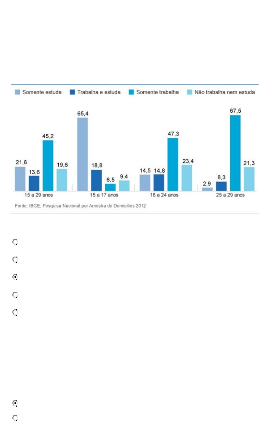 AS1 METODOLOGIA DO ENSINO DE MATEMÁTICA – TRATAMENTO DA INFORMAÇÃO PERGUNTA 1 1. O gráfico que segue mostra o resultado de uma pesquisa do IBGE (Instituto Brasileiro de Geografia e Estatística). Ele tem como base os dados da Pnad 2012. (A Pnad é uma pesquisa feita anualmente pelo IBGE, exceto nos anos em que há Censo. No ano passado, a pesquisa foi realizada em 147 mil domicílios, totalizando 363 mil pessoas entrevistadas). A partir da observação do gráfico é CORRETO afirmar que o número de pessoas (da amostra pesquisada) de 15 a 29 anos que trabalha e estuda é: a. 164.076 pessoas b. 68.244 pessoas c. 49, 368 pessoas d. 71.148 pessoas e. 78.408 pessoas Dos itens a seguir, quais apresentam fenômenos aleatórios? I- Quantidade de chuva que cai em uma determinada localidade. II - Chute de uma bola para o gol. III - Prever a necessidade de o ser humano de tomar água. a. Apenas I e II. b. Apenas II . c. Apenas I e III. d. As três são fenômenos aleatórios. e. Apenas I. PERGUNTA 3 1. Uma Pesquisa do IBGE (Instituto Brasileiro de Geografia e Estatística) baseados na Pnad 2012 (Pesquisa Nacional por Amostra de Domicílios) mostra que o número de jovens de 15 a 29 anos que não estudava nem trabalhava na época da pesquisa chegou a 9,6 milhões no país no ano passado. Esse número representa 19,6% da população de 15 a 29 anos. Na comparação com 2002, quando 20,2% dos jovens nessa faixa etária não estudavam e não trabalhavam, houve leve redução de 6%. Os resultados da pesquisa foram apresentados no gráfico a seguir: Analisando o gráfico é possível dizer que: a. O número de jovens que “só estuda” na amostra pesquisada, dos 15 aos 29 anos, é crescente. b. Há mais jovens que “trabalha e estuda” do que jovens que “só estuda”. c. Que ele apresenta os resultados da pesquisa com uma amostra (em 3 grupos: de 15 a 17, de 18 a 24 e de 25 a 29 anos) e a projeção desse resultado na população do país com idade de 15 a 29 anos. d. A diferença de jovens que “não trabalha nem estuda” na amostra pesquisada de 15 a 17 anos e os de 25 a 29 anos é de 2,1. e. O número de jovens que somente estuda e daqueles que trabalha e estuda na faixa de 18 a 24 anos é igual. PERGUNTA 4 1. Analise a situação a seguir: Paulo tem quatro rotas possíveis de trajeto para ir dirigindo trabalhar com seu carro. Ele quer descobrir qual rota permite chegar mais rápido ao trabalho. O trânsito, nas quatro rotas, varia no decorrer da semana. Paulo resolveu fazer uma comparação do tempo gasto em cada caminho. Para isso, decidiu fazer um trajeto por semana e anotar o tempo gasto para chegar ao trabalho, sendo o trajeto I na primeira semana do mês, o trajeto II na segunda semana e assim por diante. Ele vai fazer isso durante 4 meses para inverter a ordem das semanas de cada trajeto. Ele pretende ver o tempo médio gasto em cada trajeto nesse período. A situação apresentada é um problema: a. De Combinatória, porque Paulo vai agrupar os dados para tomar decisão sobre o melhor trajeto. b. Da Estatística, porque Paulo vai usar a média para saber qual o melhor caminho. c. Da Estatística, porque Paulo partiu de um problema, elaborou uma forma sistemática para coleta dos dados que dão informações sobre o fenômeno de seu interesse. d. De Probabilidade, porque o tempo gasto em cada trajeto é incerto. e. De Matemática, porque ele vai registrar o tempo gasto em cada rota e fazer contas para saber qual é o melhor trajeto.