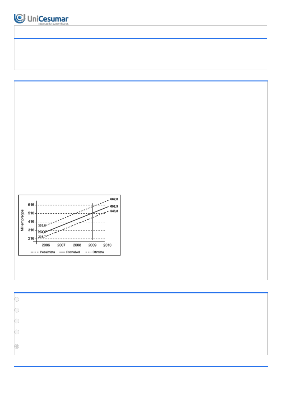 18/08/2020 Unicesumar - Ensino a Distância 1/8 ATIVIDADE 2 - ENG SOFT - ESTATÍSTICA - 53/2020 Período:03/08/2020 08:00 a 18/08/2020 23:59 (Horário de Brasília) Status:ABERTO Nota máxima:0,50 Gabarito:Gabarito será liberado no dia 19/08/2020 00:00 (Horário de Brasília) Nota obtida: 1ª QUESTÃO Um país não se faz só de estereótipos, ou o Brasil seria apenas a terra do samba, da praia, da Amazônia, do Carnaval. Felizmente, somos também a terra do axé, do maracatu, da bossa nova, da mistura. Do cerrado, dos cânions, das serras, do Pantanal. Do Réveillon mais famoso do mundo, sim, mas também das festas de reinado, de São João, do Boi Bumbá. Mas mais do que isso: o Brasil sabe sempre inventar mais um pouquinho. Todo verão surge uma nova praia do ano. Espaço para isso é o que não falta num litoral de mais de nove mil quilômetros de extensão. Com essas diversas opções para férias, lazer, descanso, faz com que o Brasil seja muito forte na área turística, assim o desenvolvimento da atividade turística no Brasil relaciona-se especialmente com os possíveis efeitos na redução da pobreza e das desigualdades por meio da geração de novos postos de trabalho e da contribuição para o desenvolvimento sustentável regional. Disponível em: https://continentes.com.br/turismo/destinos/nacionais/. Acesso em: 11 dezembro. 2018 (adaptado). No gráfico são mostrados três cenários, pessimista, previsível e otimista a respeito da geração de empregos pelo desenvolvimento de atividades turísticas. Fonte: https://projetomedicina.com.br/ De acordo com o gráfico, é possível afirmar que: ALTERNATIVAS No cenário otimista, a geração de emprego entre 2006 e 2009 mais do que dobrou. A mediana da geração de emprego no cenário pessimista, foi necessariamente igual a média. Em ambos os cenários, no ano de 2009 a moda da geração de empregos é um valor igual a média. Em ambos os cenários, no ano de 2009 a mediana da geração de empregos é um valor maior no cenário previsível. A probabilidade de uma pessoa do cenário previsível que não estava empregada no 2006, estar empregada no ano de 2009 no mesmo cenário, será 75,03%. 2ª QUESTÃO 18/08/2020 Unicesumar - Ensino a Distância 2/8 Asma é uma doença inflamatória crônica das vias aéreas. O pulmão do asmático é diferente de um pulmão saudável, como se os brônquios dele fossem mais sensíveis e inflamados - reagindo ao menor sinal de irritação. Se pensarmos em uma pessoa sem a doença, ela sofrerá uma falta de ar quanto estiver exposta a grandes irritações, como a fumaça de um incêndio. Diante desse quadro, o organismo da pessoa identifica os agentes irritantes e faz com que a musculatura que existe em volta do brônquio se contraia, fechando o órgão e impedindo que o ar contaminado entre nos pulmões. O mesmo processo acontece com um paciente que tem asma, só que os gatilhos para causar uma irritação nos brônquios são bem menos intensos, como a poeira. Disponível em: <https://www.minhavida.com.br/saude/temas/asma>. Acesso em: 21 abril. 2018 (adaptado). Em um estudo que investiga as causas de morte entre pessoas com asma severa, foram registradas as frequências cardíacas (batimentos cardíacos por minuto) de 8 pacientes que chegaram ao hospital em estado de parada respiratória. Os resultados obtidos foram os seguintes: 125; 135; 125; 130; 150; 125; 165; 150. Com base nos dados acima, indique qual alternativa, a seguir, corresponde ao valor modal dos batimentos cardíacos. ALTERNATIVAS 125. 130. 135. 150. 165. 3ª QUESTÃO Uma loja que vende sapatos recebeu diversas reclamações de seus clientes relacionadas à venda de sapatos de cor branca ou preta. Os donos da loja anotaram as numerações dos sapatos com defeito e fizeram um estudo estatístico com intuito de reclamar com o fabricante. A tabela contém a média, a mediana e a moda desses dados anotados pelos donos da loja. Disponível em: <http://portal.inep.gov.br/> Acesso em: 07 dezembro. 2018 (adaptado). Sendo assim, com base no enunciado e na tabela, podemos afirmar que: ALTERNATIVAS 18/08/2020 Unicesumar - Ensino a Distância 3/8 Necessariamente não serão mais vendidos os sapatos de numeração 36, pois a média, informa que os sapatos de numeração 36, são os sapatos que mais tem defeitos. Necessariamente não serão mais vendidos os sapatos de numeração 37, pois a mediana, informa que os sapatos de numeração 37, são os sapatos que mais tem defeitos. Necessariamente não serão mais vendidos os sapatos de numeração 40, pois as medidas de posição, que significa valores que mais ocorrem, informa que os sapatos de numeração 40, são os sapatos que mais tem defeitos. Necessariamente não serão mais vendidos os sapatos de numeração 42, pois as medidas de tendência central, que significa valores que mais ocorrem, informa que os sapatos de numeração 40, são os sapatos que mais tem defeitos. Se somarmos todos os sapatos defeituosos com numeração 36, e do total dessa soma dividirmos pela quantidade total de sapatos com numeração 36, teremos uma proporção da quantidade de sapatos defeituosos do número 36, em relação ao total de sapatos de numeração 36. 4ª QUESTÃO A história da teoria das probabilidades teve início com os jogos de cartas, dados e de roleta. Esse é o motivo da grande existência de exemplos de jogos de azar no estudo da probabilidade. A teoria da probabilidade permite que se calcule a chance de ocorrência de um número em um experimento aleatório. Sendo assim, depois de jogar um dado em forma de cubo e de faces numeradas de 1 a 6, por 10 vezes consecutivas, e anotar o número obtido em cada jogada, constituiu-se a seguinte tabela de distribuição de frequências. Disponível em: <https://projetomedicina.com.br/wp-content> Acesso em: dezembro. 2018 (adaptado). Com base nas informações da tabela, pode-se afirmar que: ALTERNATIVAS A média do número obtidos nos lançamentos é u