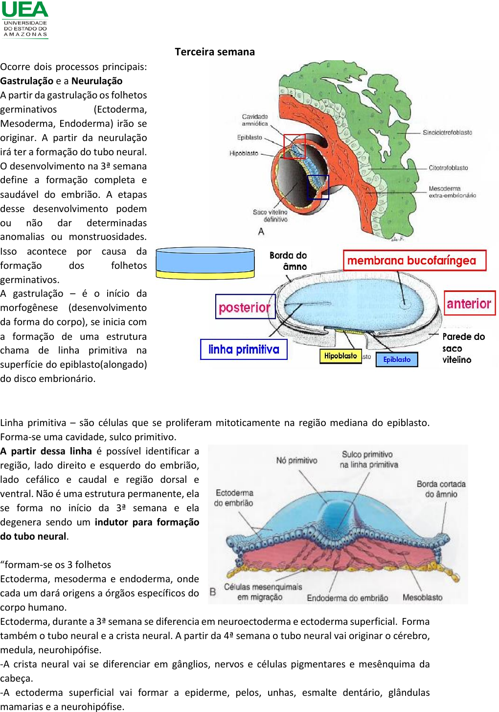 Terceira semana Ocorre dois processos principais: Gastrulação e a Neurulação A partir da gastrulação os folhetos germinativos (Ectoderma, Mesoderma, Endoderma) irão se originar. A partir da neurulação irá ter a formação do tubo neural. O desenvolvimento na 3ª semana define a formação completa e saudável do embrião. A etapas desse desenvolvimento podem ou não dar determinadas anomalias ou monstruosidades. Isso acontece por causa da formação dos folhetos germinativos. A gastrulação – é o início da morfogênese (desenvolvimento da forma do corpo), se inicia com a formação de uma estrutura chama de linha primitiva na superfície do epiblasto(alongado) do disco embrionário. Linha primitiva – são células que se proliferam mitoticamente na região mediana do epiblasto. Forma-se uma cavidade, sulco primitivo. A partir dessa linha é possível identificar a região, lado direito e esquerdo do embrião, lado cefálico e caudal e região dorsal e ventral. Não é uma estrutura permanente, ela se forma no início da 3ª semana e ela degenera sendo um indutor para formação do tubo neural. “formam-se os 3 folhetos Ectoderma, mesoderma e endoderma, onde cada um dará origens a órgãos específicos do corpo humano. Ectoderma, durante a 3ª semana se diferencia em neuroectoderma e ectoderma superficial. Forma também o tubo neural e a crista neural. A partir da 4ª semana o tubo neural vai originar o cérebro, medula, neurohipófise. -A crista neural vai se diferenciar em gânglios, nervos e células pigmentares e mesênquima da cabeça. -A ectoderma superficial vai formar a epiderme, pelos, unhas, esmalte dentário, glândulas mamarias e a neurohipófise. Reino 2018.1 -Mesoderma vai formar paraxial e somitos o intermediário, o lateral e a notocorda. A partir da 4ª semana os somitos formam cartilagem e ossos, músculos do tronco, tecido conjuntivo denso da derme e da pele. -Endorderma- a partir da 4 ª semana vai originar o intestino, bexiga..e dentre outros que ele não irá cobrar na prova. “É preciso saber que nesse período de desenvolvimento embrionário o concepto ainda é célula e que não há presença de cartilagem, ossos, membros, cabeça. O que dá para saber nesse período é a região que cefálica, caudal, direito, esquerdo, dorsal e ventral, por conta do aparecimento da linha primitiva. É um processo tanto de mitose e migração, já que é linha primitiva. Ela surge a partir da migração celular.” - A formação da linha primitiva constitui o primeiro sinal da gastrulação; -Forma-se na extremidade da cauda do embrião -É o resultado da proliferação e migração de células do epiblasto para o plano mediano do disco embrionário. -Dá origem as células mesênquimais que migram ventralmente, lateralmente e cranialmente entre o epiblasto e o hipoblasto. Com a formação da linha primitiva o concepto deixa de ser formado por duas camadas o disco bilaminar e apresenta 3 camadas celulares. -Quando é formada a camada do meio que separa o epiblasto do hipoblasto o nome muda. O epiblasto se torna ectoderma e o hipoblasto torna-se endoderma. Ou seja, o disco embrionário passa a se chamar folheto germinativo. Surgimento da Notocorda -Evento caracterizado por divisão celular, sucessivas mitoses e migração. Processo acelerado que também apresenta muita sinalização celular, atuação dos fatores de crescimento que atuam na sinalização paracrina e também na sinalização autocrina. Notocorda – Estrutura complexa na qual irá ser formada a coluna vertebral. Ela cresce e posteriormente se degenera para formação dos ossos das vertebras. - Define o eixo primitivo do embrião dando-lhe certa rigidez -Serve de base para formação do esqueleto axial, ossos da cabeça e coluna vertebral - Indica o local dos corpos vertebrais “A notocorda é pra originar a coluna a partir da formação das vertebras, depois ela regride pra formação da parte central das vertebras.” Ela se forma através da migração de células mesênquimais do nó e fossetas primitivos em direção cefálica, formando um cordão celular mediano que é chamado de processo notocordal e cresce até atingir a placa pré-cordal. A placa pré-cordal é uma camada de células do hipoblasto que aumentaram de tamanho. As Células do mesênquima epiblasto e hipoblasto, no meio terá o mesoderma que se multiplicam em direção cefálica para formação de um túbulo que dará origem a notocorda. O mesoderma pré-codal é uma população mesenquimal anterior a notocorda essencial para indução do cérebro e do corpo, tudo ocorre por sinalização celular. A placa pré- cordal, primórdio da membrana bucofaríngea, localizada no local do futuro local da cavidade oral, podendo também ter um papel como centro sinalizador para controlar o desenvolvimento das estruturas cranianas. -Células do endoderma invade a camada do mesoderma e vai proliferando. Há uma invaginação nessa saliência e vai se multiplicando até as células formarem um meio circulo dentro da camada mesodérmica, depois ela se separa da endoderme e fica somente o círculo que é a notocorda. A formação dessa notocorda no meio da camada mesodérmica separa o mesoderma em 3 partes: mesoderma lateral, mesoderma intermediário e mesoderma paraxial. O paraxial é importante para a formação dos somitos que são bloco de células que crescem de 2 em 2 nas direções tanto cefálicas quanto caudal. De acordo com a quantidade de somito o médico pode estimar a idade embrionária. Neurulação – induzida pela formação da notocorda, ocorre no ectoderma e resulta na formação do tubo neural e pares de cristas neurais dando inicio a formação do SNC. O tubo neural forma o sistema nervoso central e as cristas neurais formam gânglios espinhais e os gânglios do SNA. A placa neural aparece no final da 3ª semana sob indução do processo notocordal e o espessamento do ectoderma formando uma placa alongada em forma de c