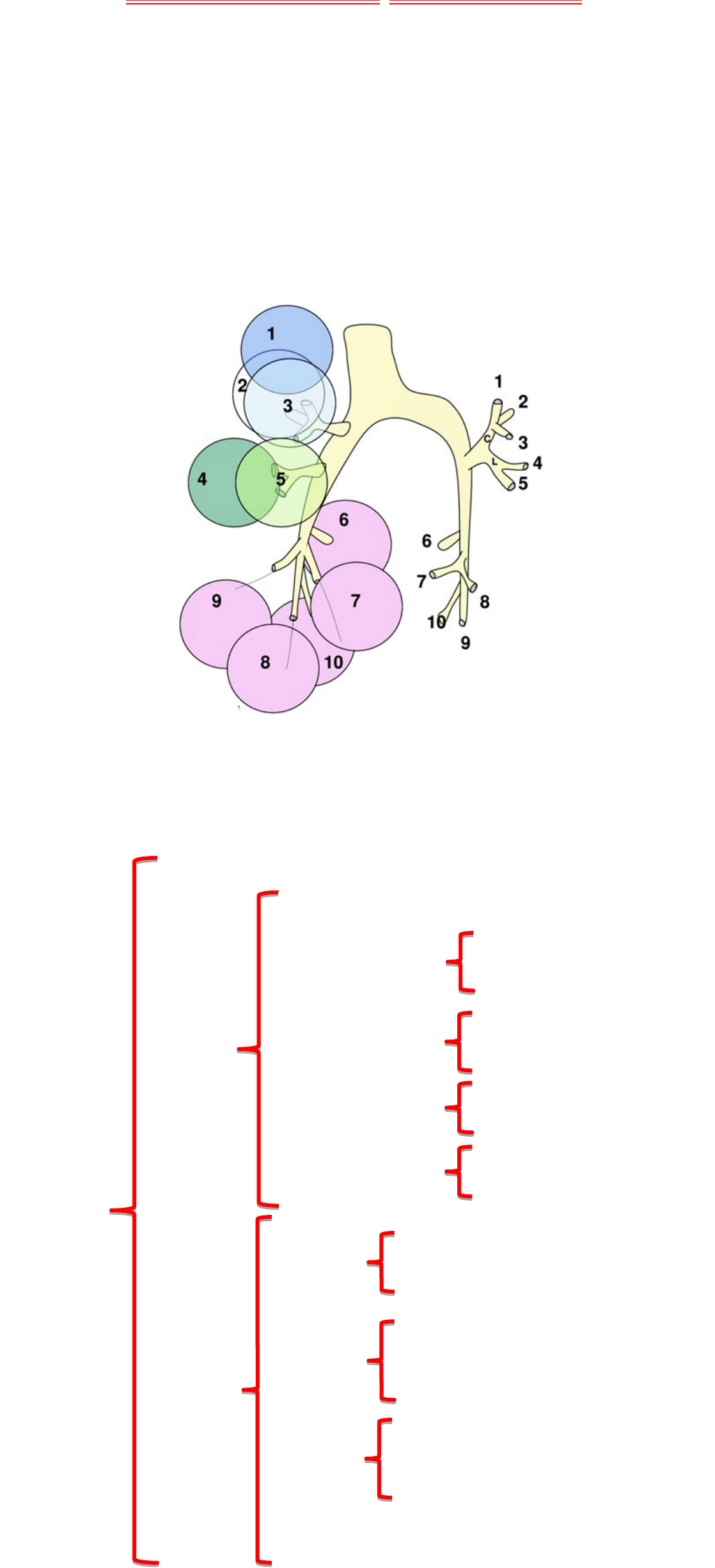 SEGMENTACIÓN BRONQUIAL NOMBRE: Katerin Paola Arias Huanca PARALELO: A-Medicina FECHA: 28-07-20 Después de abandonar la laringe, y de recorrer un trayecto de aprox. 12 cm en el varón y 11 cm en la mujer, a nivel de la 59 vértebra torácica y formando un ángulo de aprox. 709, la tráquea se divide en dos bronquios principales: uno derecho y otro izquierdo que penetrarán en los pulmones y dividirán en bronquios menores. El pulmón derecho presenta tres lóbulos mientras que el izquierdo dos (cede un espacio para el corazón). De esta manera, los bronquios principales, cepa o fuente darán bronquios lobares para cada pulmón: 3 el derecho y 2 el izquierdo. Cada bronquio lobar dará bronquios menores que al dividirse por dicotomía originan territorios pulmonares bien definidos denominados segmentos pulmonares. De esta manera decimos que: los bronquios lobares se dividen en bronquios segmentarios. Esa división que no es por dicotomía, sino particular, nos permite dividir a los lóbulos de los pulmones en segmentos y se denomina SEGMENTACION BRONCOPULMONAR. BRONQUIO PRINCIPAL DERECHO: de su cara externa se desprenderán los bronquios lobulares superior, primero y medio después, y luego se continuará como bronquio lobular inferior. (La porción comprendida entre el nacimiento del superior y el medio se denomina. Bronquio intermedio Bronquio L. Superior: Se divide en 3 bronquios segmentarios: superior o apical, anterior o ventral y posterior o dorsal. Bronquio L. Medio: Se divide en dos bronquios segmentarios: Interno o medial (4) y externo o lateral (5). B.L. Inferior: Da por su cara 4 Posterior al bronquio segmentario superior o Api cal de Nelson. (6) Luego da de su cara interna al medio basal o para cardíaco La porción del bronquio Lobular inferior que queda Después de desprenderse el Bronquio segmentario para cardíaco Se denomina Bronquio basal, y de él se des prenderán tres segmentos que formarán la denominada Pirámide basal. Cada uno de éstos segmentos dependen de un bronquio segmentario; los que son: anterior o ventrobasal (8), externo o latero basal (9) y posterior o póster basal (10) BRONQUIO PRINCIPAL IZQUIERDO: Dará el Bronquio lobular superior para el lóbulo superior y se continuará como bronquio lobular inferior. (Recordemos que el pulmón izquierdo tiene sólo dos lóbulos). El bronquio lobular superior se divide en dos troncos: Culmen, similar al sup del pulmón dicho, que da tres bronquios segmentarios: api cal, ventral y dorsal Lingula: que hará las veces de lóbulo medio y dará dos bronquios segmentarios: sup e inf. (4 y 5) En el lóbulo inferior del pulmón izquierdo, el bronquio lobular inferior se comporta igual que el derecho, con la diferencia de que el para cardiaco y el ventrobasal pueden nacer de un tronco común denominado basal ante romedial. Órganos esenciales de la respiración contenidos en la caja torácica torácica. Aspecto Exterior Conformación interna Consistencia: Son blandos, esponjoso y elásticos Color Rosado: niños Gris: adultos Negruzco: ancianos Caras Inferior: cóncava Externa: convexa Interna: cóncava (bilios) Pulmón Derecho Pulmón Izquierdo Dos surcos Tres lóbulos Un surco Dos lóbulos PULMONES Lobulillos Estructura Vasos sanguíneos "Pulmones en miniatura" Contienen numerosas vesículas con sus alvéolos. Pueden ser: periféricos o internos Las arterias se ramifican como los bronquios Se capilarizan al llegar a las vesículas Se originan finalmente las vesículas pulmonares Ramificaciones bronquiales Vesículas pulmonares Tejido conjuntivo elástico Vasos sanguíneos
