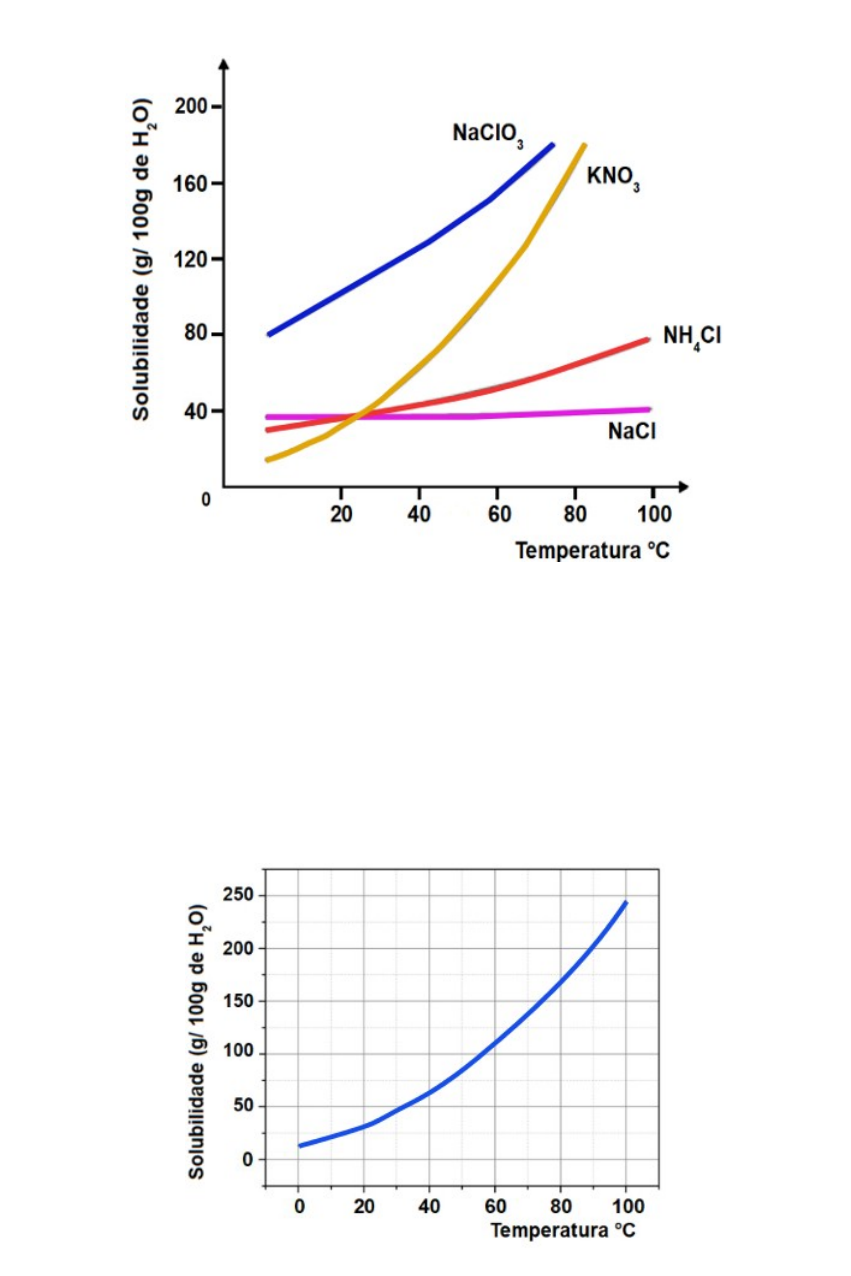 LISTA DE EXERCÍCIOS 1_2 1. O gráfico abaixo indica as curvas de solubilidade de quatro diferentes sais: Qual destes sais apresenta maior solubilidade a 40oC? a) NaClO3 b) KNO3 c) NH4Cl d) NaCl 2. A curva de solubilidade da substância KNO3 dissolvida em 100 g de água em função da temperatura é mostrada abaixo. Se tivermos 40g de água a 50o C, qual será a massa de KNO3 dissolvida? a) 28 g b) 56 g c) 33,6 g d) 45 g 3. Seis soluções aquosas de nitrato de sódio (NaNO3), numeradas de I a VI, foram preparadas em diferentes temperaturas dissolvendo-se diferentes massas de NaNO3 em 100 g de água. Em alguns casos, o NaNO3 não se dissolveu completamente. Este gráfico representa a curva de solubilidade de NaNO3 em função da temperatura. Os seis pontos correspondem aos sistemas preparados: A partir da análise desse gráfico, é CORRETO afirmar que os dois sistemas em que há precipitado são: a) I e II b) I e III c) IV e V d) V e VI 3. Observe o gráfico abaixo e analise as afirmações de I a IV. I- Se acrescentamos 250 g de NH4NO3 a 50g de água a 60°C, obteremos uma solução saturada com corpo de chão. II- A dissolução do NH4NO3 e do Nal em água ocorre com liberação e absorção de calor, respectivamente. III- A 40°C, o Nal é mais solúvel que o NaBr e menos solúvel que o NH4NO3. IV- Quando uma solução aquosa saturada de NH4NO3, inicialmente preparada a 60°C, for resfriada a 10°C, obteremos uma solução insaturada. Está correto apenas o que se afirma em: a) I e II b) I e III c) I e IV d) II e III e) III e IV 5. Considere o seguinte gráfico referente ao coeficiente de solubilidade de KNO3 em água em função da temperatura: Coeficiente de solubilidade de KNO3 em água em função da temperatura Ao adicionar, num recipiente, 40 g de nitrato de potássio em 50 g de água à temperatura de 40 ºC, pode-se afirmar: a) Apenas parte do sólido se dissolverá, permanecendo aproximadamente 20 g no fundo do recipiente. b) Apenas parte do sólido se dissolverá, permanecendo aproximadamente 10 g no fundo do recipiente. c) Tem-se uma solução insaturada. d) O resfriamento dessa solução não variará a quantidade de sólido dissolvido. e) O aquecimento dessa solução, num sistema aberto, não modificará a quantidade de nitrato de potássio dissolvido.