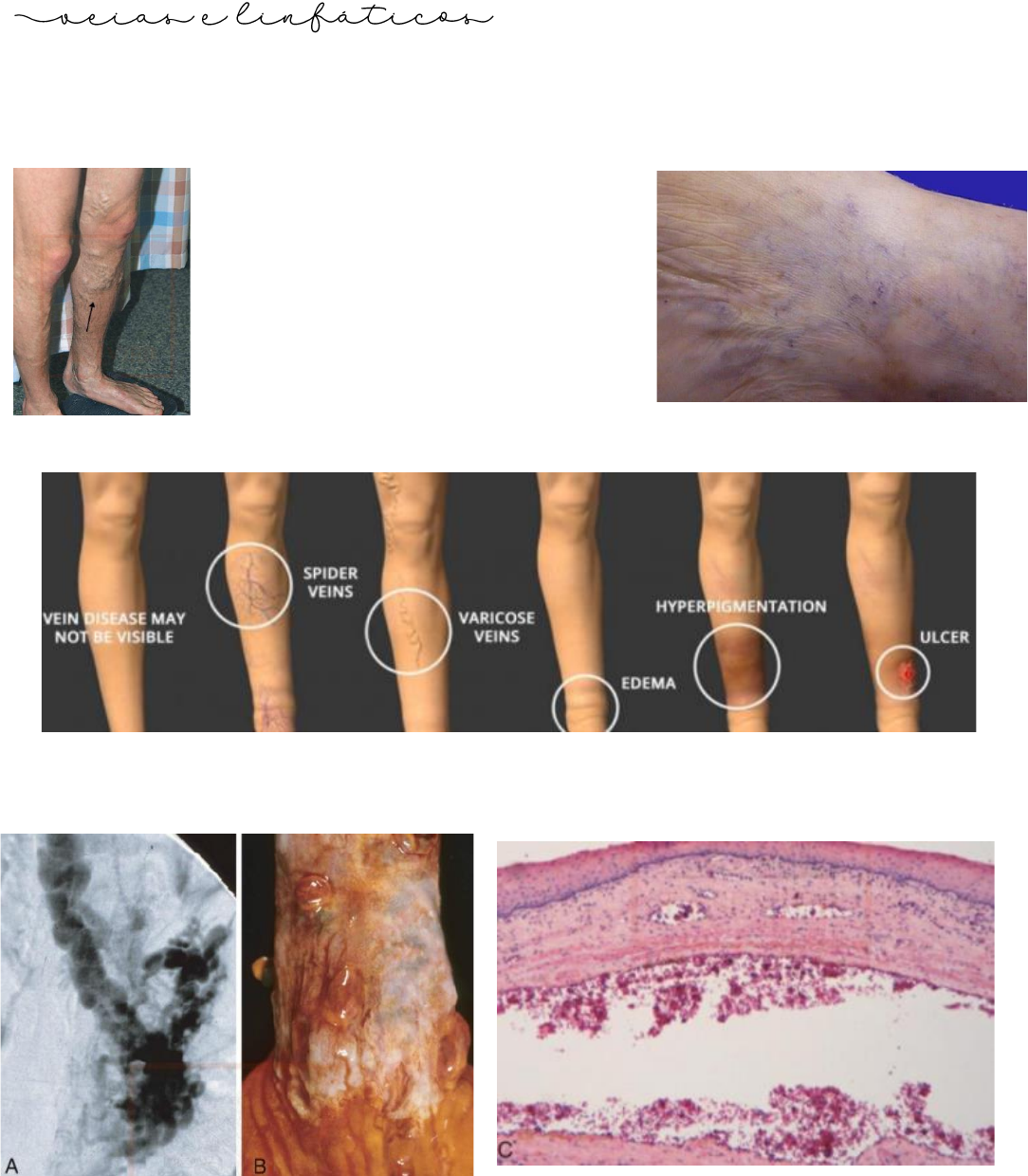 Patologia do Sistema Cardiovascular Pamela Barbieri – T23 – FMBM Profª Dra. Cristiane Tefé ▪Veias varicosas ▪Tromboflebite ▪Linfangite ▪Linfedema ✓ Veias varicosas: são veias superficiais das pernas anormalmente dilatadas. Características: ▪São dilatadas e tortuosas; ▪Produzidas por pressão intraluminal. ▪Veias superficiais dos membros inferiores e superiores. ▪Mulheres são mais acometidas. Fatores de risco: obesidade, gravidez, tendência familiar. Estase, congestão, edema, dor, trombose. ▪Varizes de esôfago: Cirrose hepática (consequências clínicas da hipertensão portal) Também pode causar hemorroida. A hipertensão porta aumenta o fluxo sanguíneo para as veias da junção gastroesofágica. Hemorroidas: dilatação do plexo venoso na junção anorretal pela hipertensão portal. ✓ Tromboflebite/flebotrombose: ▪Inflamação venosa com formação de trombose. ▪90% dos casos ocorrem nas veias profundas da perna. ▪Infecções Patologia do Sistema Cardiovascular Pamela Barbieri – T23 – FMBM Profª Dra. Cristiane Tefé ▪TVP: imobilização prolongada com diminuição do fluxo sanguíneo que pode levar a uma TVP. ▪Hipercoagulabilidade sistêmica: estimulam pró-coagulante. ▪Câncer com formação de glândulas liberam fatores pró-coagulantes. Células inflamatórias, oclusão, trombo. ✓ Linfangite: ▪Inflamação aguda por infecções bacterianas que se propagam pelos linfáticos. ▪Geralmente causa pelos estreptococos beta hemoliticos. ▪Os vasos linfáticso ficam dilatados e cheios de neutrófilos e monócitos. Clínica: estrias subcutâneas dolorosas e linfadenite aguda. Dependendo da resposta do hospedeiro e tipo de bactéria, pode resultar em sepse. ✓ Linfedema ▪Ocorre quando a linfa corporal se acumula nos tecidos moles do corpo, habitualmente no braço ou na perna. Secundário: -Tumores malignos – obstrução dos linfáticos ou linfonodos. -Procedimentos cirúrgicos que removam os linfonodos. -Fibrose pós irradiação -Trombose pós-inflamatória e formação de cicatriz.