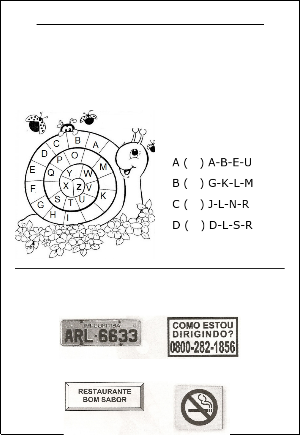 AVALIAÇÃO DIAGNÓSTICA 2º ANO 3º BIMESTRE Nome: ________________________________________ Professora: _____________________________________ _____________________________________________ Questão 1 (D1) Observe o desenho ao lado e marque com x o quadrinho das letras que estão faltando no caracol. Questão 2 – (D2) - Marque com um (X) o quadrinho que aparece somente letras: a) ( ) b) ( ) c) ( ) D) ( ) Questão 3 – (D3) Observe a lista de convidados ao lado. Os últimos nomes citados são (A) Valéria eWaldir. (B) Andressa e Walnei. (C) Vanessa e Walter. (D) Valesca e Wanderson. ( “ O queijo veio abaixo, claro, e a raposa abocanhou ligeiro aquela delícia, dizendo: - Olhe, meu senhor, estou vendo que voz o senhor tem.” )Questão 4 –– (D4) Leia o texto abaixo Transcreva o texto na letra cursiva: ________________________________________________________________________________________________________________________________________________________________________________________________________ ___________________________________________________________________________________________________ __________________________________________________ Questão 5 - (D5) – Risque o quadrinho que apresenta o número de sílabas da palavra cascão ( A – ( ) 1 B - ( ) 2 C - ( ) 3 D - ( ) 4 ) _____________________________________________ Questão 6 - (D6) – Risque o quadrinho da palavra que tem a sílaba do meio igual da palavra ÁRVORE: A – ( ) vovó B – ( ) couve C – ( ) pólvora D – ( ) polvo _____________________________________________ ( Cavalo de três pés Animal assombroso que aparece nas estradas desertas durante a noite, correndo, dando coices e voando. Não tem cabeça mas possui asas. Quem pisar em seus rastros será imensamente infeliz. Ricardo Azevedo. Meu livro de folclore. São Paulo, Ática, 2000. )Questão 7 - JTC(D7) – Leia o texto abaixo: Quantas palavras tem o texto? A – ( ) 30 B – ( ) 32 C – ( ) 31 D – ( ) 33 _____________________________________________ Questão 8 - (D8) – Faça um X onde está escrito o nome do desenho. A – ( ) leão. B – ( ) cachorro. C – ( ) raposa. D – ( ) onça Questão 9 (D9) – Leia o texto abaixo Questão 10 (D10) - Leia o texto abaixo A escolinha do Mar A escola de dona Ostra fica lá no fundo do mar. Nesta escola, as aulas são muito diferentes. O Dr. Camarão, por exemplo, dá aulas aos peixinhos menores: _ Um peixe inteligente presta atenção àquilo que come. Não come minhoca com anzol dentro. Nunca! O peixe elétrico ensina a fazer foguetes: _ Quando nosso foguete ficar pronto, vamos à terra. Os homens não vão à lua? E o maestro Villa-Peixes ensina aos alunos lindas canções: “Como pode o peixe vivo ver fora d’água fria...” De quem é a escolinha do Mar? A-( ) a dona Ostra B-( ) O doutor Camarão C-( ) O maestro D-( )do peixe elétrico Questão 11 (D11) Leia o texto abaixo e responda a questão abaixo: A girafa sem sono Naquela noite, enquanto todos os animais da floresta já estavam dormindo, a girafa andava pra lá e pra cá e não conseguia pegar no sono. _É falta de um bom travesseiro! Falou uma árvore que estava lá perto. _Mas eu tenho um sob medida para você. É só encostar sua cabeça no meio destes dois galhos e você dormirá sossegada até o dia amanhecer. Essa história se passa: A-( ) Á noite, na floresta B- ( ) Pela manhã, na floresta C-( ) À noite no zoológico D- ( ) Pela manhã _____________________________________________ Questão12 (D12) observe a tirinha e responda a questão: Esta tirinha faz leitura de qual conto de fadas? A - ( ) Rapunzel B - ( ) Cinderela C - ( ) Branca de Neve e os Sete Anões D – ( ) Chapeuzinho Vermelho Questão 13 – (D13) Leia o texto e marque a alternativa correta: ( ESCOLA GENTE QUE APRENDE FESTA DO DIA DAS CRIANÇAS DATA: SÁBADO, 11 DE OUTUBRO LOCAL: PÁTIO DA ESCOLA HORÁRIO: 15HS CRIANÇAS , PARTICIPEM ! A DIREÇÃO ) _____________________________________________ Questão 14 – (D14)- leia o texto POR QUE DORMIMOS? GENTE DORME, CACHORRO DORME, PASSARINHO DORME, ATÉ MOSCA DORME! ... MAS VOCÊ JÁ PAROU PRA SE PERGUNTAR POR QUÊ?! TODO MUNDO SABE POR EXPERIÊNCIA PRÓPRIA QUE AQUELAS OITO HORINHAS NOTURNAS DE SONO SÃO IMPORTANTES. DÁ PARA NÃO DORMIR UMA NOITE OU OUTRA, MAS AS CONSEQUÊNCIAS SÃO IMEDIATAS! Marque a letra que mostra sobre o que o texto fala. A – ( ) a noite. B)- ( ) Os passarinhos. C – ( ) O sono D) – ( ) Os cachorros. ( Brincando na rua Quando for soltar pipa ou brincar de outras coisas, fique longe das ruas. Você pode se distrair e não observar os veículos. Nunca brinque atrás ou embaixo de um carro, ônibus ou um caminhão parado . Na hora de sair, o motorista pode não ver você. Quando a bola cair na rua, não corra atrás dela. Peça para algum adulto ir pegá-la, ou observe antes os dois lados se vem algum carro. “A Caminho da Escola” ( Governo Federal/Ministério da Educação/CONTRAN )Questão 15 (D15) - Leia o texto abaixo. Questão 16 (D16)- Leia o texto abaixo: ( Cascão é um menino muito sujo, que não gosta nem um pouco de água, não toma banho e nem lava suas mãos. Ele, inclusive, se quer é tratado por seu nome pelos seus colegas nas estórias em quadrinho, é sempre chamado por seu apelido, devido à sua falta de higiene e asseio pessoal. ) Na frase “ Ele, inclusive, se quer é tratado por seu nome ...” a palavra grifada se refere a: A ( ) menino B( ) mãos C ( ) colegas D ( ) cascão _____________________________________________ Questão 17 (D17)- Observe a tirinha e responda: Onde está o humor: A – ( ) Cascão está cantando após se machucar B – ( ) Cebolinha socorreu o Cascão após se machucar C - ( ) O Cebolinha tapou os gritos de dor do Cascão D – ( ) Cebolinha ir embora e deixar o cascão machucado. Questão 18 (D18) - Leia o texto e marque a alternativa correta: Qual o trecho do texto apresenta o que Pedrinho disse? A - ( )Ninguém sabe, meu filho, ninguém 