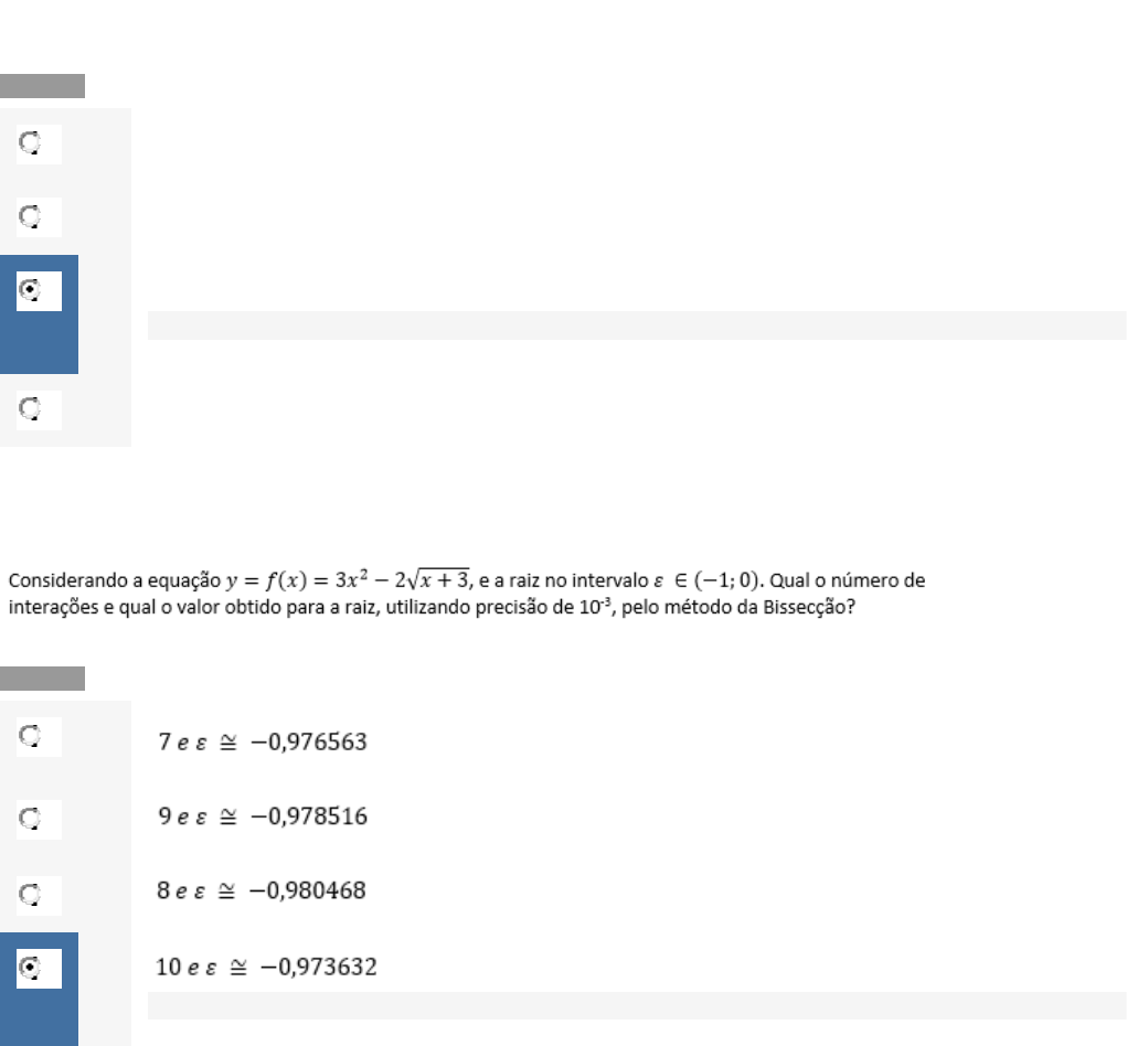 Questão 1/10 - Métodos Numéricos Aplicados Quais as condições para a regra 3/8 de Simpson ser utilizada? Nota: 10.0 A h= constante e n= par B h= constante e n= qualquer C h= constante e n= múltiplo de 3 Você acertou! D h= variável e n= qualquer Questão 2/10 - Métodos Numéricos Aplicados . Nota: 10.0 A B C D Você acertou! Questão 3/10 - Métodos Numéricos Aplicados Considerando os métodos de interpolação pode-se afirmar: Nota: 10.0 A A interpolação linear é a mais utilizada por ser uma técnica que utiliza todos os pontos da tabela de valores, sendo a maior precisão de resultados. B As regressões ou ajuste de curvas somente podem ser utilizadas para dados sem erros inerentes. C As formas de interpolação de Lagrange e de Newton resultam no mesmo polinômio interpolador que aquela obtida por interpolação polinomial. Você acertou! D Extrapolação somente pode ser usada para dados fora da tabela. Questão 4/10 - Métodos Numéricos Aplicados Considere a interpolação polinomial. Se o polinômio obtido com todos os pontos da tabela for de grau 5, quantos pontos (x,y) existem na tabela de valores. Nota: 10.0 A 6 pontos Você acertou! n+1 = 6 (quantidade de pontos) n=5 B 5 pontos C 4 pontos D 3 pontos Questão 5/10 - Métodos Numéricos Aplicados . Nota: 10.0 A 19,432754 B 16,538594 Você acertou! C 33,077188 D 21,354891 Questão 6/10 - Métodos Numéricos Aplicados Qual dos sistemas de equações pode ser resolvido pelo método de Gauss-Jacobi e de Gauss-Seidel. Nota: 10.0 A Somente I) Você acertou! B Somente II) C Os dois sistemas de equações. D Nenhum dos sistemas de equações. Questão 7/10 - Métodos Numéricos Aplicados Considerando que seja conhecida uma tabela com 8 valores para x (nós de integração), e da função nestes pontos. Qual(is) procedimento(s) para integração numérica NÃO poderia(m) ser utilizado(s) ? Nota: 10.0 A Método dos retângulos com altura centrada. B Regra 3/8 de Simpson. C Todas as técnicas podem ser aplicadas. D Método dos retângulos com altura centrada, e regra 3/8 de Simpson. Você acertou! Método de retângulos com altura centrada pois a altura não é tomada nos nós de integração, mas nos pontos médios do intervalo. Método 3/8 de Simpson, porque tem condição de n (quantidade de divisões) ser múltiplo de 3. Questão 8/10 - Métodos Numéricos Aplicados Quais as condições para a regra 1/3 de Simpson ser utilizada na integração numérica? Nota: 10.0 A h= constante e n= par Você acertou! B h= constante e n= qualquer C h= constante e n= múltiplo de 3 D h= variável e n= qualquer Questão 9/10 - Métodos Numéricos Aplicados . Nota: 10.0 A Você acertou! B C D Questão 10/10 - Métodos Numéricos Aplicados A tabela a seguir dá o desempenho de um torneiro para a produção de parafusos. Que tipo de curva você usaria para estes dados considerando o diagrama de dispersão? Nota: 10.0 A Regressão Linear Você acertou! B Regressão Quadrática C Regressão Exponencial D Regressão para uma equação cúbica