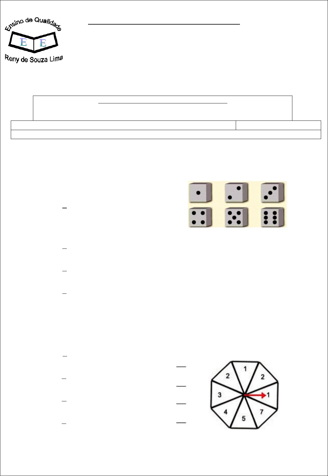 ESCOLA ESTADUAL RENY DE SOUZA LIMA Rua: Estefania Sales Sotero, S/N, Palmital Santa Luzia – Minas Gerais – Cep :33140-180 Tel: 3637-6222 Email: escola.10812@educacao.mg.gov.br PLANO DE ESTUDOS TUTORADOS III Nome: Turma: EJA 2 Disciplina: MATEMÁTICA Valor: 1. No lançamento de um dado, determine a probabilidade de se obter um número divisível por 2: a) b) c) d) 2. A roleta ilustrada a seguir não é tendenciosa. Fazendo o ponteiro girar nessa roleta, a probabilidade de sair um número PAR é: a) b) c) d) 3. Quantos anagramas podemos formar com a palavra AMOR que começam pela letra M. Fixando a letra M na segunda posição, sobram 3 letras para serem distribuídas nas 3 posições posteriores. a) 4 b) 5 c) 6 d) 8 4. A loja sorteará um brinde entre os compradores do produto A e outro brinde entre os compradores do produto B. Qual a probabilidade de que os dois sorteados tenham feito suas compras em fevereiro de 2012? a) b) c) d)