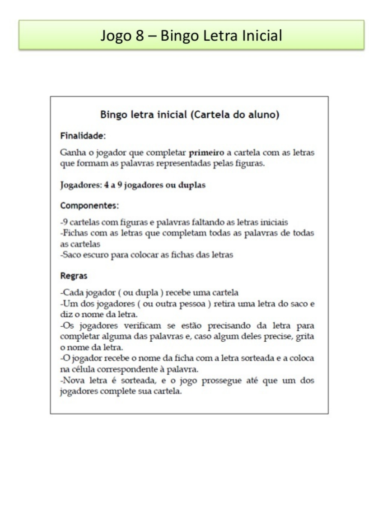 A professora do primeiro ano do Ensino Fundamental, entregou o jogo Bingo de letra Inicial para seus alunos. Qual o objetivo desse jogo? ...