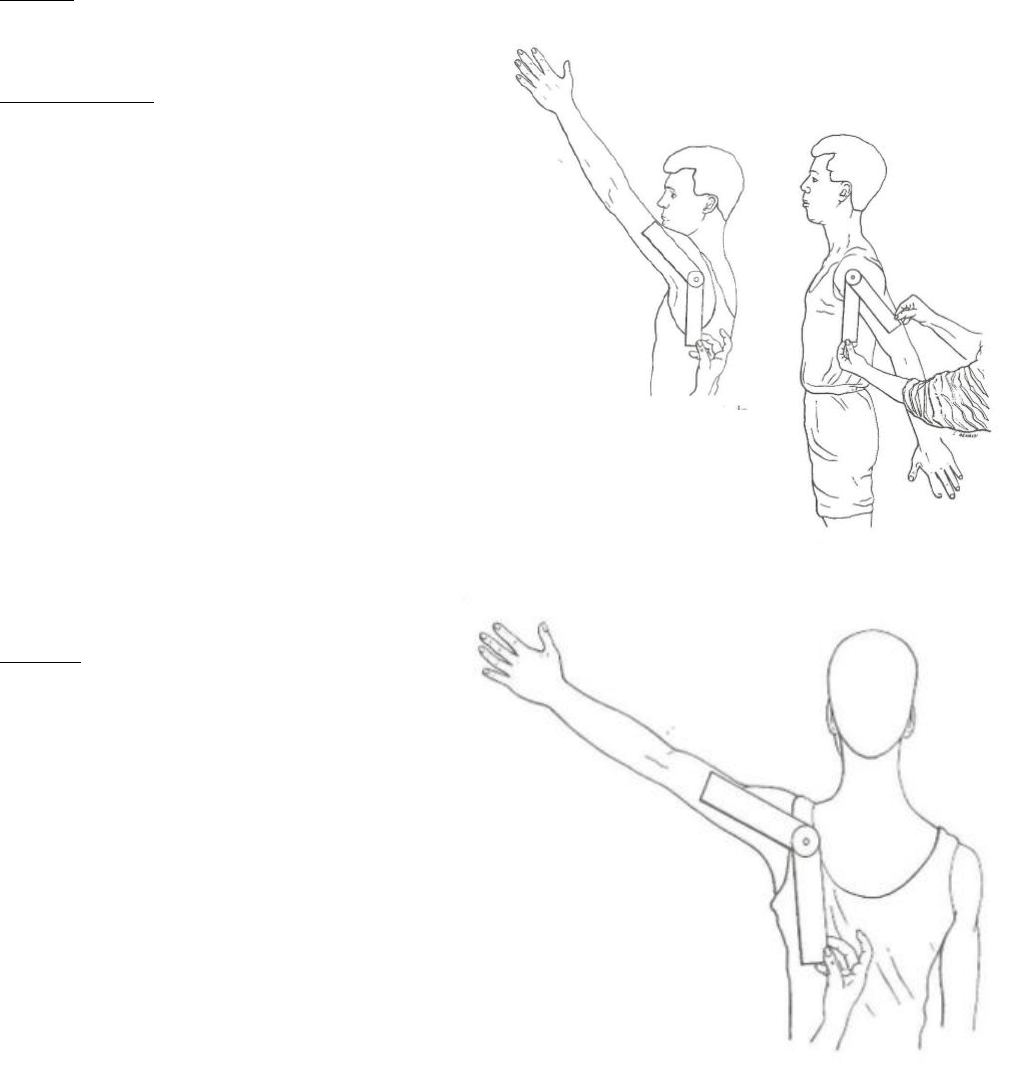 GONIOMETRIA DE MMSS OMBRO Flexão- Extensão Plano de movimento: Sagital Eixo: Latero-lateral Posição do paciente: sentado ou em pé, DD (Flexão), DV (extensão). Posição do membro: ao longo do corpo. Pivô do goniômetro: acrômio, lateralmente Haste fixa: linha axilar média. Haste móvel: acompanha o movimento do úmero dirigido para epicôndilo lateral. Limite do movimento Flexão: 0 a 180 graus Limite do movimento Extensão: 0 a 45 graus Abdução Plano de movimento: Frontal Eixo: ântero-posterior Posição do paciente: sentado ou em pé, de costas para o Fisioterapeuta. Posição do membro: ao longo do corpo. Pivô do goniômetro: acrômio, posteriormente. Haste fixa: paralela ao tronco, linha axilar posterior. Haste móvel: acompanha o movimento do úmero voltado para a região dorsal da mão. Limite do movimento: 0 a 180 graus Adução Plano de movimento: Transversal Eixo: longitudinal Posição do paciente: sentado ou em pé. Posição do membro: na frente do corpo, com apalma da mão voltada para baixo, numa flexão de 90 graus de ombros. Pivô do goniômetro: acrômio, superiormente. Haste fixa: paralela à linha mediana anterior. Haste móvel: acompanha o movimento do úmero, superfície lateral do úmero. Limite do movimento: 0 a 40 graus Rotação interna e externa Plano de movimento: sagital Eixo: látero-lateral. Posição do paciente: DD. Posição do membro: ombro abduzido a 90 graus, cotovelo fletido a 90 graus, úmero apoiado e cotovelo sobressaído da borda, palma da mão medial. Pivô do goniômetro: olécrano. Haste fixa: paralela ao solo Haste móvel: paralela ao eixo longitudinal da ulna, acompanhando o movimento. Limite do movimento: 0 a 90 graus COTOVELO Flexão- Extensão Plano de movimento: Sagital Eixo: Látero-lateral Posição do paciente: sentado, em pé, DD. Posição do membro: posição anatômica junto ao corpo. Pivô do goniômetro: epicôndilo lateral do úmero Haste fixa: paralela ao eixo longitudinal do úmero, dirigido para o acrômio. Haste móvel: paralela ao eixo longitudinal do rádio (processo estiloide), acompanha o movimeto. Limite do movimento Flexão: 0 a 145 graus Limite do movimento Extensão: 145 a 0 graus Prono-supinação Plano de movimento: Frontal Eixo: ântero-posterior Posição do paciente: sentado, em pé, DD. Posição do membro: ombro aduzido (braço junto ao corpo), cotovelo fletido a 90 graus, antebraço na posição neutra. Pivô do goniômetro: art. metacarpofalangeana do terceiro dedo. Haste fixa: superfície dorsal dos metacarpais, paralelo ao eixo longitudinal do úmero. Haste móvel: paralelo ao eixo do lápis ou do polegar. Limite do movimento: 0 a 90 graus PUNHO Flexão- Extensão Plano de movimento: Sagital Eixo: Látero-lateral Posição do paciente: sentado ou em bipedestação. Posição do membro: ombro aduzido (braço junto ao corpo), cotovelo fletido a 90 graus, antebraço em pronação, dedos estendidos. Pivô do goniômetro: superfície medial do punho. Haste fixa: paralela à face medial da ulna. Haste móvel: paralela ao eixo longitudinal do quinto metacarpo), acompanha o movimento. Limite do movimento Flexão: 0 a 90 graus Limite do movimento Extensão: 0 a 70 graus. Desvio Radial e Ulnar Plano de movimento: Sagital Eixo: Látero-lateral Posição do paciente: sentado ou em bipedestação. Posição do membro: ombro aduzido (braço junto ao corpo), cotovelo fletido a 90 graus, antebraço neutro, dedos estendidos. Evitar flexão e extensão de punho, evitar supinação e pronação do antebraço. Pivô do goniômetro: superfície central do punho- art, radiocarpal. Haste fixa: paralela à face medial da ulna. Haste móvel: paralela ao eixo longitudinal do quinto metacarpo, acompanha o movimento. Limite do movimento Abdução (desvio radial): 0 a 20 graus Limite do movimento Adução (desvio ulnar): 0 a 45 graus