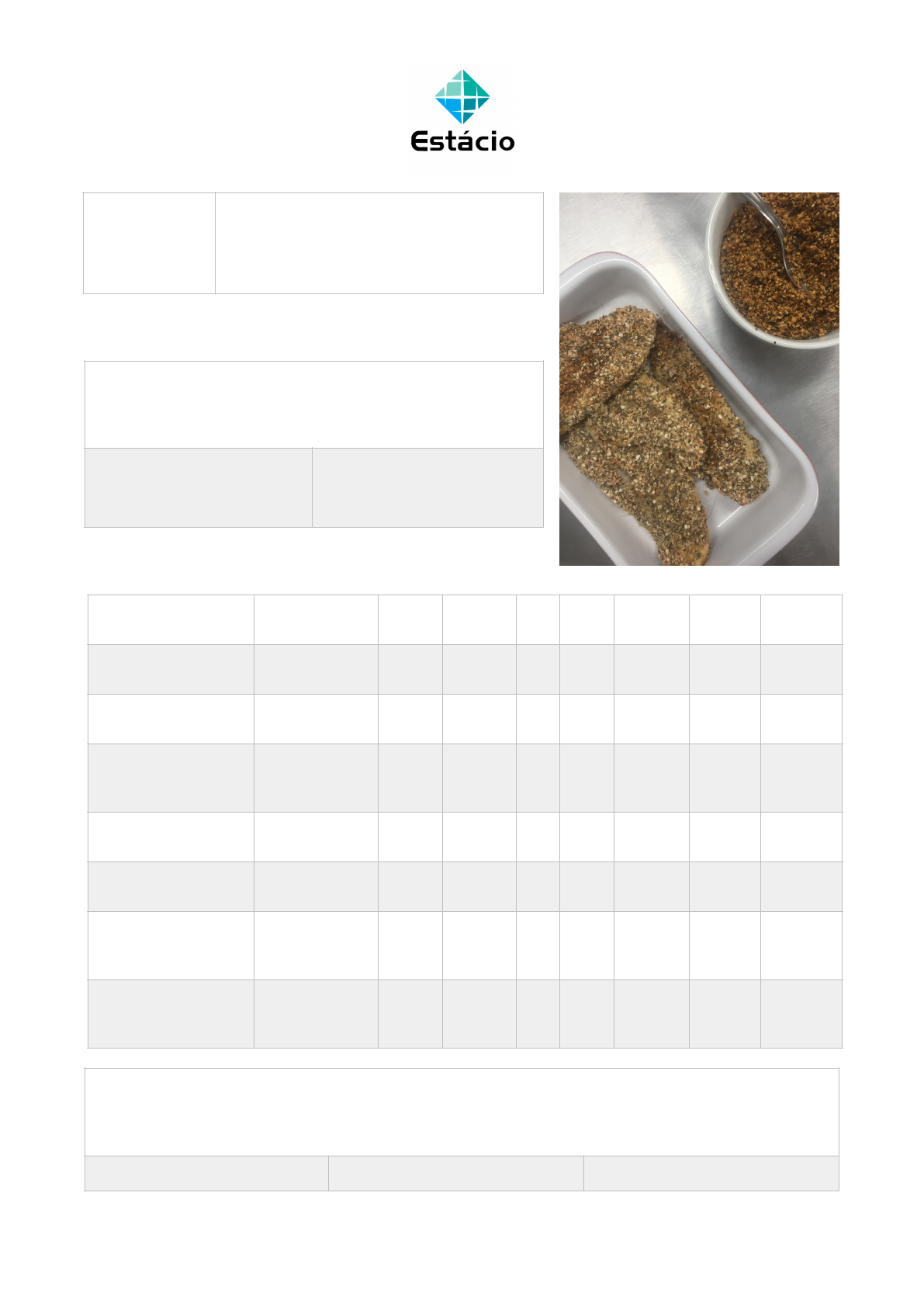 Total de calorias: 1578kcal Total de calorias por porção: 225,38kcal Carboidrato total: 105,82 Proteína total: 197,79 Lipídeo total: 37,64 Integrantes: Camila Coelho, Gabriela Ferreira e Vitória Teixeira. Ingredientes: Quantidade: PB PL FC IR CHO PTN LIP Filé de pescada 7 filés 625g 625g 1 - 0 156,25 0 Gergelim 1/4 xícara 32,5g 32,5g 1 - 7,02 6,89 16,38 Chia 1/4 xícara 35g 35g 1 - 15,4 6,02 11,48 Amaranto em flocos 3/4 xícara 73g 73g 1 - 47,04 9,89 5,02 Quinua em floco 3/4 xícara 49g 49g 1 - 35,53 6,37 2,57 Clara de ovo 2 unidades 113,5g 113,5g 1 - 0,83 12,37 0,19 Azeite 1 colher chá 4,5g 4,5g 1 - 0 0 2 Nome da preparação: Peixe empanado Tempo de preparo: 1 hora Peso da porção: Total: 605g Porção: 86,42g cada Nº de porções: 7 porções Modo de preparo: Tempere o peixe e deixe marinar por alguns minutos. Enquanto isso pegue um assadeira, forre com alumínio e unte com o azeite e preaqueça o forno 250ºC. Em um recipiente grande misture todos os grãos e flocos. Bata com um garfo ou fouet levemente duas claras e reserve. Passe os filés de pescada nas claras batidas e depois na misturas dos grãos e flocos. Espalhe os peixes sobre a assadeira untada. Feito isso em todos os filés, leve pra assar de 15 à 30 minutos. Utensílios: Quantidade: Ramequin 1 Bowl 2 Assadeira grande 1 Pão duro 1 Xícara 1 Colher de chá 1 Alumínio 1 Balança 1 Prato 1 Garfo 1