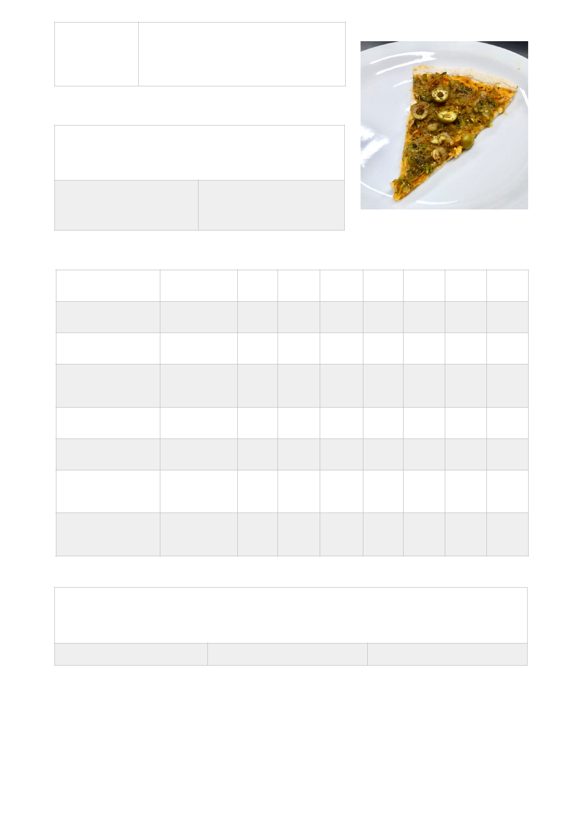 Total de calorias: 866,16kcal Total de calorias por porção: 101,22kcal Carboidratos total: 745,72 Proteína total: 120,44 Lipídeo total: 48,33 Integrantes: Gabriela Ferreira, Vitória Teixeira. Ingredientes: Quantidade: PB PL FC IR CHO PTN LIP Farinha de trigo 125g 125g - 1 - 93,88 12,25 1,75 Farinha de trigo integral 125g 125g - 1 - 90,75 17,13 2,35 Fermento biológico seco 1/5 pacote 5g - 1 - 0,4 0,73 0,08 Azeite 1 colher sopa 11,9g 11,9g 1 - - - 1,19 Água 1/2 copo 125g 125g 1 - - - - Sal 1/2 colher sobremesa 1,5g - 1 - - - - Açúcar 1/2 colher sobremesa 1,5g - 1 - 1,4 - - Nome da preparação: Massa de pizza Tempo de preparo: 1:50 Peso da porção: Total: 835g Fatia: 105g Nº de porções: 8 fatias aproximadamente Modo de preparo: Em um bowl misturar a farinha com o sal. Juntar o fermento aos ingredientes secos. Amornar a água é colocar aos poucos ela e o azeite à mistura dos secos. Ao atingir o ponto ideal, que é quando a massa não olhar mais nos dedos sovar de 5 - 10 minuto até ficar macia. Polvilhar farinha, cobrir com um pano e deixar crescer por 1 hora. Passado o tempo de descanso abrir a massa com o auxílio de um rolo, colocar na forma e levar ao forno pré-aquecido a 180C por 10 minutos. Rechear a gosto e levar ao forno novamente para aquecer os demais ingredientes. Utensílios: Quantidade: Ramequin 4 Bowl 2 Assadeira de pizza 1 Pão duro 1 Copo medidor 1 Colher de sobremesa 1 Colher de sopa 1 Balança 1 Prato 1 Cortado de pizza 1