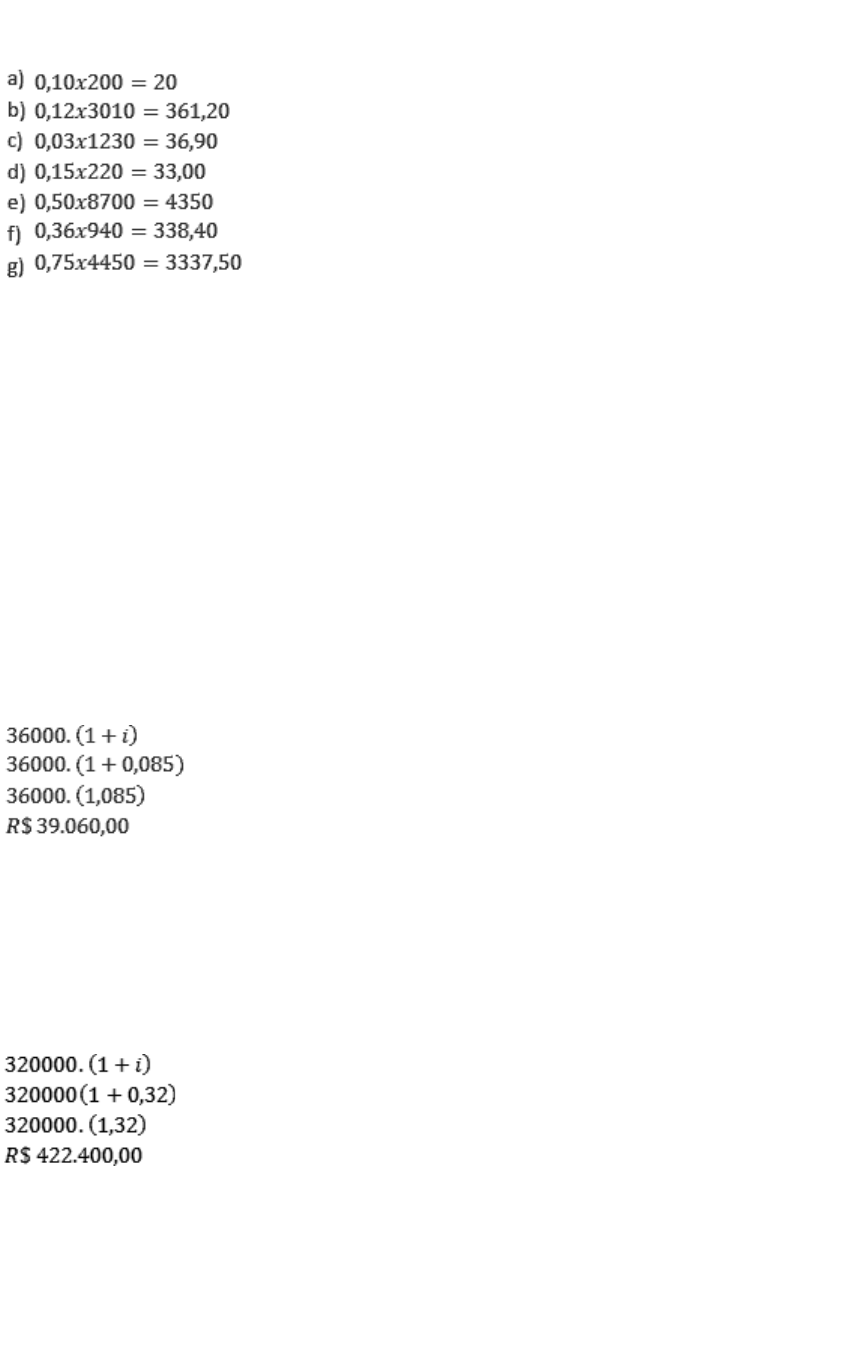 Exercício 01 – Calcule as porcentagens abaixo: a) 10% de 200 b) 12% de 3010 c) 3% de 1230 d) 15% de 220 e) 50% de 8700 f) 36% de 940 g) 75% de 4450 Exercício 02 – Um veículo custava R$ 36.000,00 e valorizou 8,5%. Qual o preço atual desse veículo? Exercício 03 – Um imóvel valorizou 32% nos últimos anos. Sabendo que antes da valorização o imóvel valia R$ 320.000,00, calcule o valor atual desse imóvel. Exercício 04 – Um smartphone custava R$ 5.630,00 no dia do lançamento. Um tempo depois, o preço teve uma redução de 32%. Qual o preço atual desse smartphone? Exercício 05 – Um investidor comprou ações de uma empresa a R$ 19,80. Com o baixo desempenho da empresa, o valor de suas ações teve redução de 15%. Qual o valor das ações? Exercício 06 – Um computador custava R$ 12.778,00. Após o lançamento de um modelo novo, o preço caiu para R$ 9.990,00. Qual foi a redução em porcentagem? Exercício 07 – Alberto pagou R$ 13.600,00 por um lote de ações. Alguns meses depois, devido a dificuldades financeiras, vendeu o lote de ações por R$ 10.200,00. Calcule a porcentagem de perda. Exercício 08 – Joaninha pegou R$ 3.800,00 emprestado com sua mãe, para pagar com juros simples de 0,95%a.m. Sabendo que foram 24 prestações mensais, calcule o valor dos juros pagos. Exercício 09 – Um empréstimo de R$75.900,00 será pago em 36 prestações, com juros simples 2,5%a.m.Calcule os juros pagos na quitação do empréstimo. Exercício 10 – Um comerciante foi ao banco e pegou um empréstimo de R$ 66.480,00 a taxa de juros compostos de 2,88%a.m. Sabendo que foram 48 prestações, calcule o valor dos juros pagos. Exercício 11 – Para iniciar um negócio, um empreendedor captou R$350.730,00 através de um empréstimo que deverá ser pago em 28 prestações mensais. A taxa de juros da operação é de 2,49%a.m. Calcule os juros compostos pagos no final do empréstimo. Questão 1 (PM PI – Nucepe). Uma empresa de cosmético possui R$ 80.000,00. Ela aplica 30% desse dinheiro em um investimento que rende juros simples a uma taxa de 3% ao mês, durante 2 meses; e aplica o restante em outro investimento que rende 2% ao mês durante 2 meses também. Ao fim desse período, esse investidor possui: a) R$ 83.000,00 b) R$ 84.300,00 c) R$ 85.200,00 d) R$ 86.300,00 e) R$ 83.680,00 Resolução 80000 . 30% = 80000.30/100 = 2400000/100 = 24000 Vamos calcular cada uma das aplicações: * 24000 a 3% durante 2 meses: 24000.3% = 24000.3/100 = 72000/100 = 720 Em dois meses: 2.720 = 1440 * 56000 a 2% durante 2 meses: 56000.2% = 56000.2/100 = 112000/100 = 1120 Em dois meses: 2.1120 = 2240 Total de juros: 1440 + 2240 = 3680 Resposta: 80000 + 3680 = 83680,00 Resposta: E Questão 2 (BB – Cesgranrio). João tomou um empréstimo de R$ 900,00 a juros compostos de 10% ao mês. Dois meses depois, João pagou R$ 600,00 e, um mês após esse pagamento, liquidou o empréstimo. O valor desse último pagamento foi, em reais, aproximadamente, (A) 240,00 (B) 330,00 (C) 429,00 (D) 489,00 (E) 538,00 Resolução A forma de resolução é igual a questão 17: 900 = 600/1,1² + x/1,1³ 900 = 600/1,21 + x/1,331 900 = 495,87 + x/1,331 900 – 495,87 = x/1331 404,13 = x/1,331 x = 404,13.1,331 x = 537,9 Obs: A resposta não foi exata pois utilizamos valores aproximados para as potências. Resposta: E Questão 3 (BB – Cesgranrio). Considere um financiamento de R$ 100.000,00, sem entrada, a ser pago em 100 prestações mensais, pelo Sistema de Amortização Constante (SAC). Sabendo-se que a taxa de juros, no regime de juros compostos, é de 1% ao mês, a prestação inicial, se o prazo de pagamento for duplicado, será reduzida em (A) 100%. (B) 50%. (C) 25%. (D) 10%. (E) 5%. Resolução Sabendo que no Sistema de Amortização Constante a parcela é composta por capital e juros, da seguinte forma: 1) O capital é sempre igual, e é calculado dividindo o valor total pela quantidade de parcelas; 2) Em cada parcela o tomador paga os juros sobre todo o saldo devedor. Vamos ao caso: R$ 100.000,00, 1%, 100 prestações O capital será de 100000/100 = 1000,00 Os juros da primeira parcela será 1% de 100.000,00 que é 1000,00 Total: 2000,00 Se o prazo for duplicado: R$ 100.000,00, 1%, 200 prestações O capital será de 100000/200 = 500,00 Os juros da primeira parcela será 1% de 100.000,00 que é 1000,00 Total: 1500,00 Nota-se que a redução seria de 500,00. Vamos calcular a porcentagem: 500/2000 = 5/20 = 1/4 = 0,25 = 25% Resposta: C Questão 4 (Caixa – Cesgranrio). Um projeto de investimento, cujo aporte de capital inicial é de R$ 20.000,00, irá gerar, após um período, retorno de R$ 35.000,00. A Taxa Interna de Retorno (TIR) desse investimento é (A) 34% (B) 43% (C) 75% (D) 175% (E) 275% Resolução A TIR é a taxa de juros desta aplicação. Os juros da aplicação foram de R$ 15.000,00. Calculando a porcentagem: i = juros / capital = 15.000 / 20.000 = 0,75 = 75%. Resposta: C