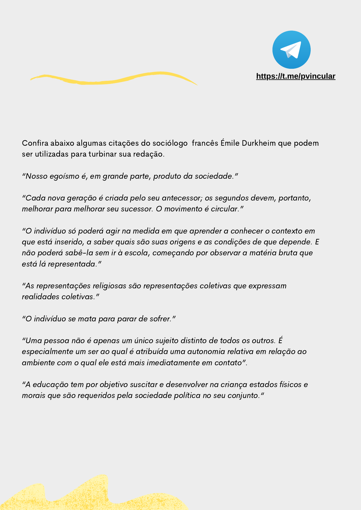 CITAÇÕES DE ÉMILE DURKHEIM Confira abaixo algumas citações do sociólogo francês Émile Durkheim que podem ser utilizadas para turbinar sua redação. ⠀ “Nosso egoísmo é, em grande parte, produto da sociedade.” ⠀ “Cada nova geração é criada pelo seu antecessor; os segundos devem, portanto, melhorar para melhorar seu sucessor. O movimento é circular.” ⠀ “O indivíduo só poderá agir na medida em que aprender a conhecer o contexto em que está inserido, a saber quais são suas origens e as condições de que depende. E não poderá sabê-la sem ir à escola, começando por observar a matéria bruta que está lá representada.” ⠀ “As representações religiosas são representações coletivas que expressam realidades coletivas.” ⠀ “O indivíduo se mata para parar de sofrer.” ⠀ “Uma pessoa não é apenas um único sujeito distinto de todos os outros. É especialmente um ser ao qual é atribuída uma autonomia relativa em relação ao ambiente com o qual ele está mais imediatamente em contato”. “A educação tem por objetivo suscitar e desenvolver na criança estados físicos e morais que são requeridos pela sociedade política no seu conjunto.“ https://t.me/pvincular https://t.me/pvincular
