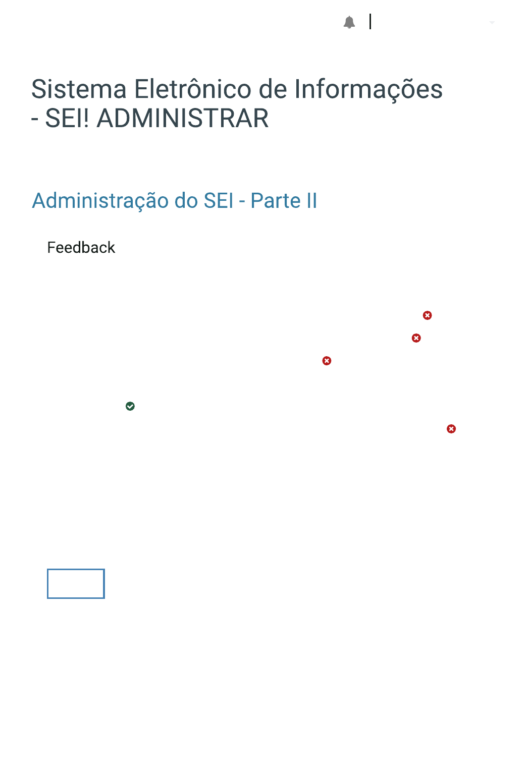Painel / Meus cursos / Sistema Eletrônico de Informações - SEI! ADMINISTRAR / Administração do SEI - Parte II Considerando a funcionalidade “Assinaturas das Unidades”, assinale a alternativa correta. a. Algumas operações não estão disponíveis para o histórico resumido. b. O administrador pode cadastrar novas operações para o histórico. c. Os tipos de histórico são: resumido e detalhado. d. As mesmas operações estão disponíveis na seleção de qualquer tipo de histórico. e. O sistema possui três tipos de histórico: resumido, completo e detalhado. Conforme explicado no material teórico, há dois tipos de histórico: o completo e o resumido. As mesmas operações estão disponíveis para ambos, cabendo ao administrador definir quantas e quais operações são exibidas em cada tipo. Avançar Progresso na lição: 41% JOANA MARIA DA SILVA☰ sei_administrar | - Turma AGO/2020: Administração do SEI - Parte II:... https://mooc.escolavirtual.gov.br/mod/lesson/view.php 1 of 2 27/08/2020 16:11 Seguindo as tendências educacionais mais recentes, a Escola Virtual.Gov oferece uma plataforma MOOC que sustenta a oferta de cursos de curta e média duração, abertos e gratuitos, como alternativa de formação mais aderente ao desenvolvimento rápido de competências para o trabalho. Catálogo de Cursos Catálogo de Programas Conheça a Escola Adesão Institucional Instituições Participantes Política de Privacidade Validação de Documentos Perguntas Frequentes CatálogoÁrea do aluno Organizado por Escola Nacional de Administração Pública – Enap Português - Brasil (pt_br) JOANA MARIA DA SILVA☰ sei_administrar | - Turma AGO/2020: Administração do SEI - Parte II:... https://mooc.escolavirtual.gov.br/mod/lesson/view.php 2 of 2 27/08/2020 16:11