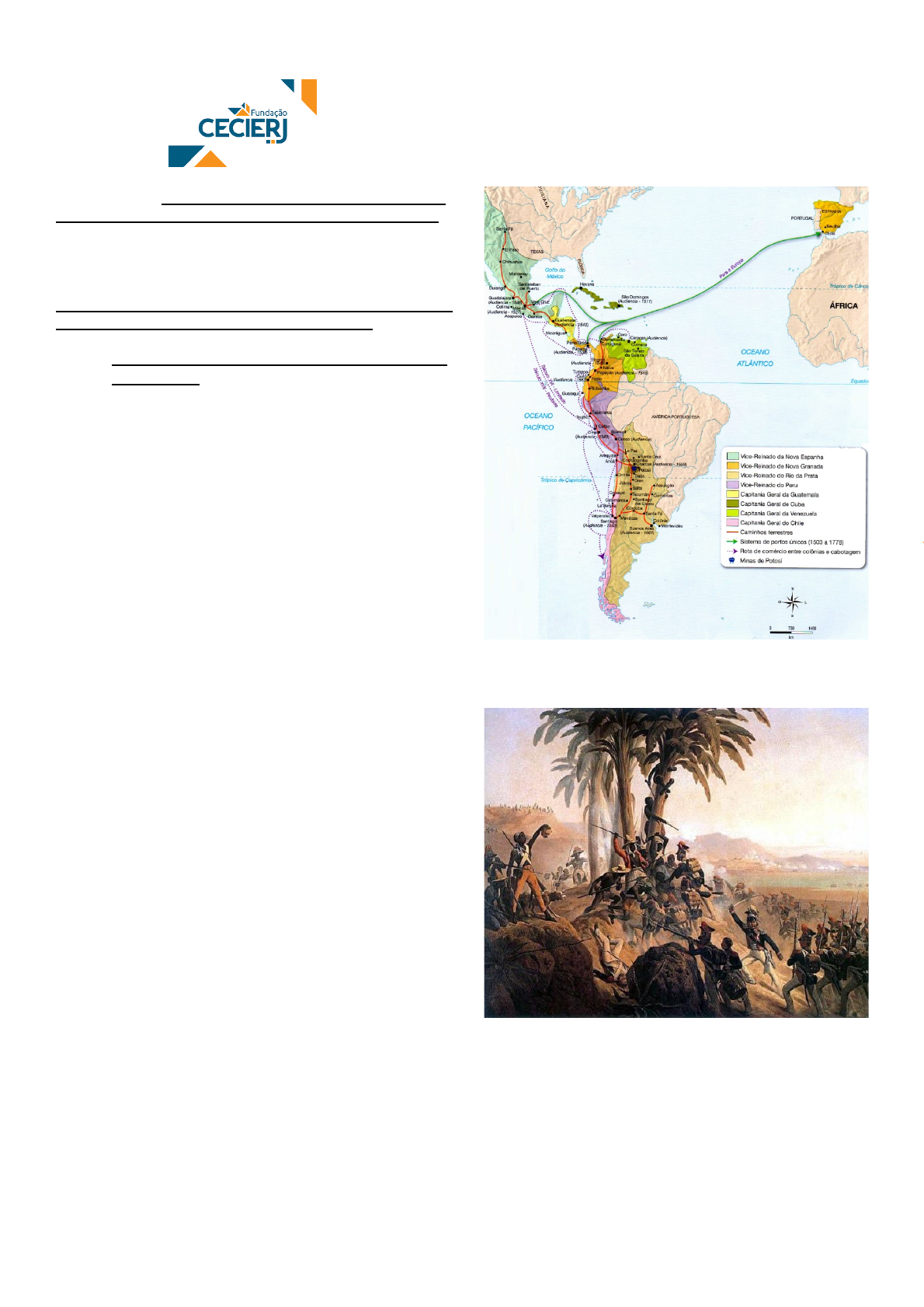 PRÉ VESTIBULA 1 Título da aula: AS INDEPENDÊNCIAS NA AMÉRICA: O HAITI (1804) E A AMÉRICA ESPANHOLA (1815-30) Vídeo aula nº.: 21 Capítulo da apostila: 9 (páginas 99 à 102). Mediadoras responsáveis: Isabel Tomaz e Ronnie Curty. AS INDEPENDÊNCIAS NA AMÉRICA: O HAITI (1804) E A AMÉRICA ESPANHOLA (1815-30) 1. Contexto histórico da América entre os séculos XVIII e XIX. Tornar-se independente significa romper com uma relação de obediência e de dependência. No caso da América, isso significava abandonar a condição de colônia para transformar-se num Estado autônomo. Foram muitos os motivos que influenciaram os colonos a lutarem por sua autonomia, como a difusão dos ideais liberais e iluministas vindos da Europa e as insatisfações com o domínio metropolitano. No entanto, é importante notar que as motivações desses movimentos também vieram a partir de condições, ações, ideias e acontecimentos locais, ou seja, ocorridos no próprio continente americano. Isto significa dizer que os moradores da América Espanhola e do Haiti não estavam parados no tempo e no espaço esperando alguma influência externa para despertarem sua vontade de independência. Um importante evento local que sinalizava as tensões existentes na América Espanhola foi a Revolta de Tupac Amaru II, ocorrida em 1780. Esta revolta foi liderada pelo Curaca Tupac Amaru II, descendente de antigos imperadores Incas. O movimento lutou pela autonomia da região do Peru e contra os maus tratos e explorações que os povos indígenas da região sofriam. Vale pontuar que uma das principais características do território colonial espanhol nas américas, dada a sua imensa extensão, era a sua diversidade de situações políticas e econômicas locais e a heterogeneidade na formação étnico-racial das populações. Visto que em algumas regiões a população indígena e de seus descendentes era predominante enquanto que em outras regiões já havia significativa presença de negros africanos, entre eles, escravizados e libertos. Tendo, também, casos onde ambas as presenças eram significativas. Outros episódios que influenciaram as ações dos colonos espanhóis foram Independência dos Estados Unidos da América (1776), ocorrida ao norte do continente americano, e a Revolução Francesa, entre 1789 e 1798. Para visualizar a localização dos domínios espanhóis e suas divisões administrativas antes da independência, observe o mapa a seguir: VICENTINO, Cláudio. Atlas histórico: geral e Brasil. São Paulo: Scipione, 2011.p. 95. 2. A INDEPENDÊNCIA DO HAITI (1791 - 1804) Batalha de São Domingos, January Suchodolski. Óleo sobre tela, 1845. A imagem retrata as batalhas entre as tropas revolucionárias haitianas e os exércitos franceses que tentaram recolonizar e restabelecer a escravidão na ilha. O território que hoje chamamos de Haiti era, até a virada do século XVIII para o XIX, uma colônia francesa localizada em parte da Ilha de São Domingos. Durante o violento processo de colonização da ilha pelos espanhóis no século XVI, grande parte dos habitantes nativos foram dizimados. No século XVII, a ilha se dividiu em duas colônias: a PRÉ VESTIBULA 2 espanhola San Domingo e a francesa Saint Domingue. Ambas as metrópoles recorreram ao tráfico de africanos escravizados como forma de conseguir mão de obra para a plantation de cana de açúcar. Ao longo do século XVIII, os grandes senhores tiveram que conviver com dois tipos de pressão: a ação dos quilombolas, muito ativos na região, e a dos mestiços e libertos que lutavam por direitos políticos e igualdade civil. Segundo diversos estudos, como o do pesquisador brasileiro Fulvio Machado, até o século XIX, Saint Domingues era a principal colônia da França nas Américas, sendo a maior exportadora de cana-de-açúcar do mundo e a maior exportadora de café das Américas. Esta produtividade tinha como base a exploração da mão-de-obra de homens e mulheres negros - trabalhadores escravizados, libertos e livres que compunham aproximadamente 85% da população da colônia. Após muitas formas de resistências locais e cotidianas, estes homens e mulheres criaram uma esperança de liberdade graças à Revolução Francesa de 1789, que declarou os direitos de igualdade e liberdade como universais. Tomando para si esses ideias e dialogando com as ações dos revolucionários na metrópole, homens e mulheres livres, libertos e escravizados se organizaram no ano de 1791 num movimento pela liberdade, pela abolição da escravidão e contra a dominação francesa. É importante ressaltar que um dos principais elementos responsáveis pela união e integração dos movimentos negros em torno da uma luta pela liberdade e contra as opressões coloniais francesas, foi o Vodu. O Vodu é uma religião de matriz africana que se construiu no Haiti e que influenciou de maneira direta na formação e nos rumos da revolta. Foi, também, a partir de um grande culto em 1791 que a grande sacerdotisa Vodu, Cecíle Fatman conclamou os negros livres, libertos e escravizados a se unirem e assumirem um compromisso de lutar contra a escravidão, o que acabou sendo mais uma forte base para a eclosão da revolução haitiana ainda no mesmo ano de 1791. Logo, este movimento, liderado por Toussaint L’Ouverture, um homem negro liberto, atacou fortemente as fazendas e colonos brancos na ilha, gerando fugas dos colonos e uma reação armada. Em 1801, os revolucionários de Saint- Domingue chegaram a conquistar toda a ilha. Nesse mesmo ano, Napoleão Bonaparte enviou suas tropas para a América na tentativa de recolonizar a região e restabelecer a escravidão. Toussaint L’Ouverture acabou capturado pelos franceses, morrendo 2 anos depois numa prisão em Paris. No entanto, outra liderança negra, Jean Jacques Dessalines, reorganizou o exército revolucionário e conquistou a independência da colônia francesa em 1804, a batizando com o nome indígena Haiti. A conquis